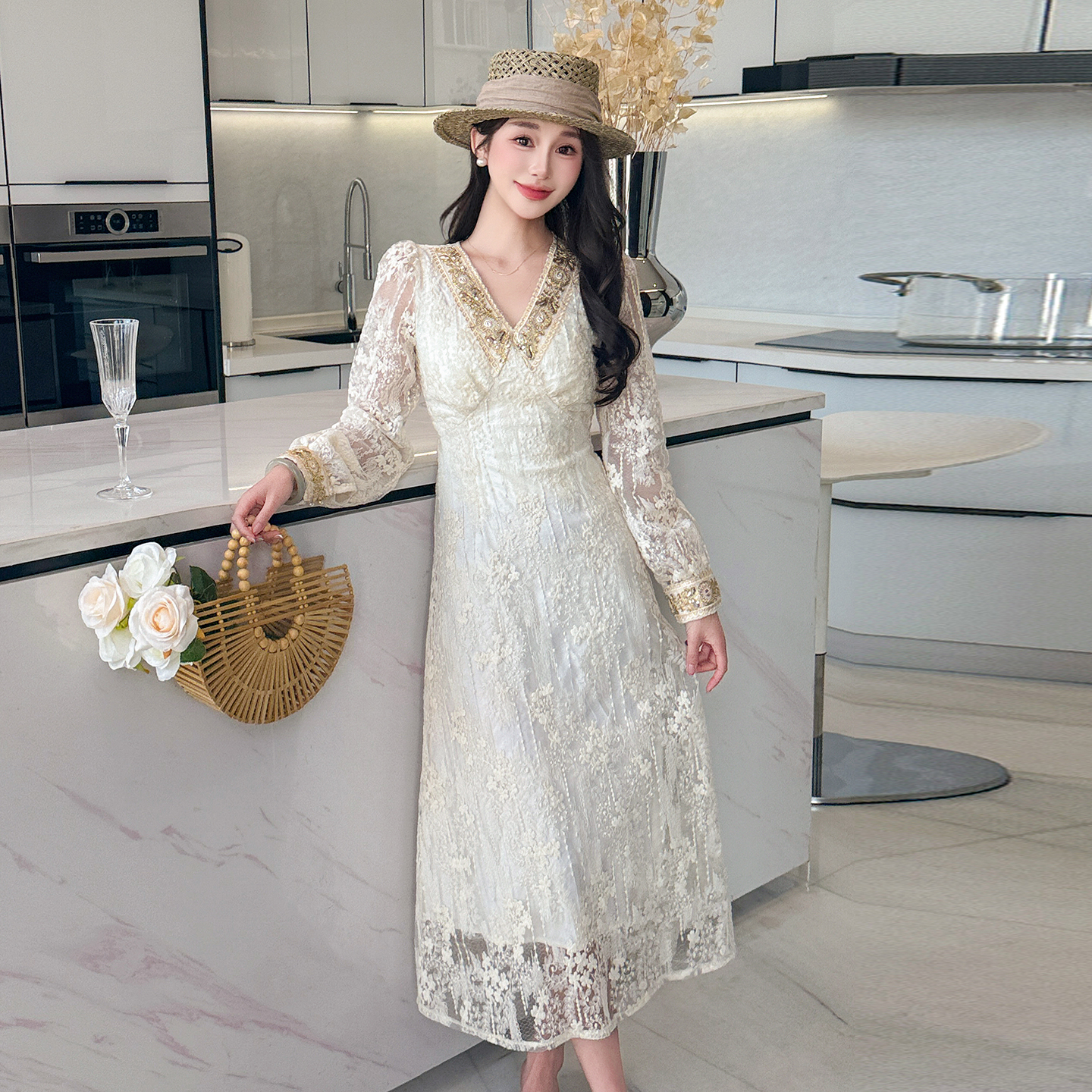 BY14574# 春夏刺绣V领蕾丝法式气质甜美蕾丝连衣裙 服裝批發女裝批發服飾貨源