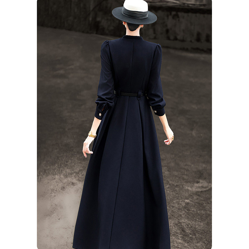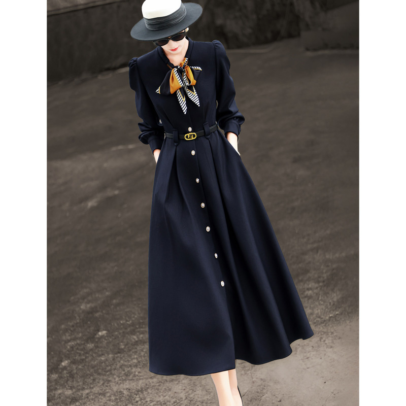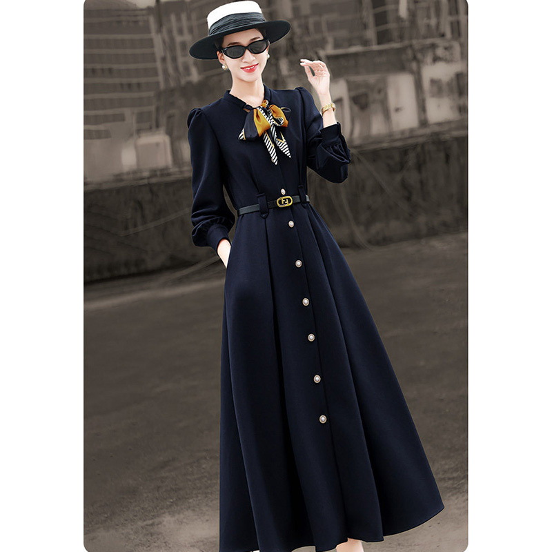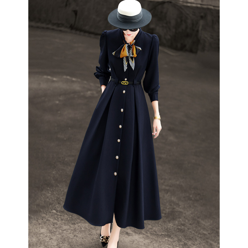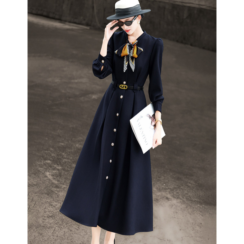 BY14661# 早春新款气质高级感通勤单排扣丝巾领长袖收腰连衣裙女 服裝批發女裝批發服飾貨源