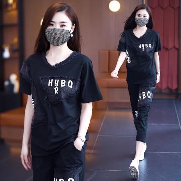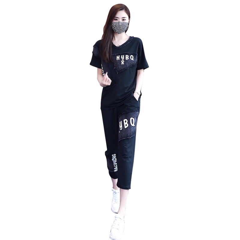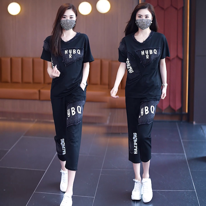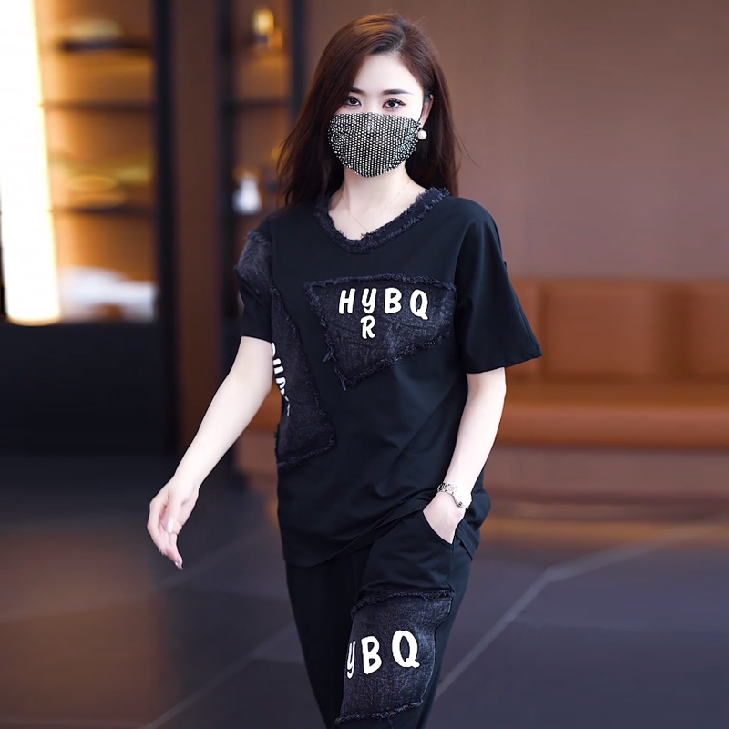 Home > 韩版套装 > BY14841# 夏季新款套装女宽松奥代尔拼接牛仔印花短袖两件套潮流大码女装 服裝批發女裝批發服飾貨源