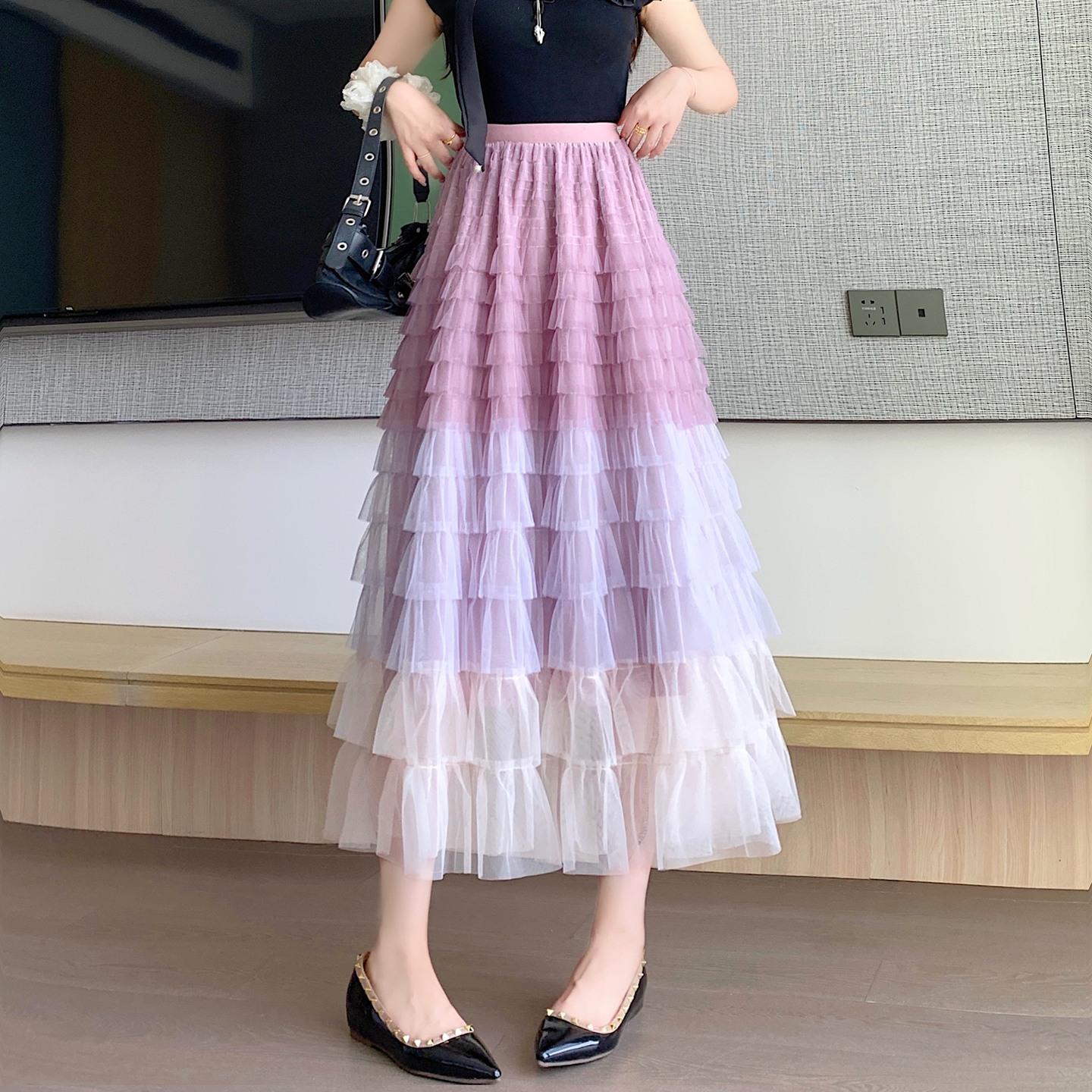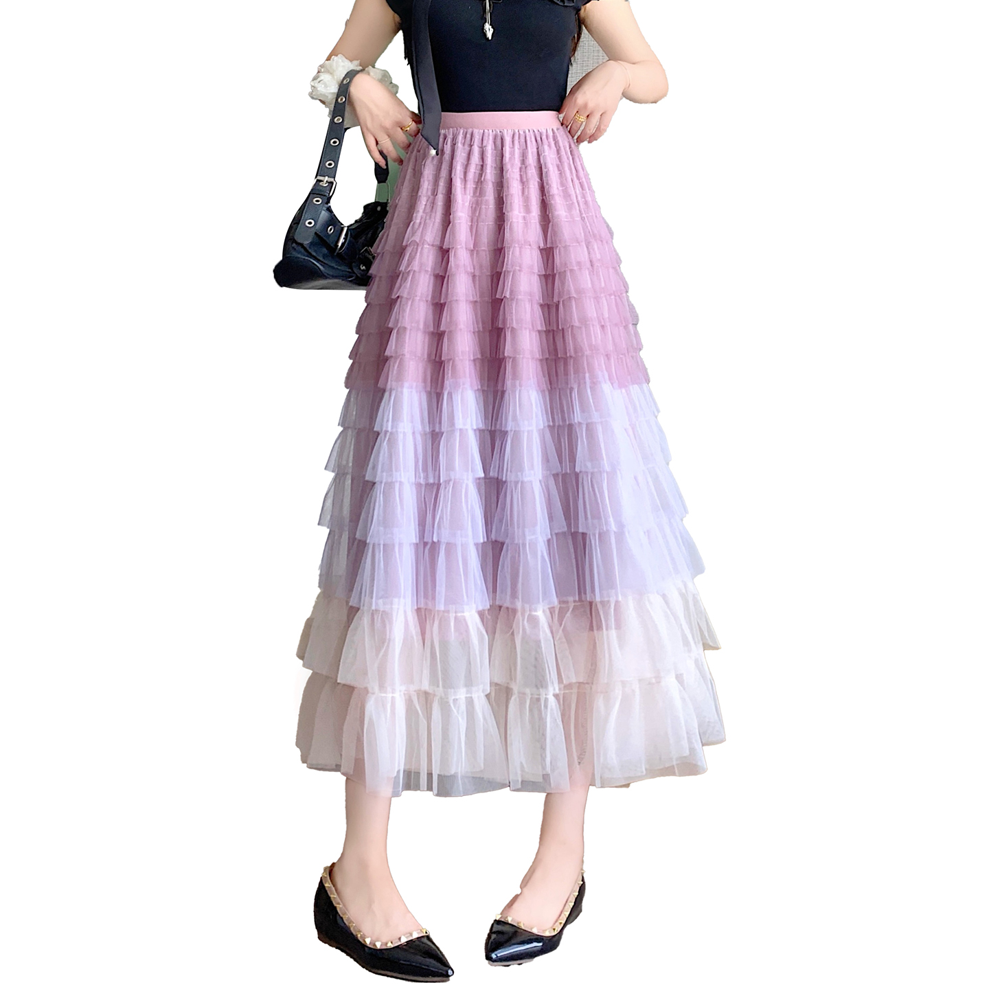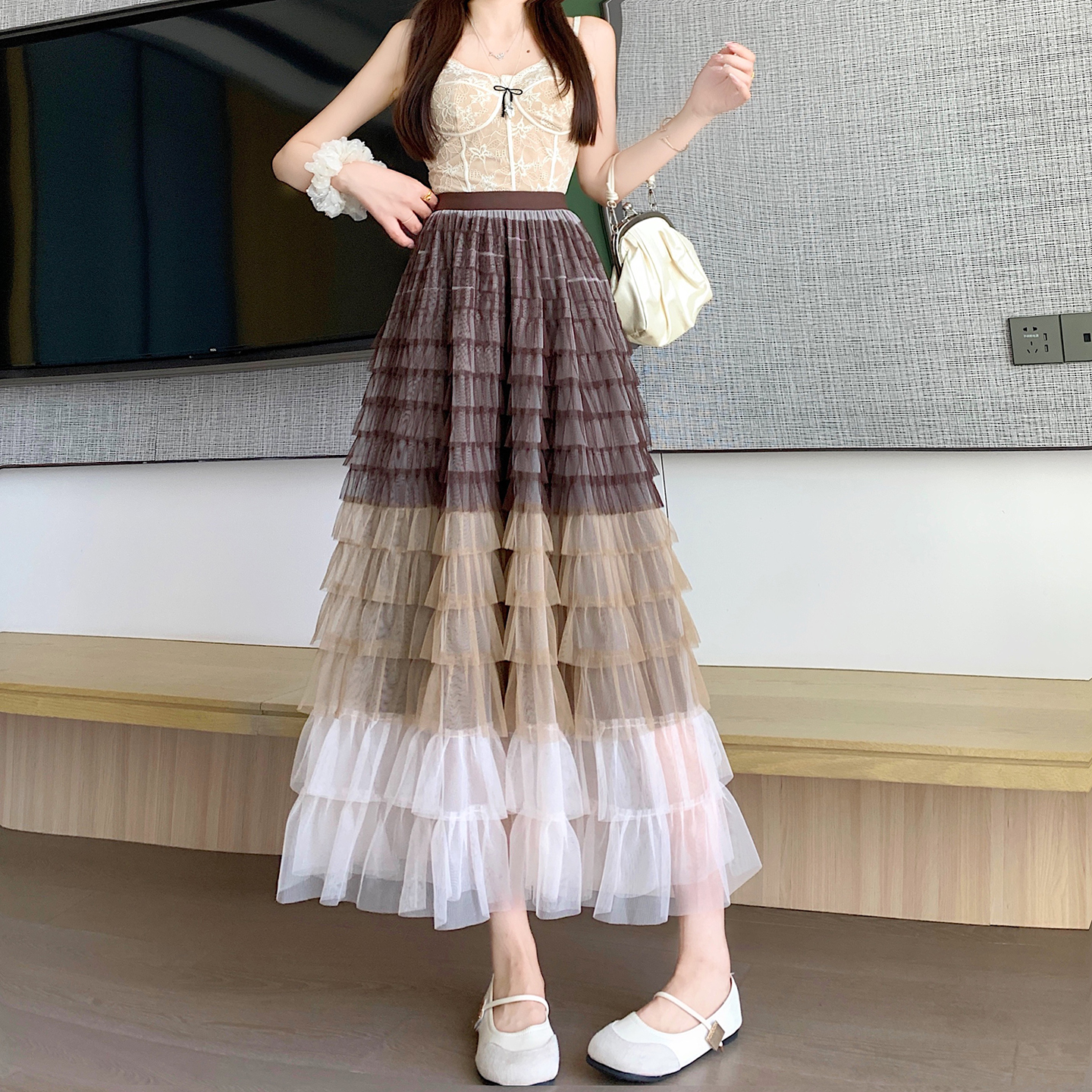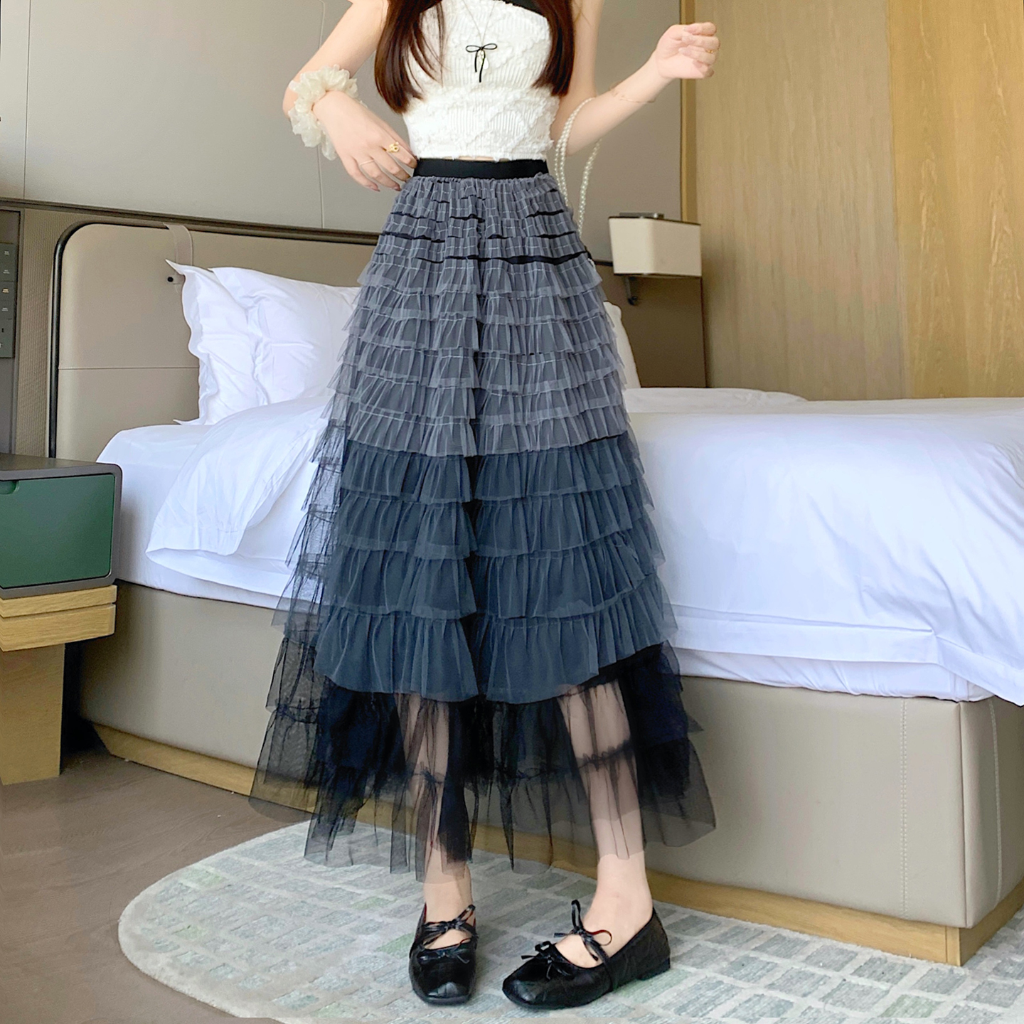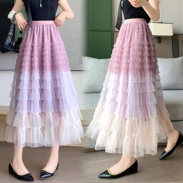 BY14844# 重工拼接印花网纱蛋糕裙半身裙女新款显瘦裙子长裙半裙伞裙四季款 服裝批發女裝批發服飾貨源