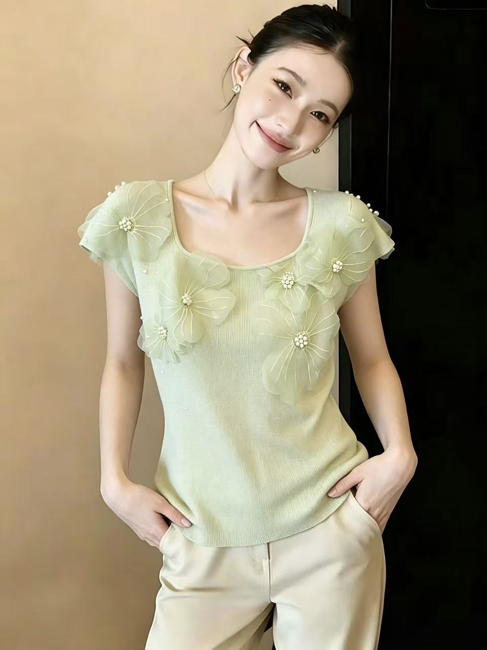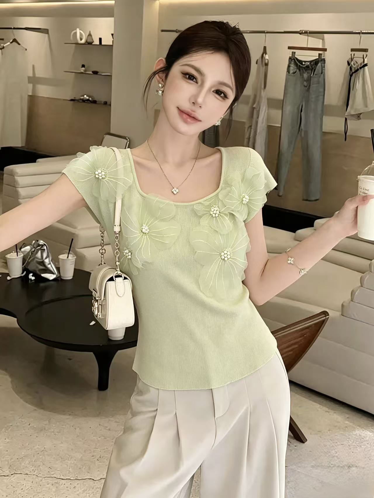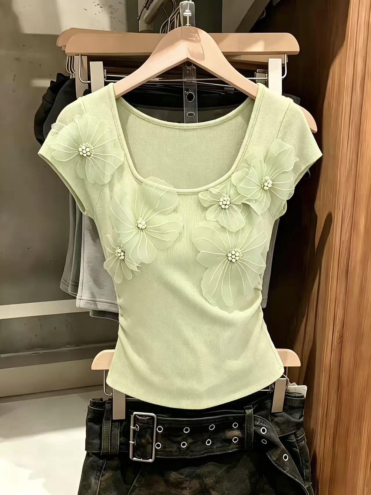 Home > 毛衣、针织衫 > BY14851# 甜美重工立体花朵短袖针织衫女夏季新款超好看小上衣chic 服裝批發女裝批發服飾貨源