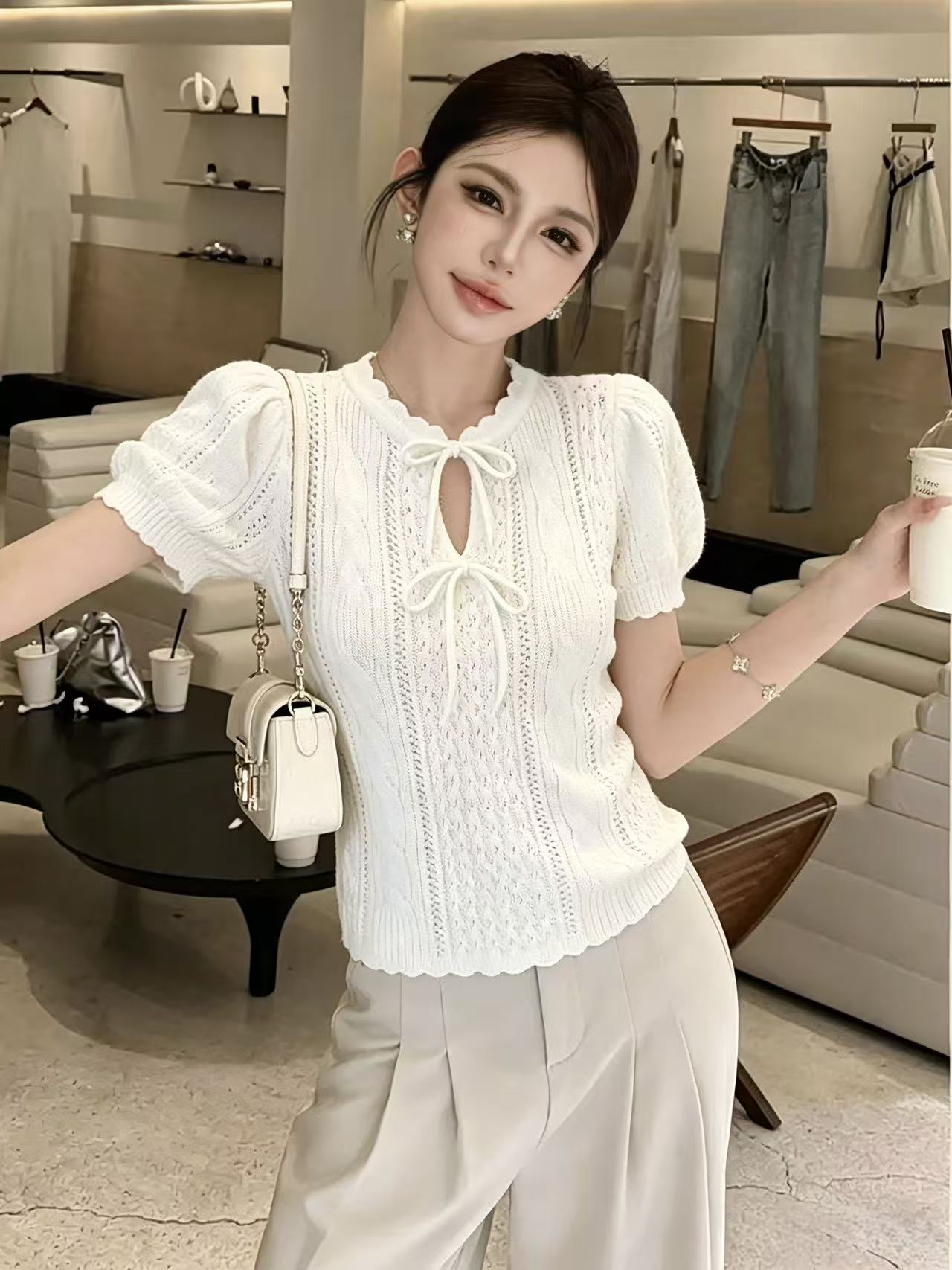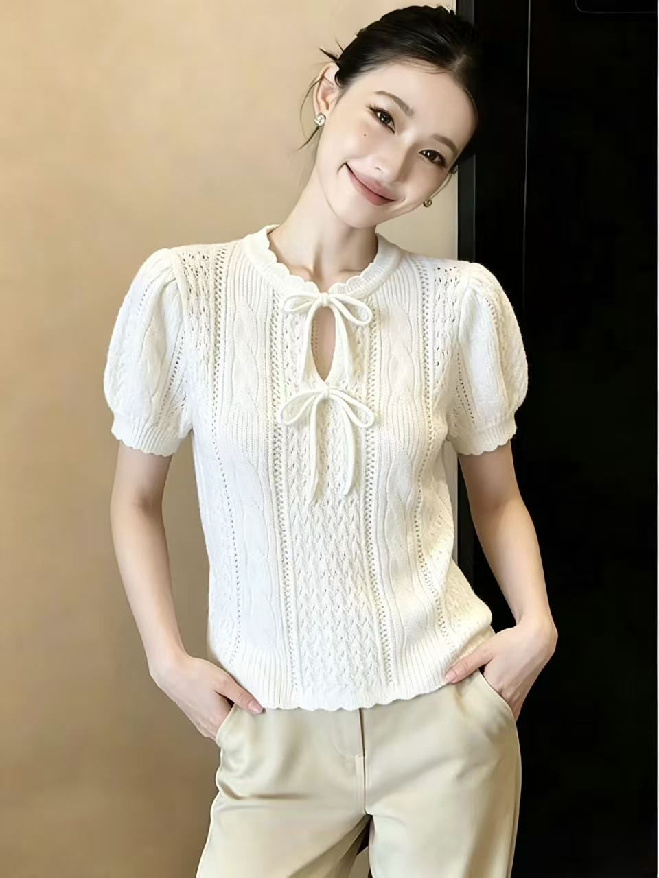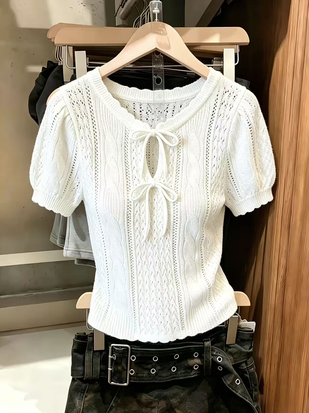 BY14852# 法式针织衫甜美风蝴蝶结系带泡泡袖T恤温柔上衣chic 服裝批發女裝批發服飾貨源