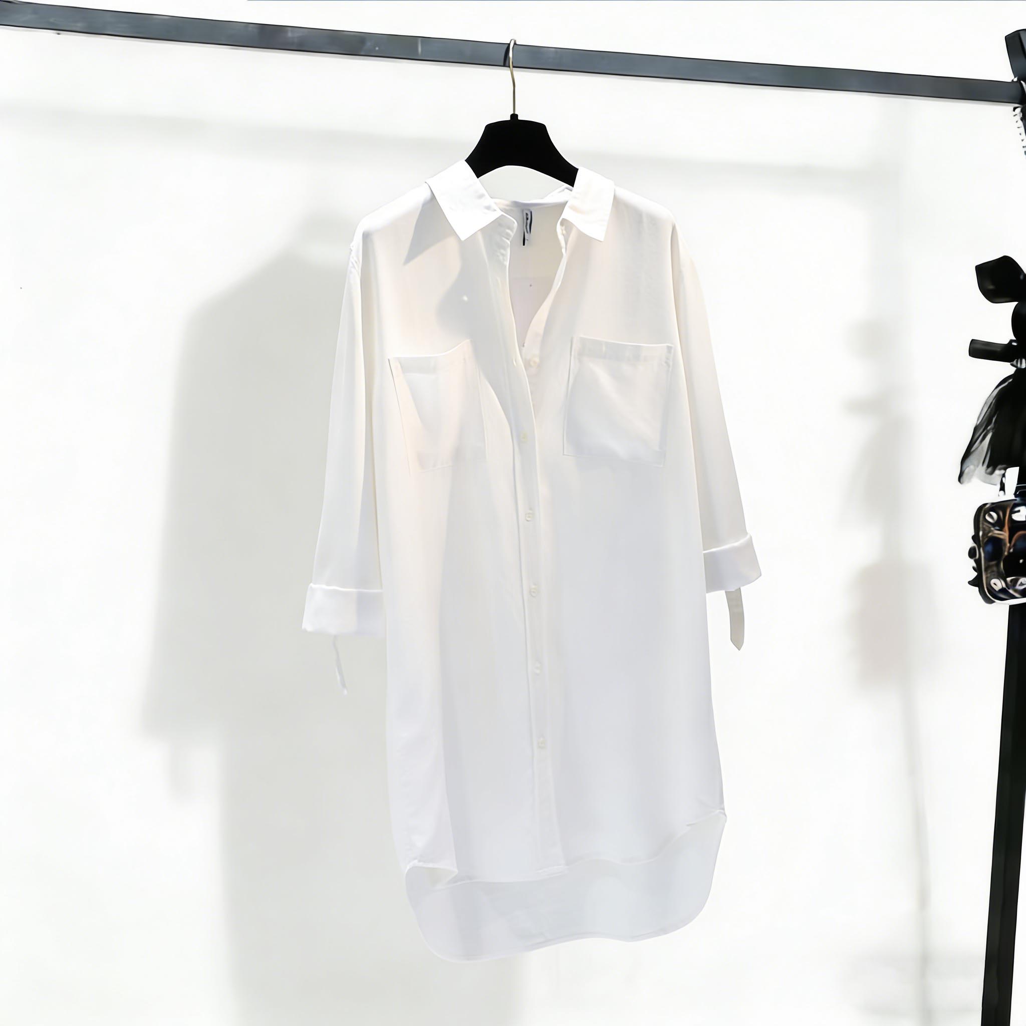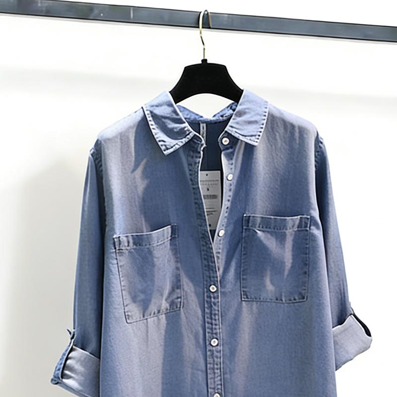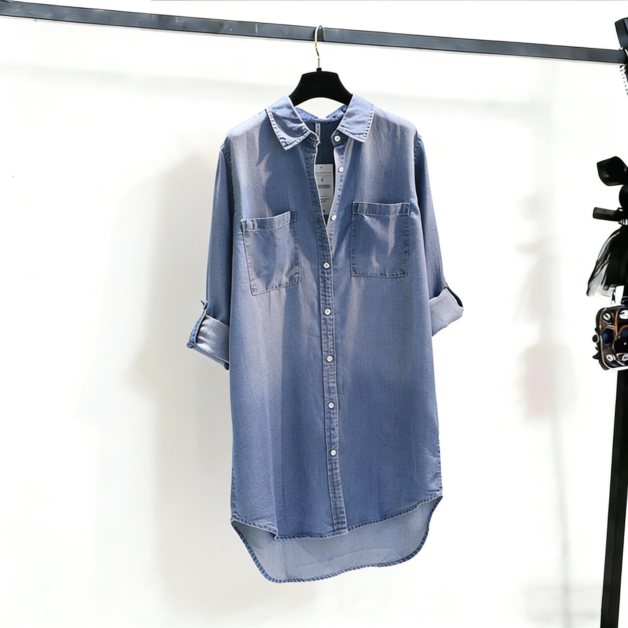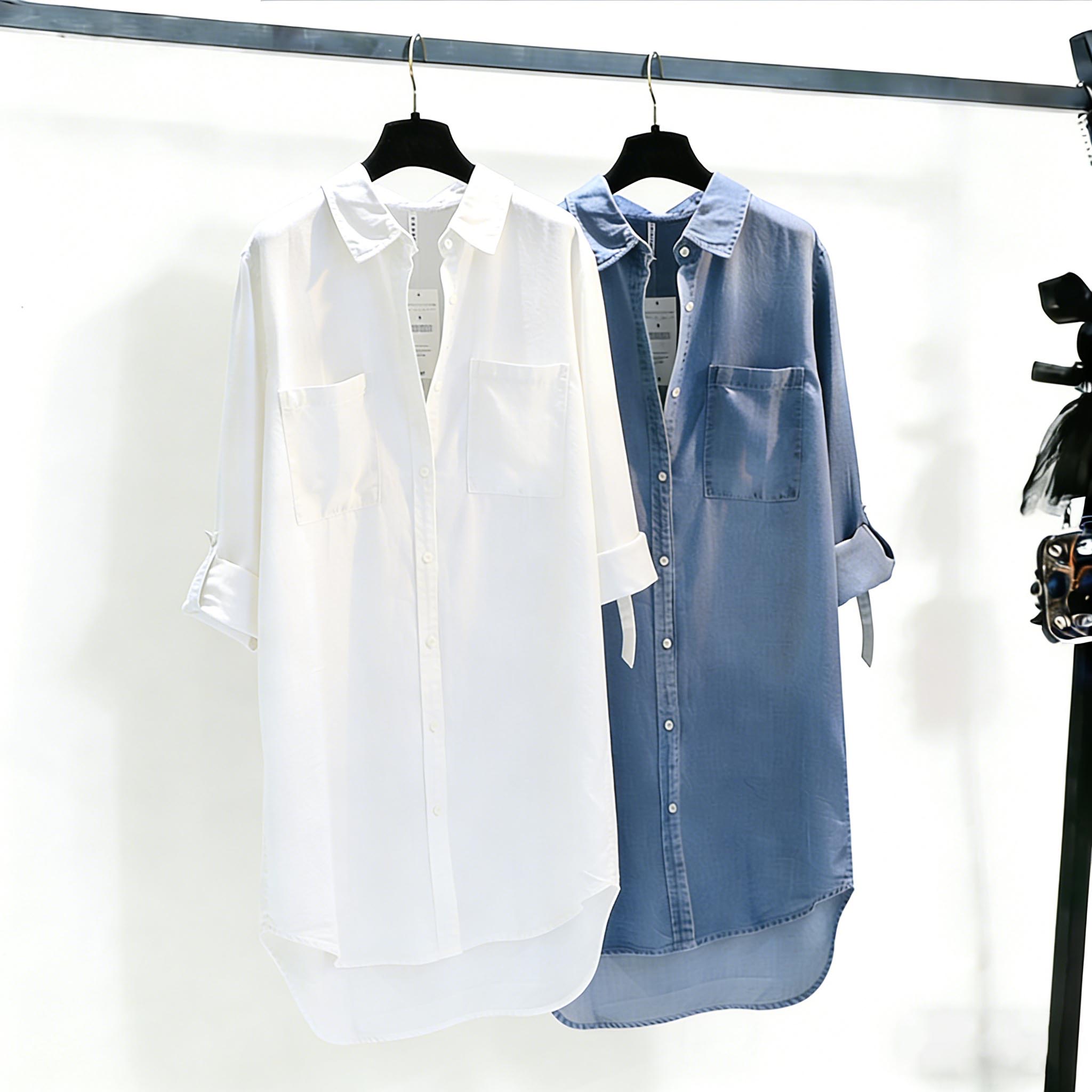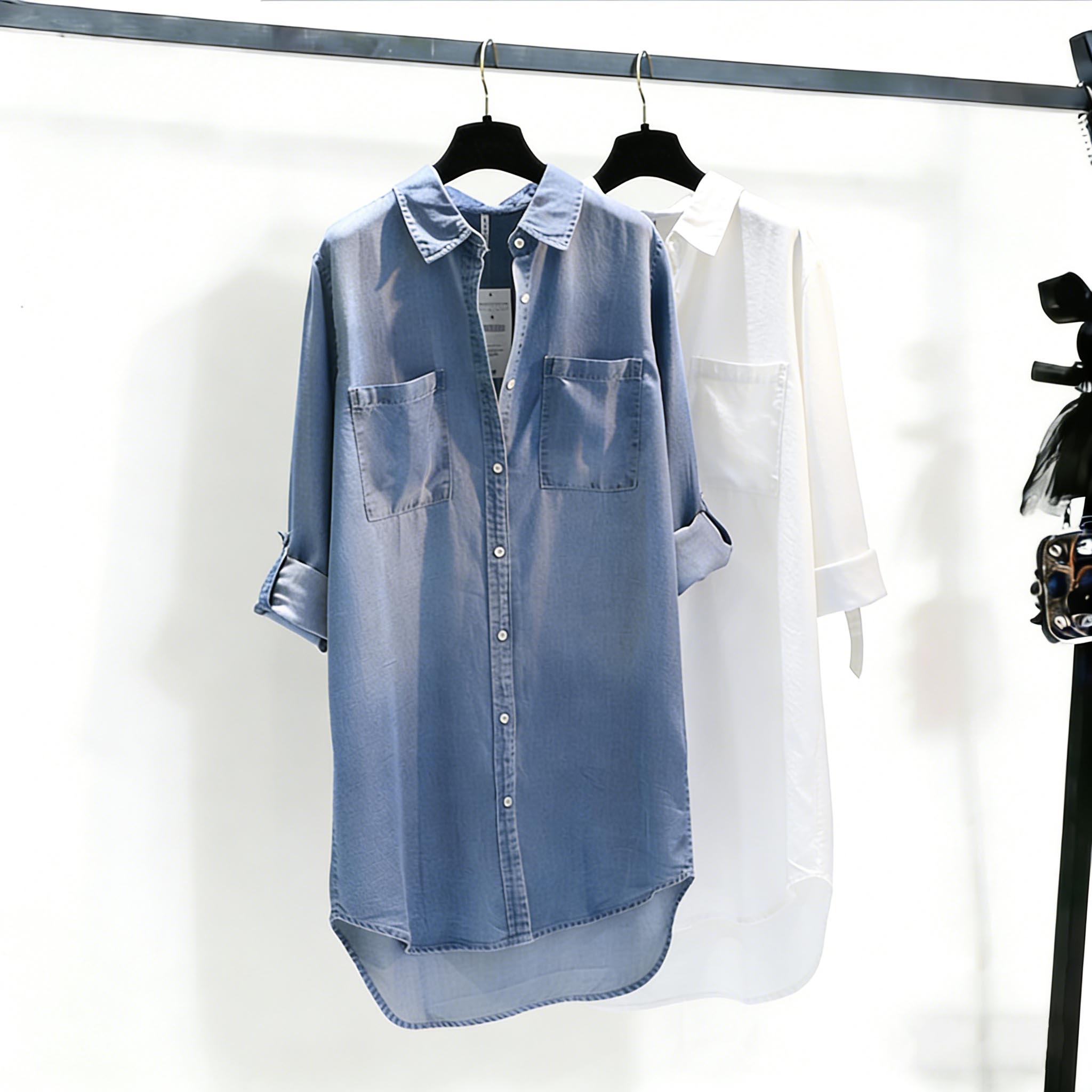 BY14858# 中长款牛仔衬衣裙女春秋季新款双口袋卷袖薄款宽松衬衫上衣 服裝批發女裝批發服飾貨源