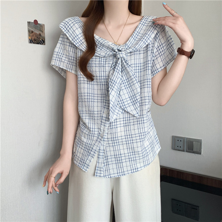 BY15828# 格子正肩短袖衬衫修身短款不规则斜肩小衫衬衣蝴蝶结上衣 服裝批發女裝批發服飾貨源