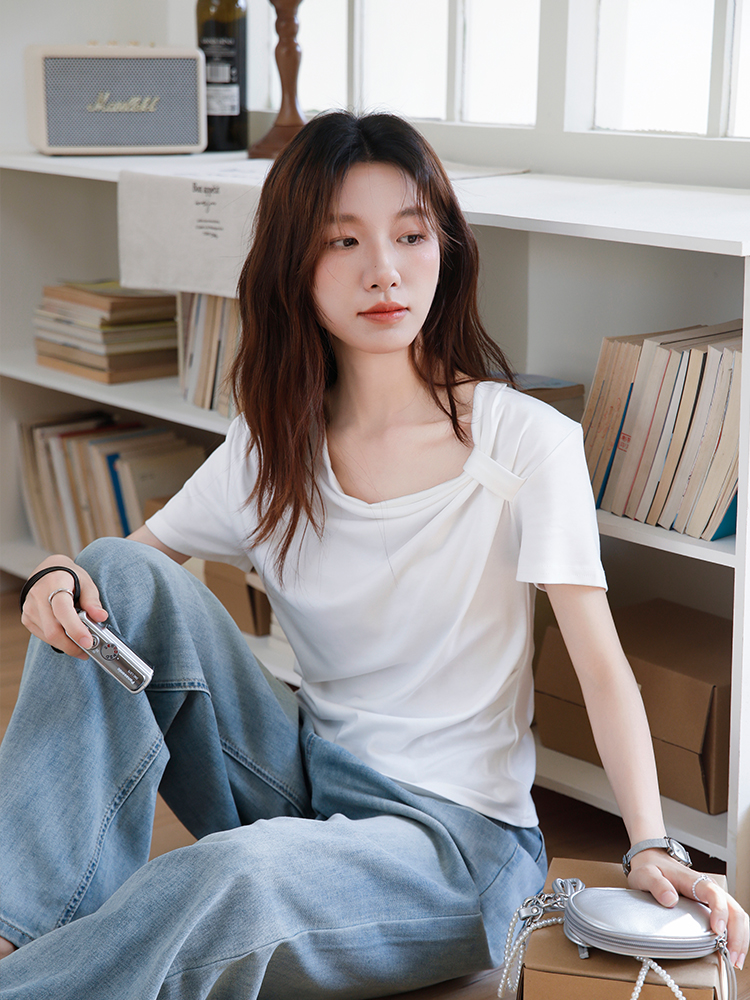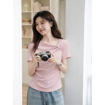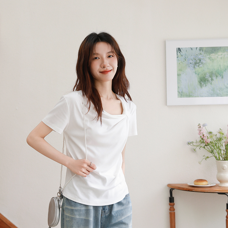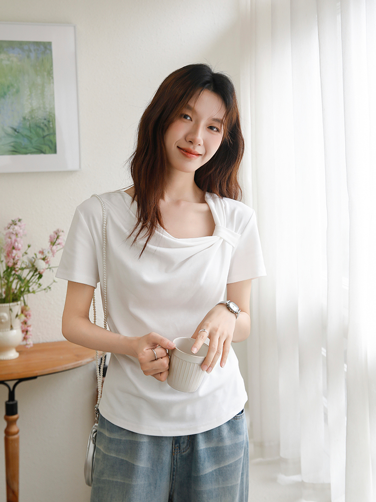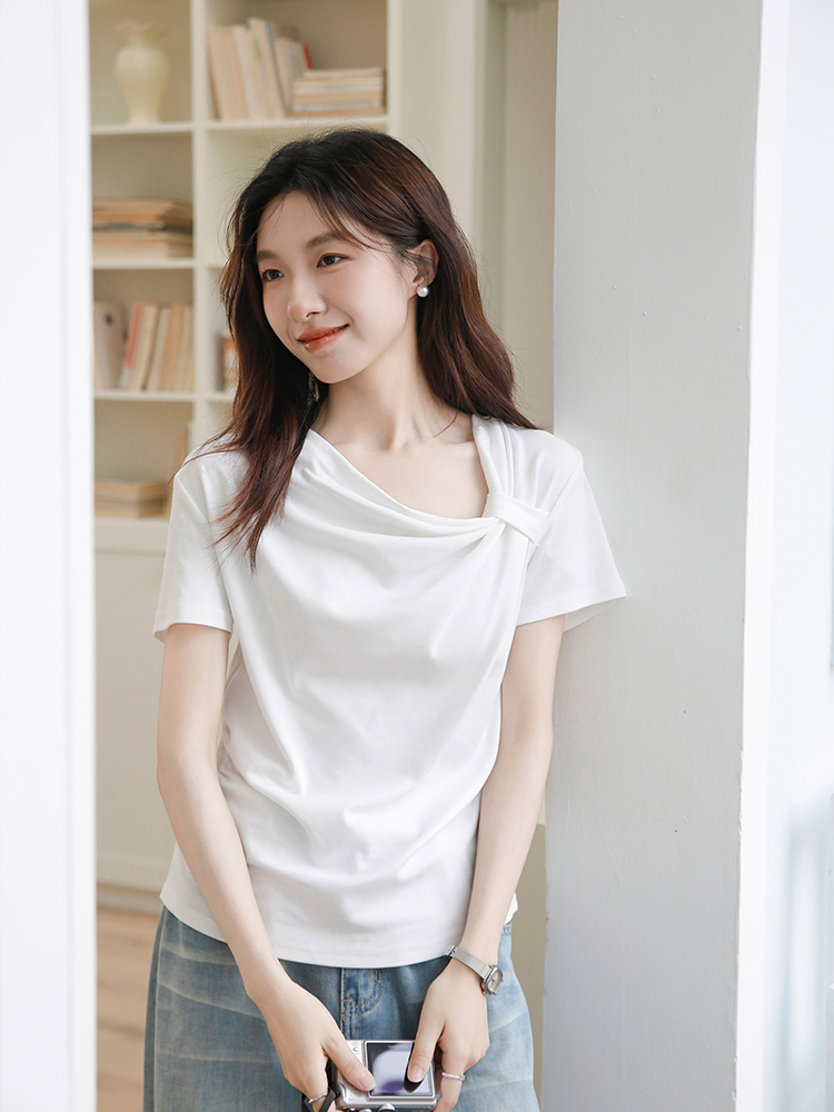 BY15835# 有货夏白色斜肩纽结短袖T恤褶皱不规则设计感收腰T恤 服裝批發女裝批發服飾貨源