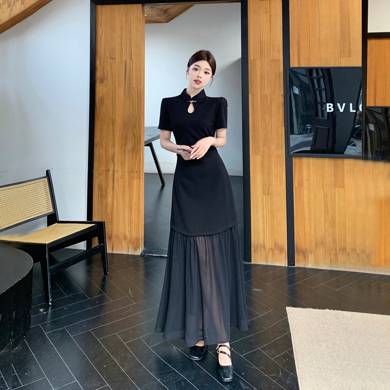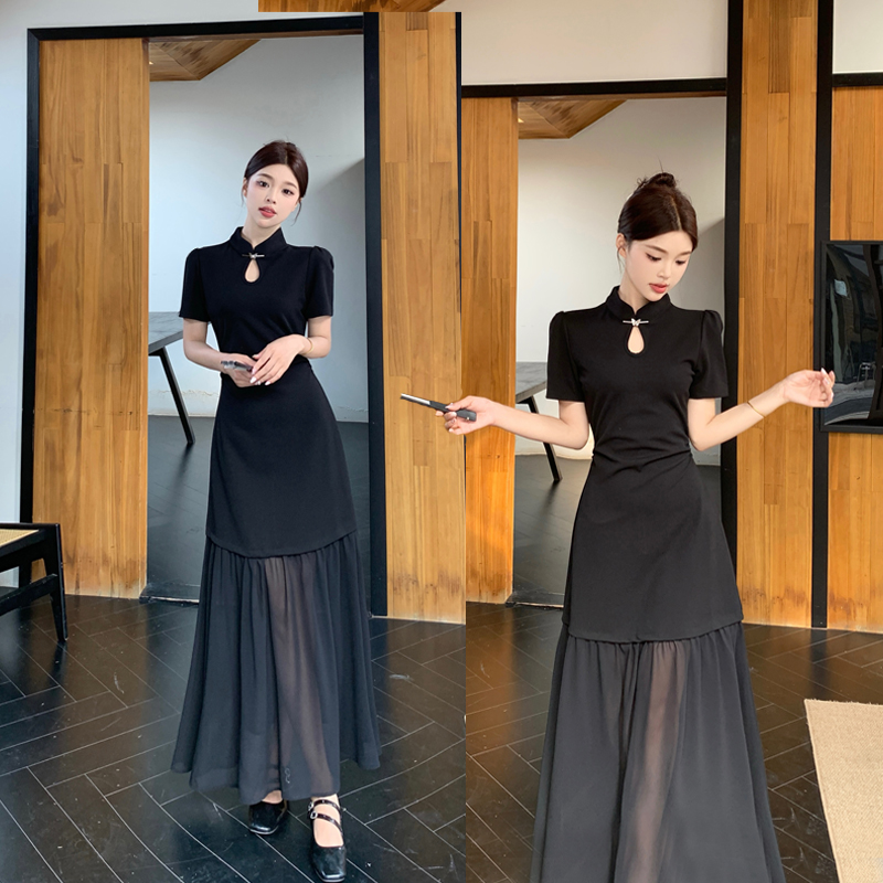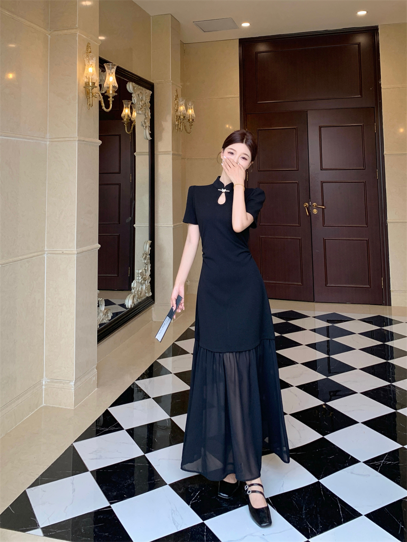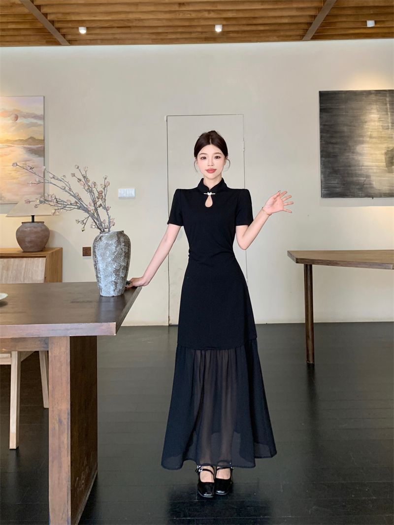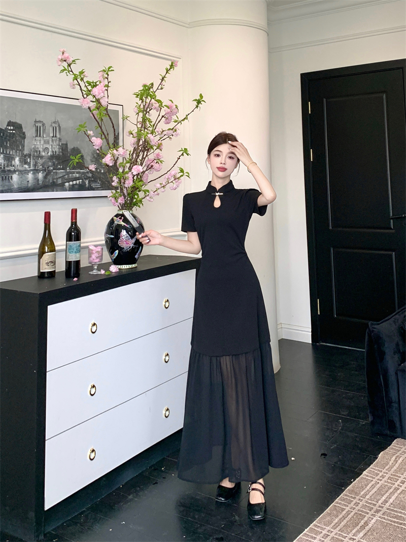 BY15853# 大码夏季新中式国风旗袍裙气质黑色显瘦网纱裙摆拼接连衣裙 服裝批發女裝批發服飾貨源