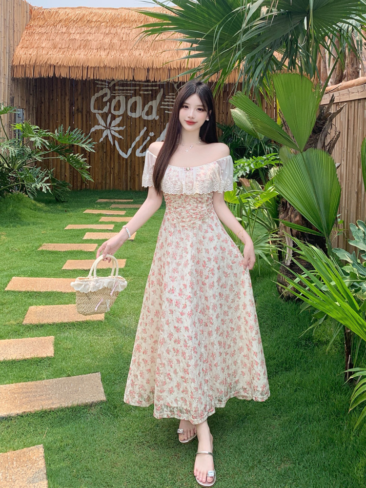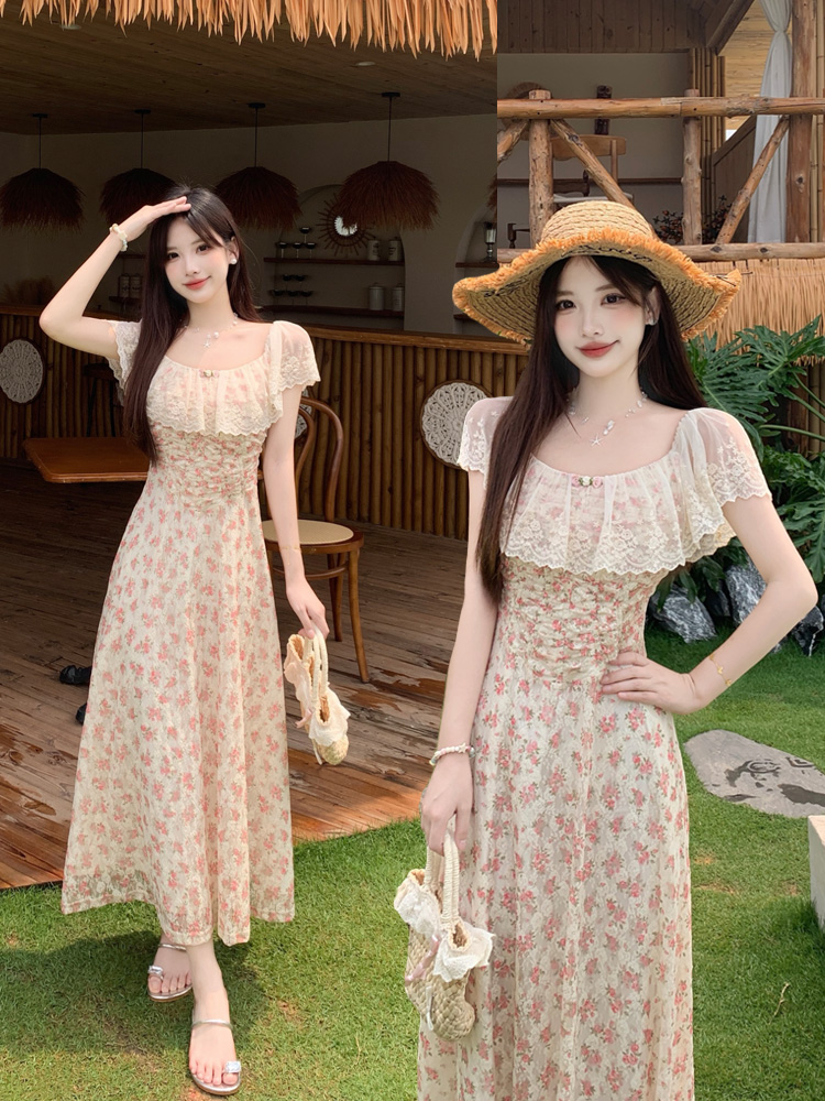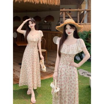 BY15856# 大码女装泰兰德少女蕾丝边鱼骨收腰显瘦浪漫成人礼碎花裙 服裝批發女裝批發服飾貨源