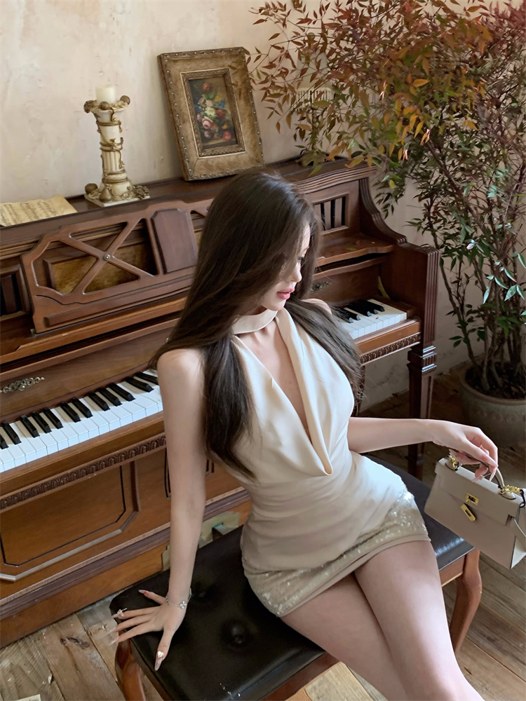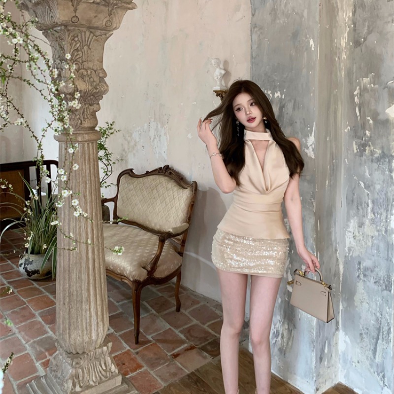 Home > 韩版套装 > BY16381# 名媛风气质套装高级荡领缎面上衣高腰亮片半身裙两件套 服裝批發女裝批發服飾貨源