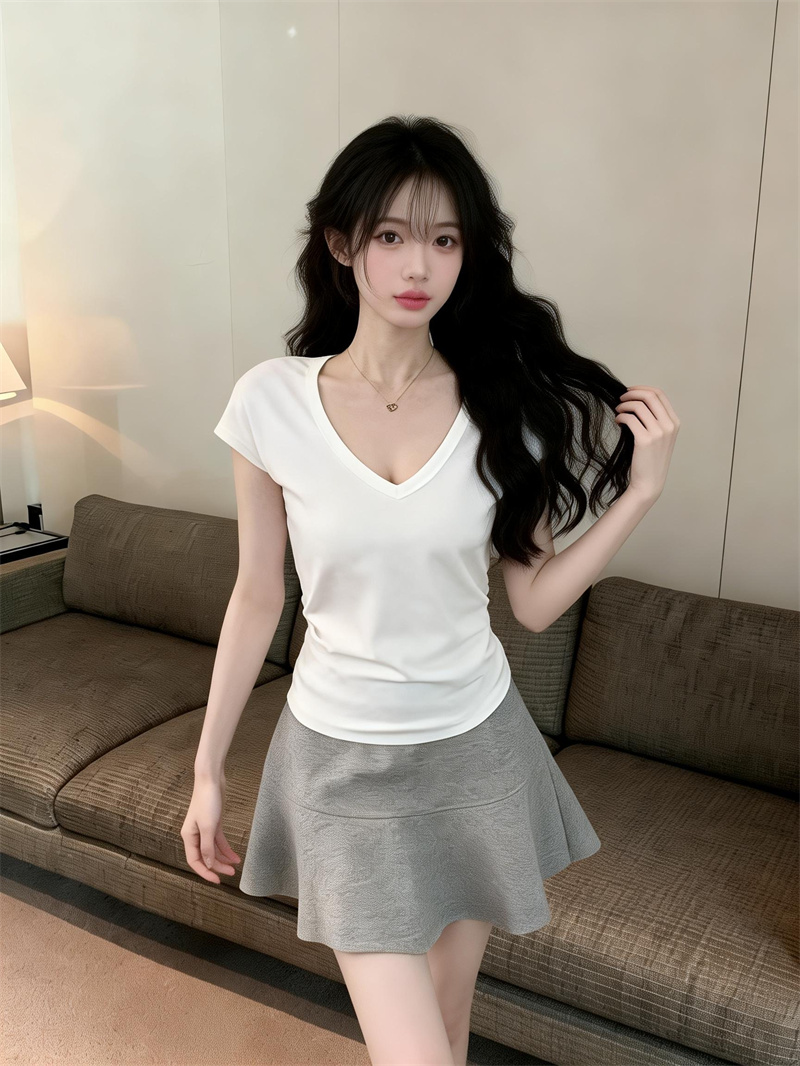 BY16410# 基础减龄正肩V领短袖T恤女+俏皮韩系a字短裙两件套装女 服裝批發女裝批發服飾貨源