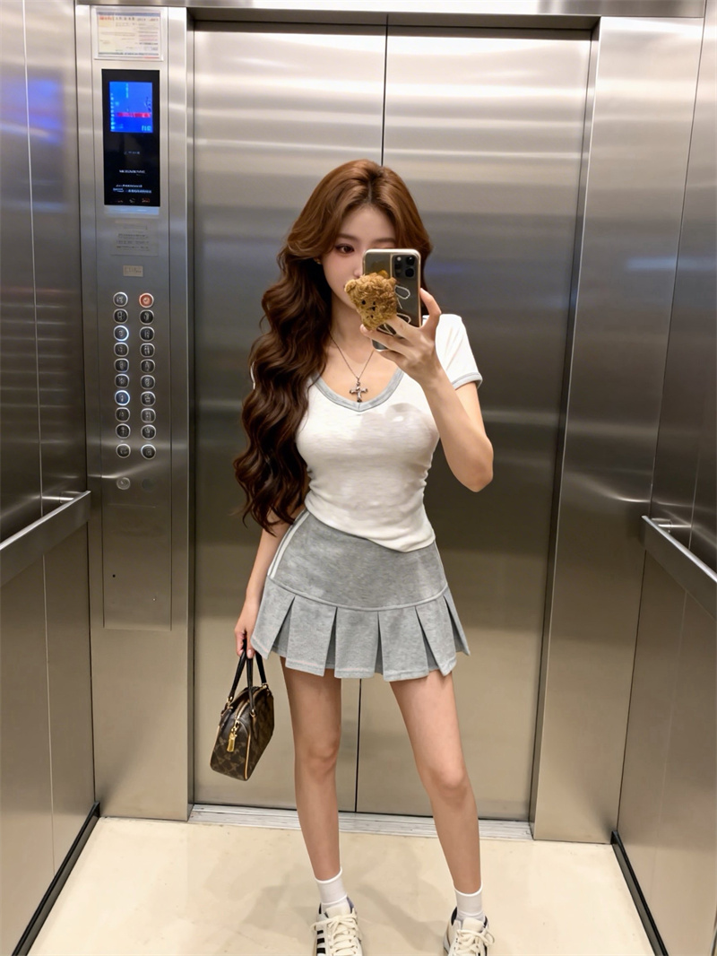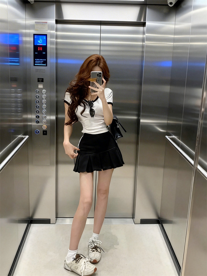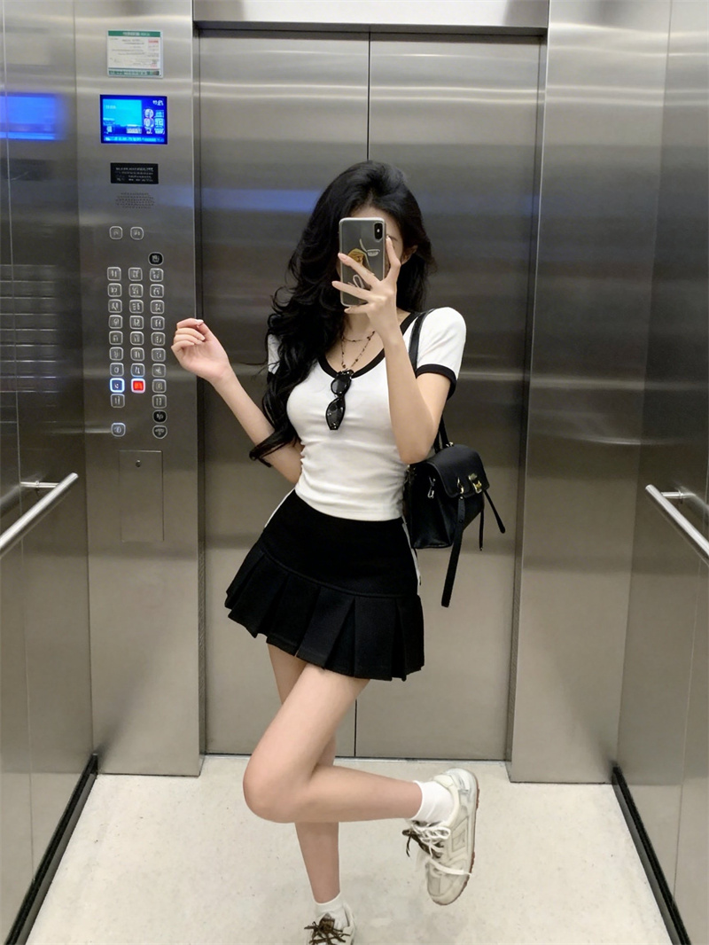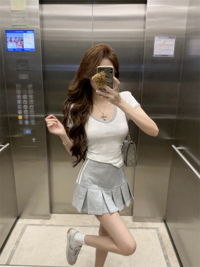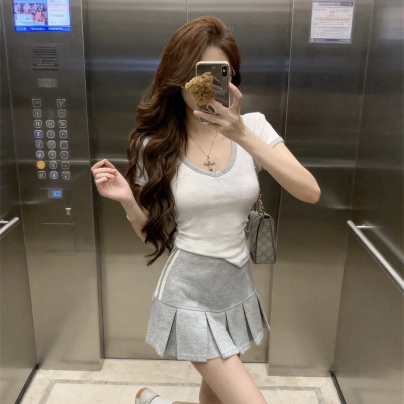 BY16413# 基础减龄撞色V领短袖T恤女+学院风韩系a字短裙两件套装女 服裝批發女裝批發服飾貨源