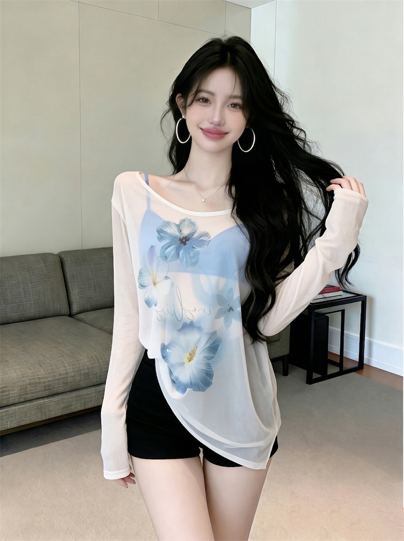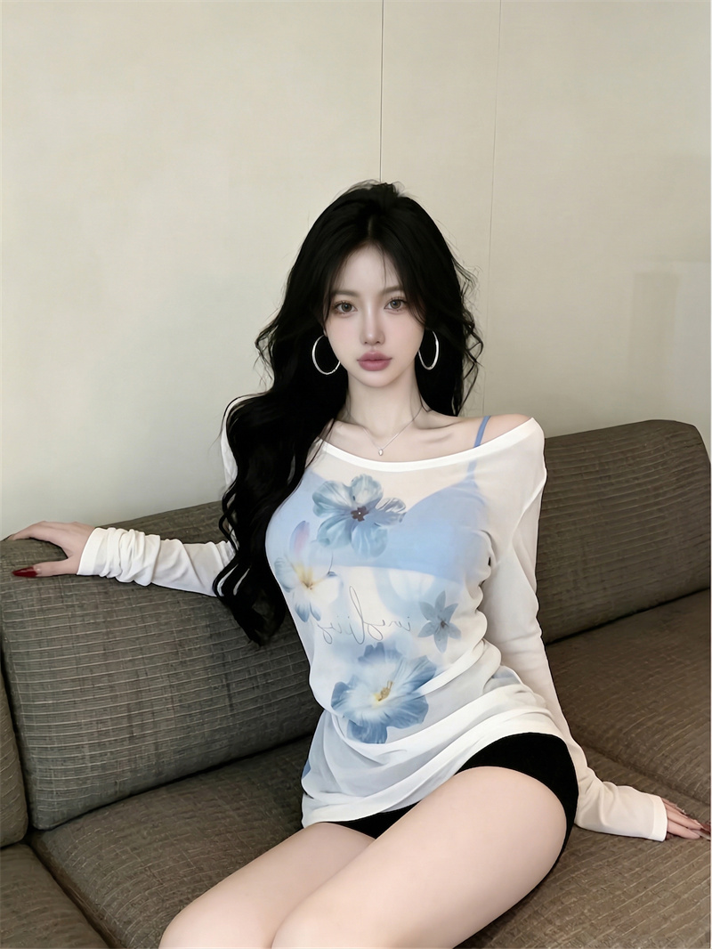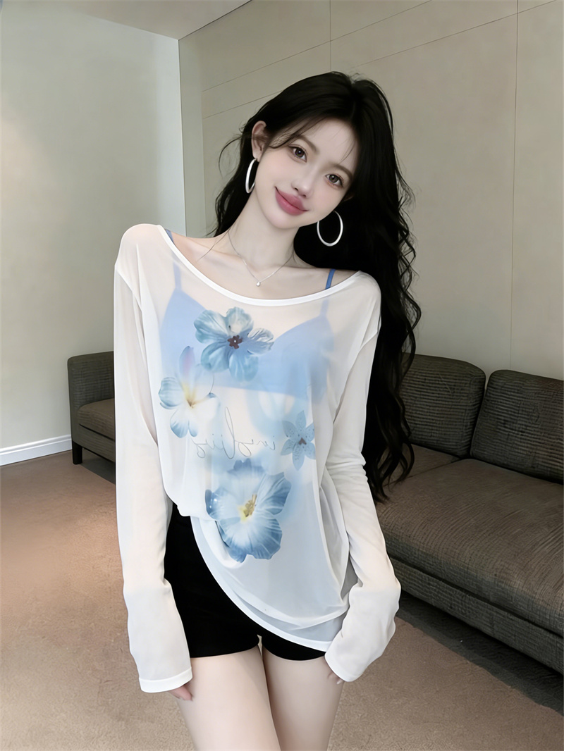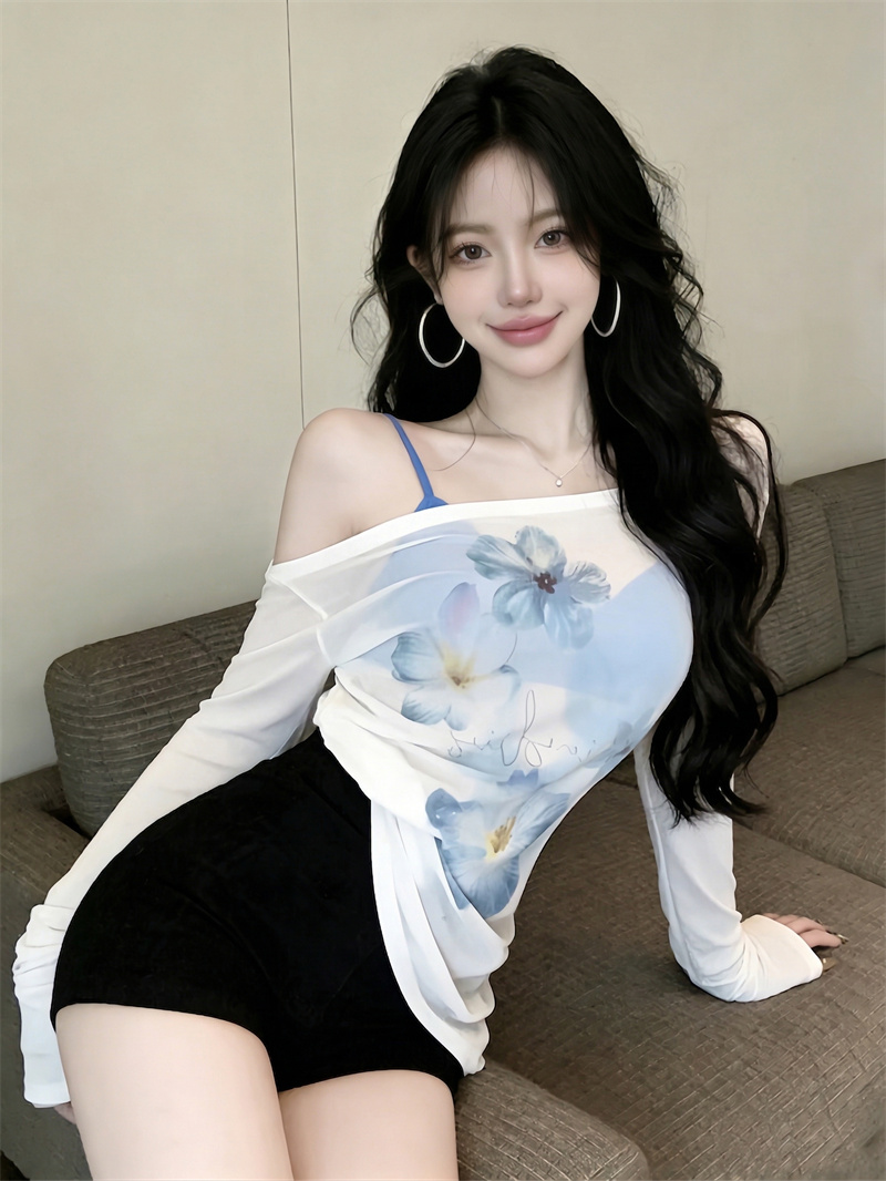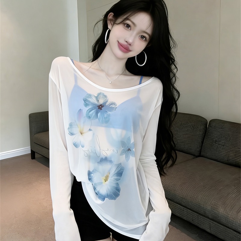 BY16414# 减龄设计长袖防晒衫女新款夏季印花t恤宽松露肩斜肩上衣女 服裝批發女裝批發服飾貨源