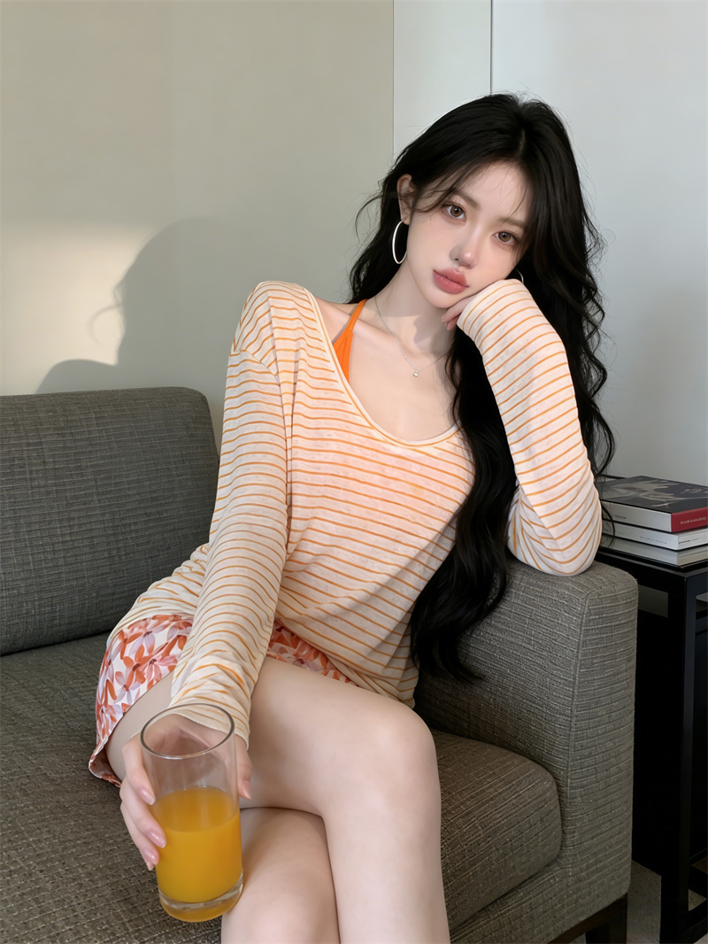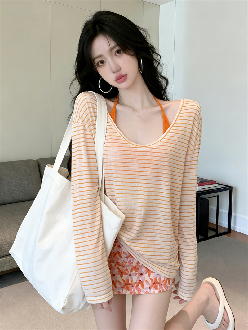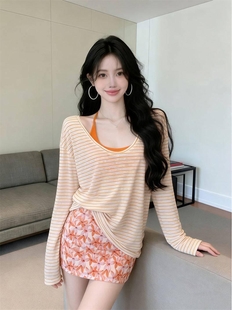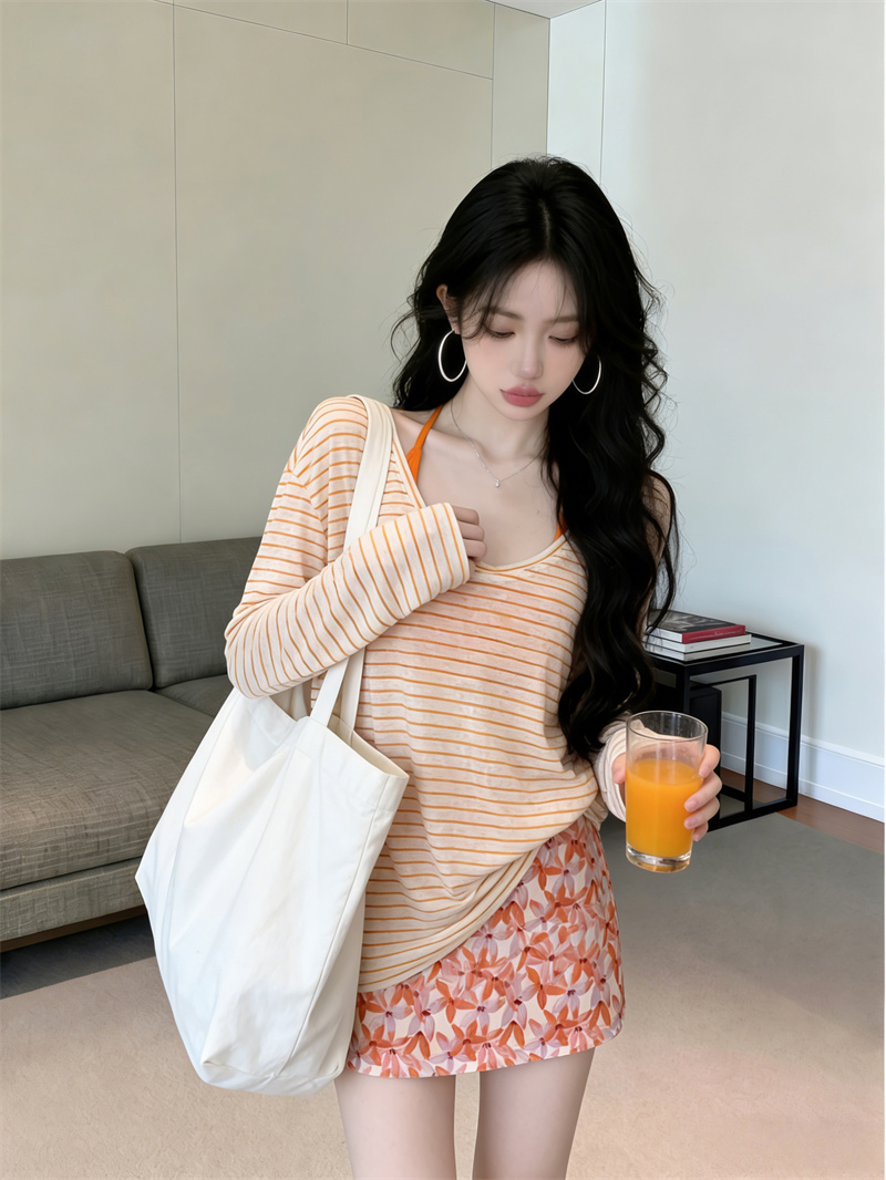 BY16416# 春夏条纹长袖罩衫+绑带挂脖背心+花色包臀半裙三件套装女 服裝批發女裝批發服飾貨源