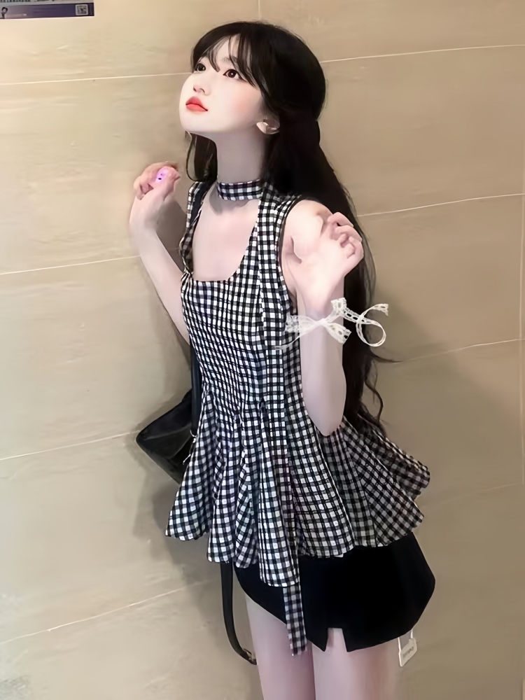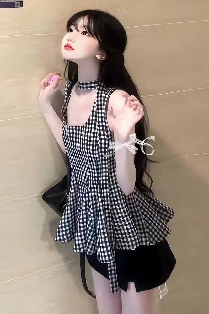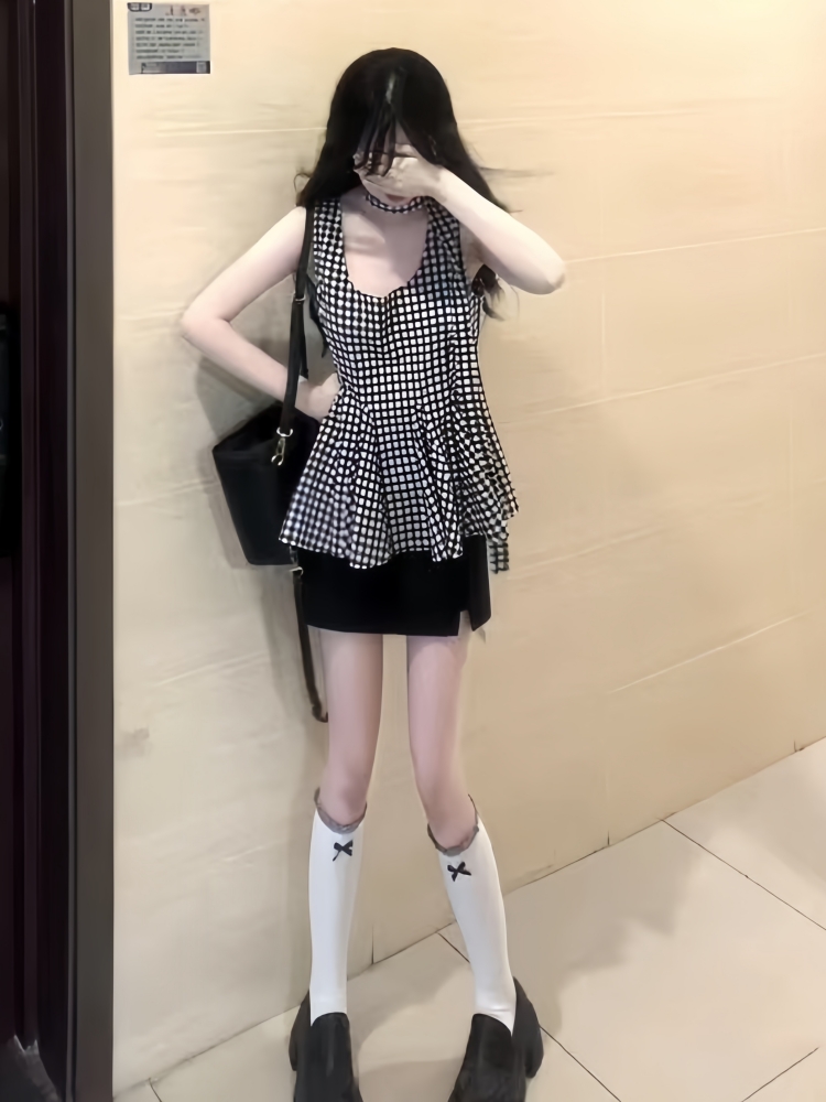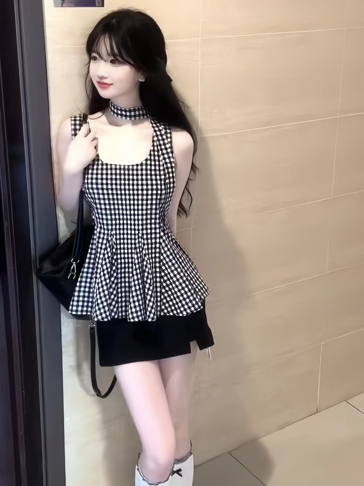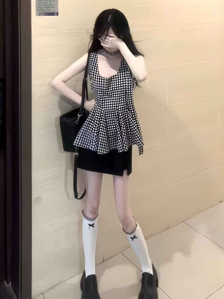 BY16422# 俏皮活泼套装裙韩里韩气赫本风黑色格纹背心上衣包臀短裙两件套女 服裝批發女裝批發服飾貨源