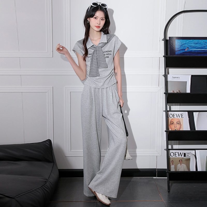 BY16445# 新款女装时尚休闲套装洋气字母印花短袖上衣阔腿裤减龄两件套 服裝批發女裝批發服飾貨源
