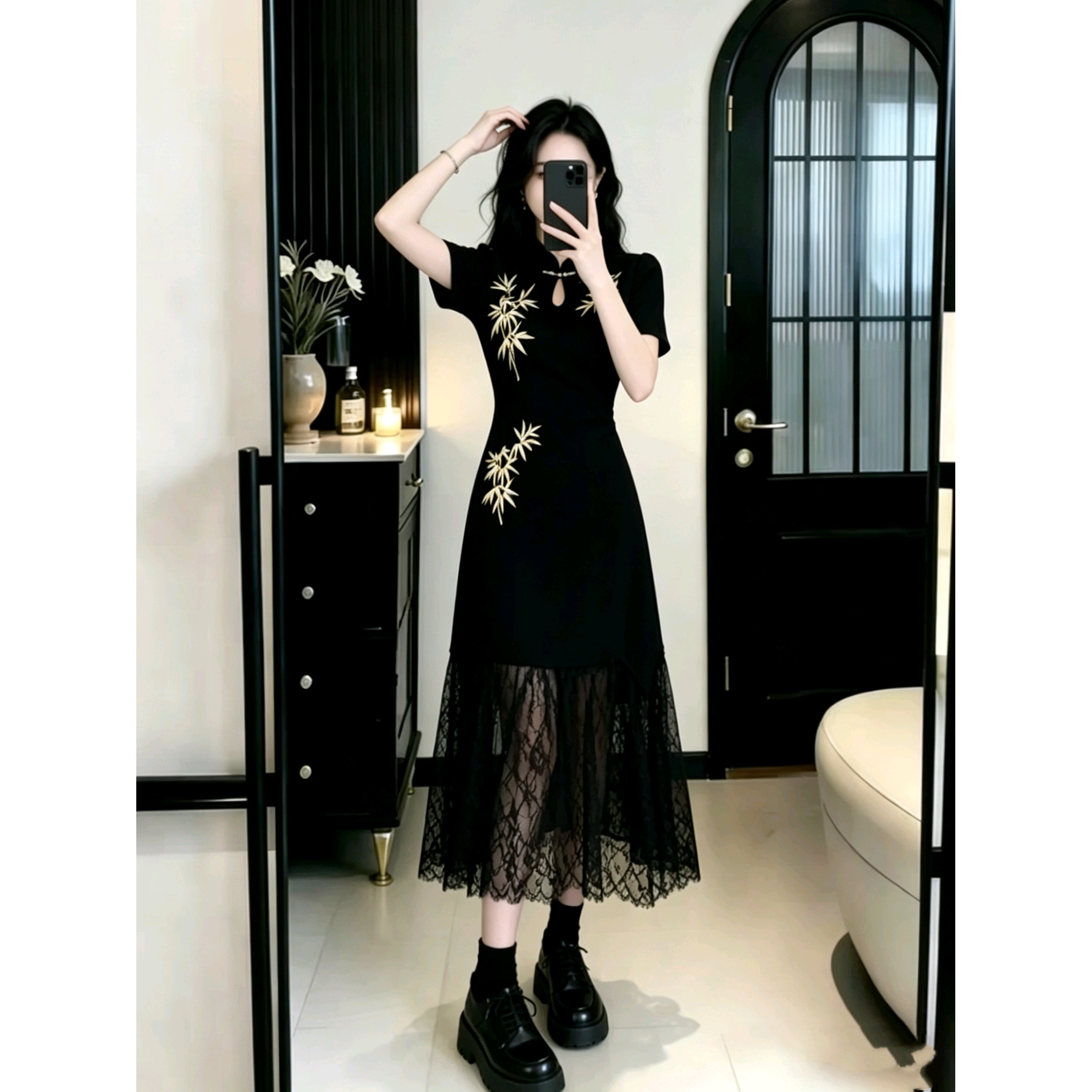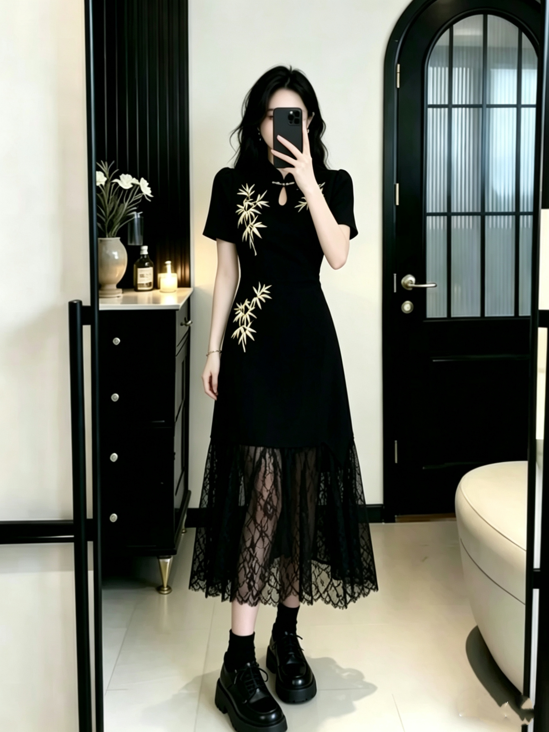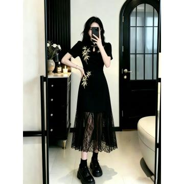 BY16449# 大码女装胖MM复古重工绣花拼接蕾丝裙摆显瘦长款连衣裙 服裝批發女裝批發服飾貨源