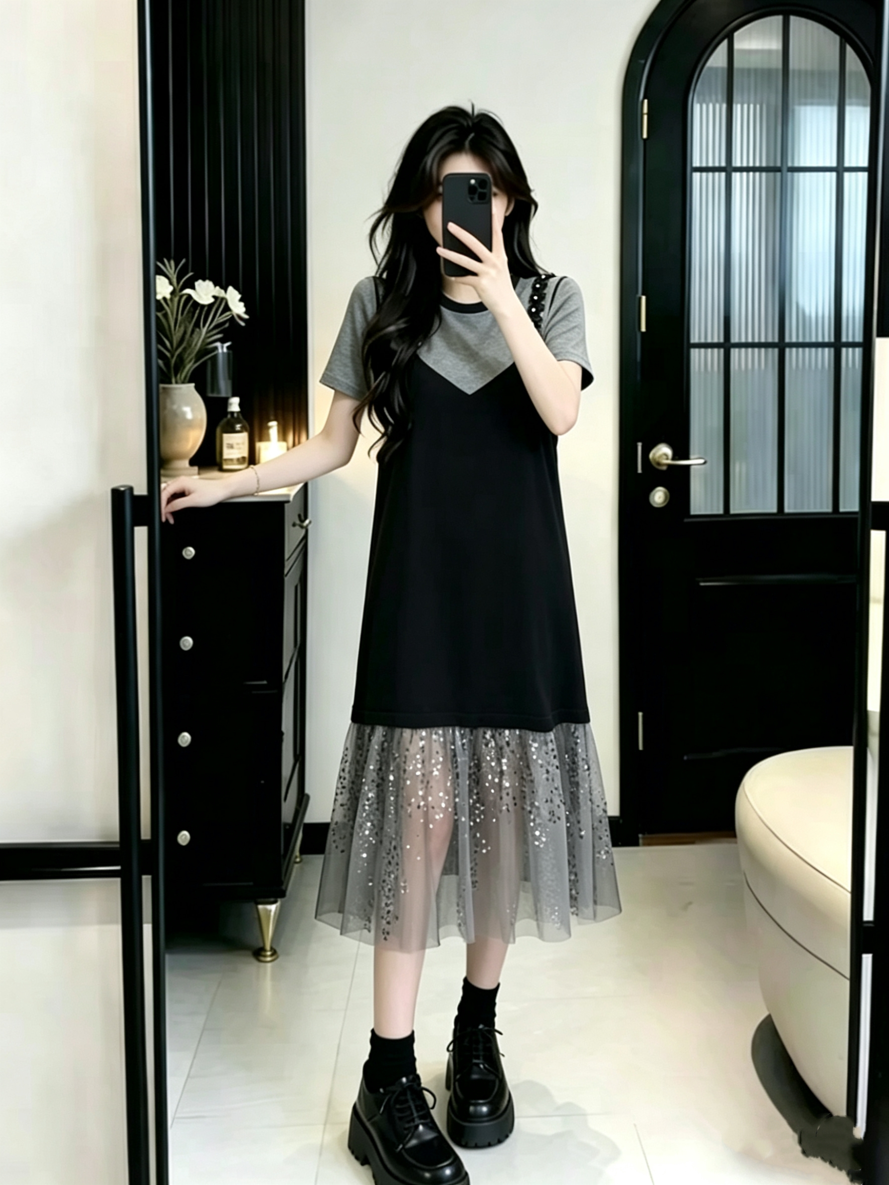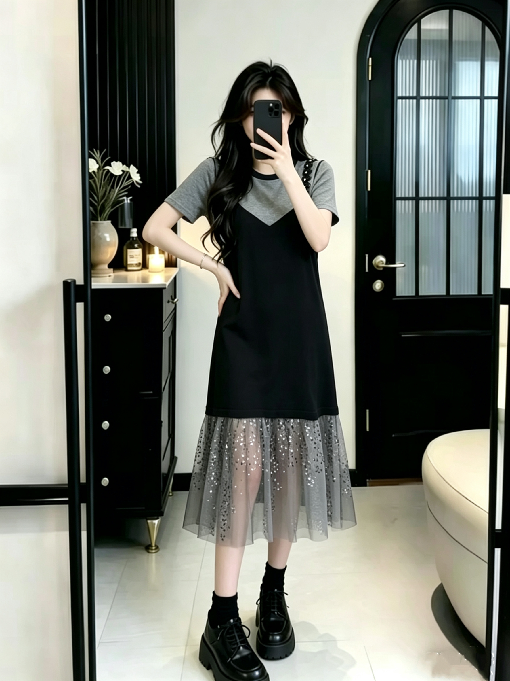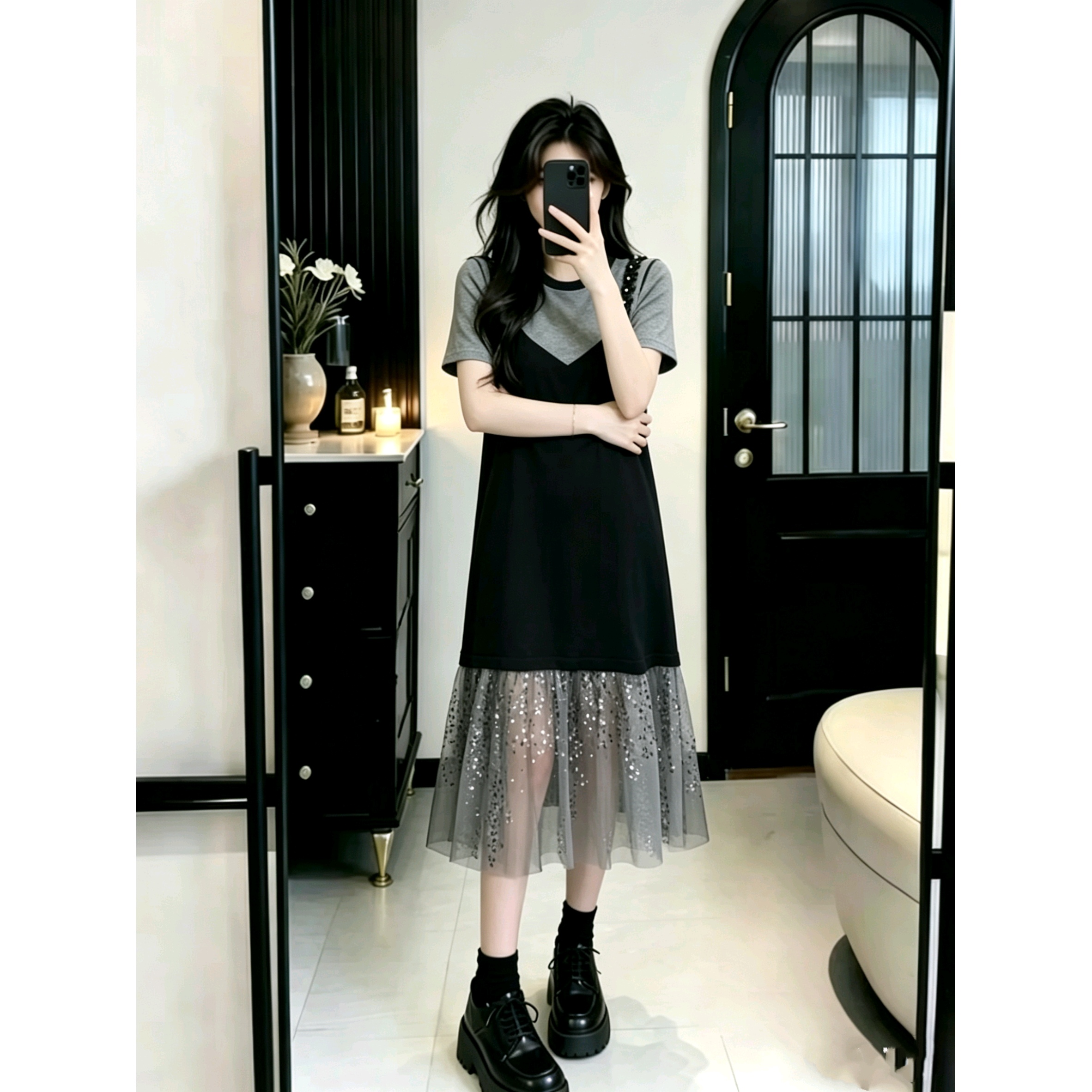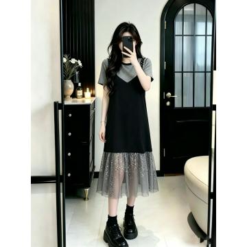 BY16450# 大码女装假两件吊带针织拼接亮闪闪珠片网纱过膝长款连衣裙 服裝批發女裝批發服飾貨源