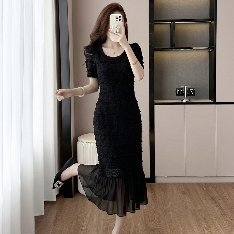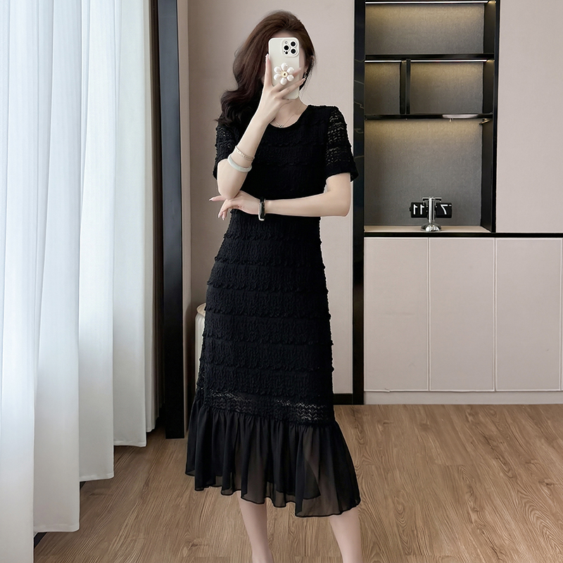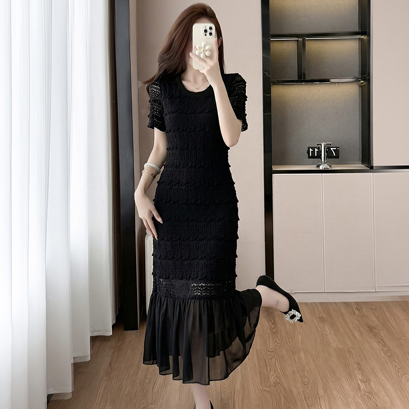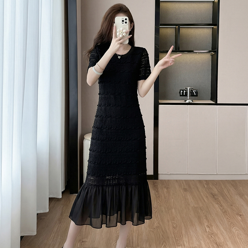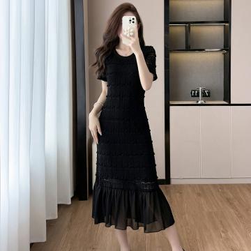 BY16482# 大码法式轻奢蕾丝镂空遮肉长裙胖mm夏季气质减龄显瘦肌理感连衣裙 服裝批發女裝批發服飾貨源