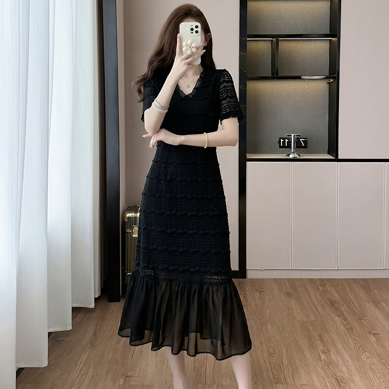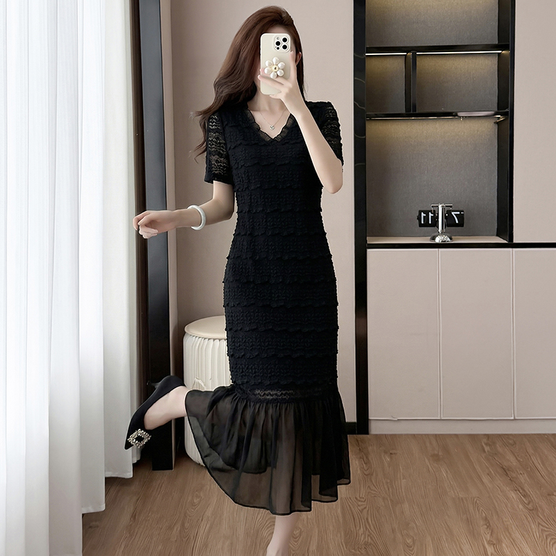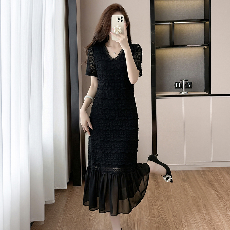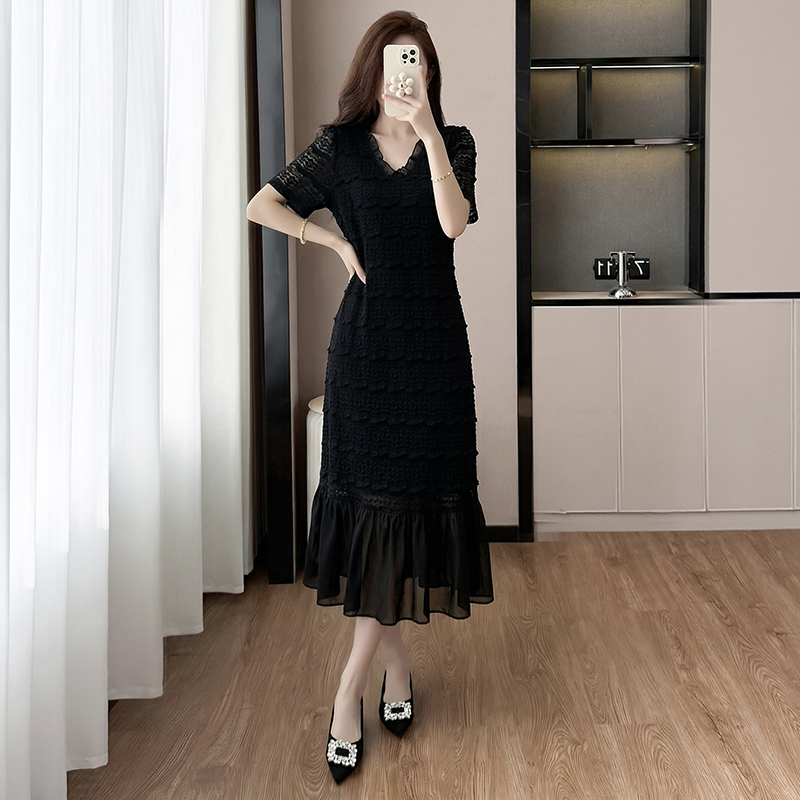 BY16485# 大码高端轻奢蕾丝肌理感连衣裙夏季优雅气质胖mm超显瘦小黑裙 服裝批發女裝批發服飾貨源