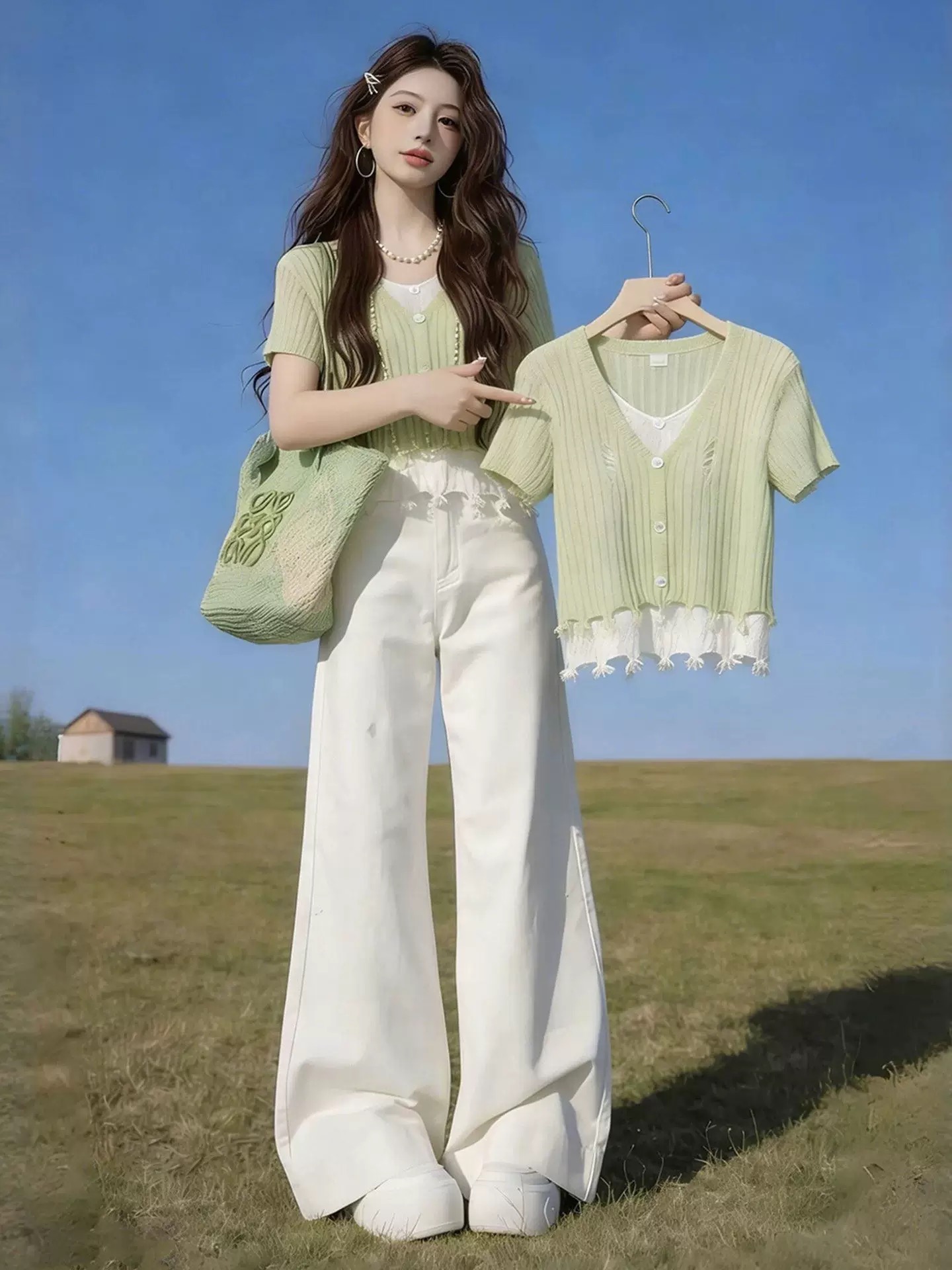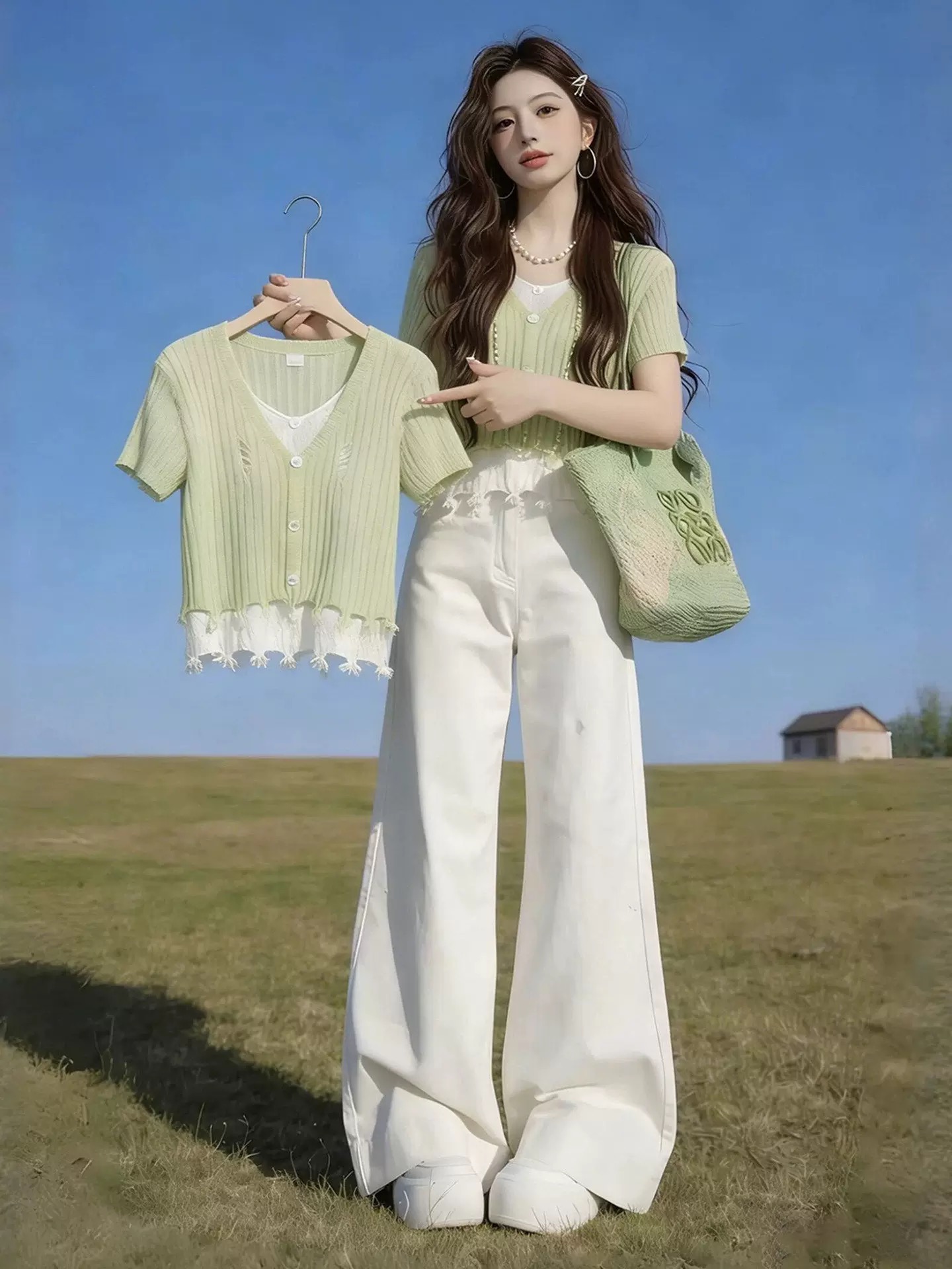 BY16662# 绿色假两件修身内搭打底针织衫女春季巨好看慵懒松弛绝美上