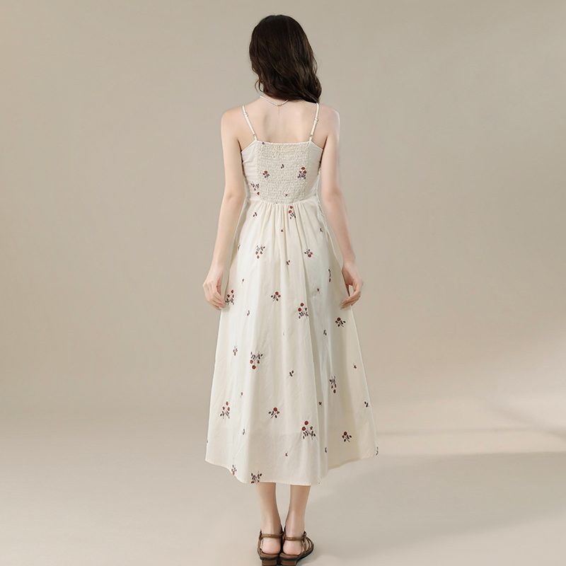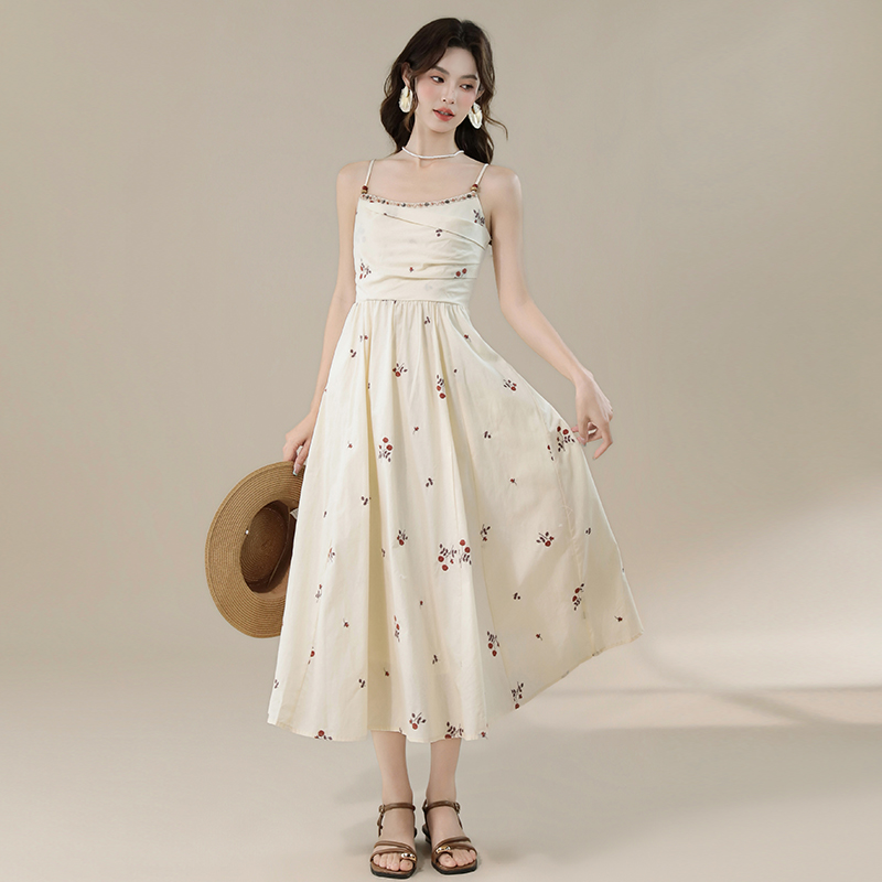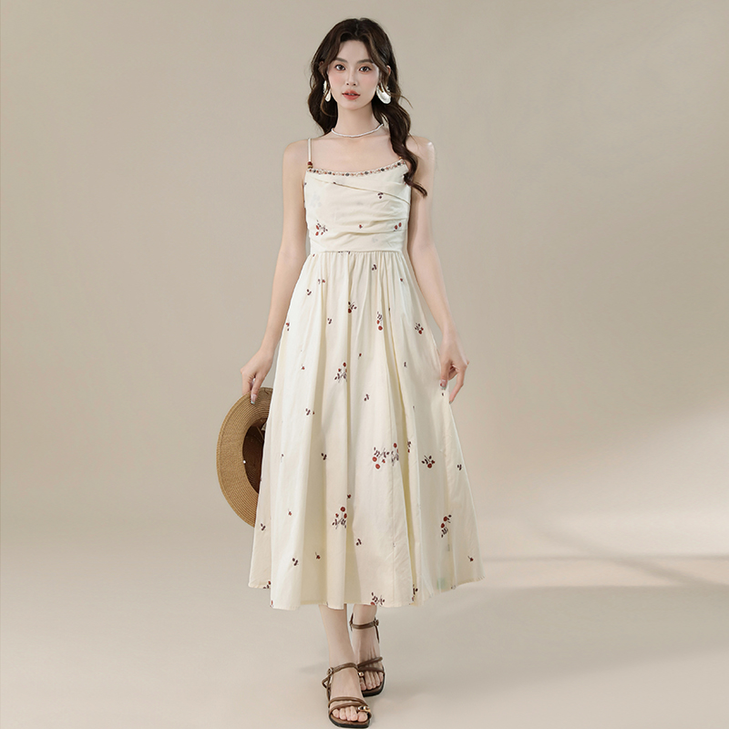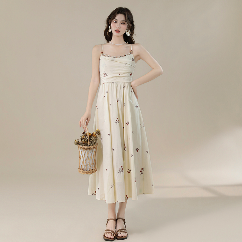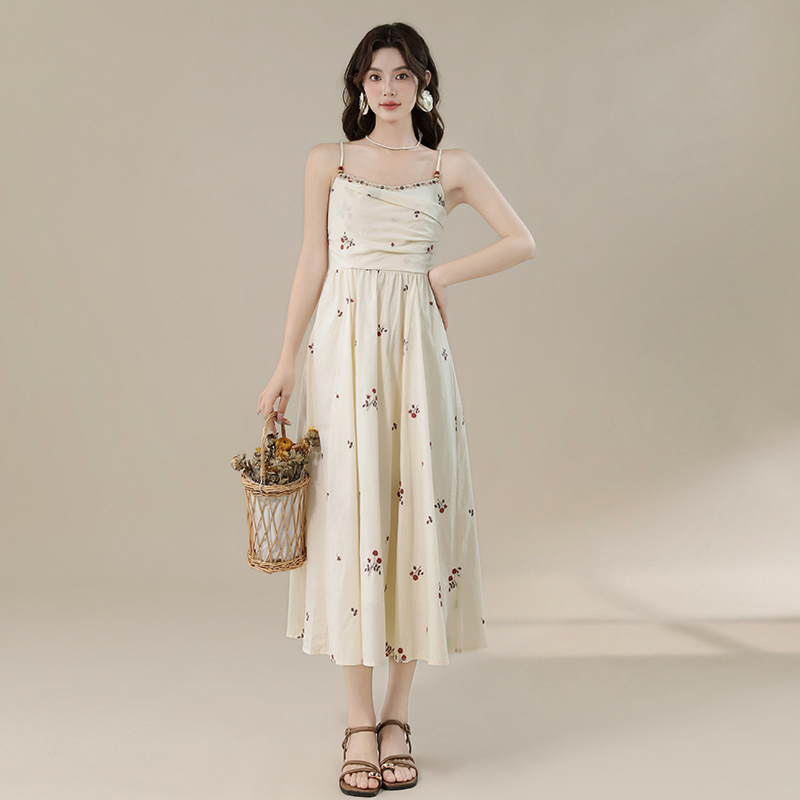 BY16698# 南法假日田园风法式甜美小清新刺绣碎花吊带长款连衣裙