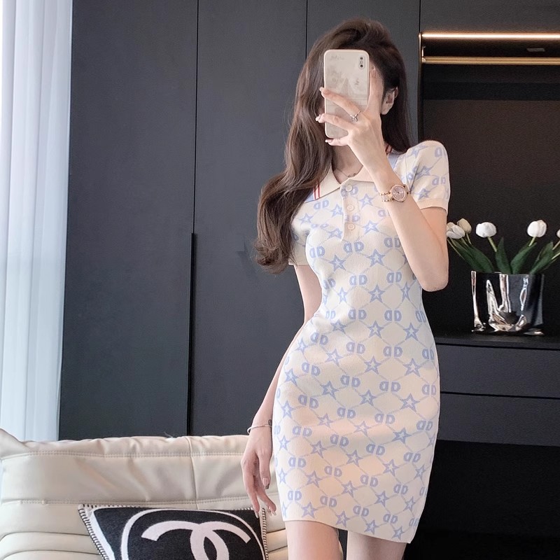 BY16716# 法式针织连衣裙女新款夏季时尚气质休闲修身显瘦polo领连衣裙
