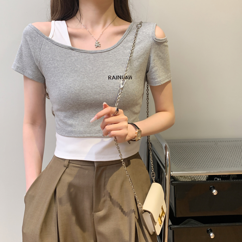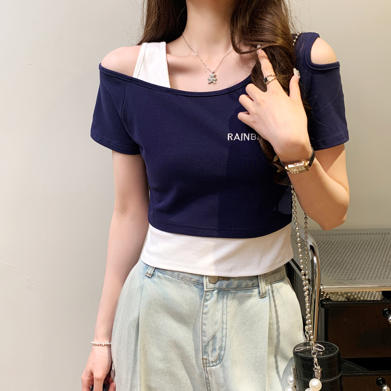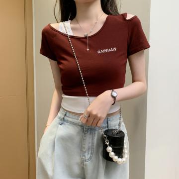 BY16753# 假两件露肩短袖T恤女设计感小众短款高腰露脐修身上衣