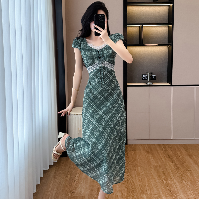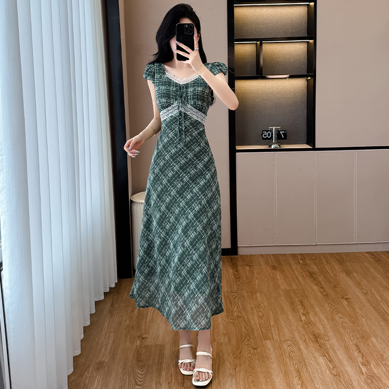 BY16774# 法式茶歇裙小飞袖格子连衣裙女夏季气质蕾丝收腰绿色长裙