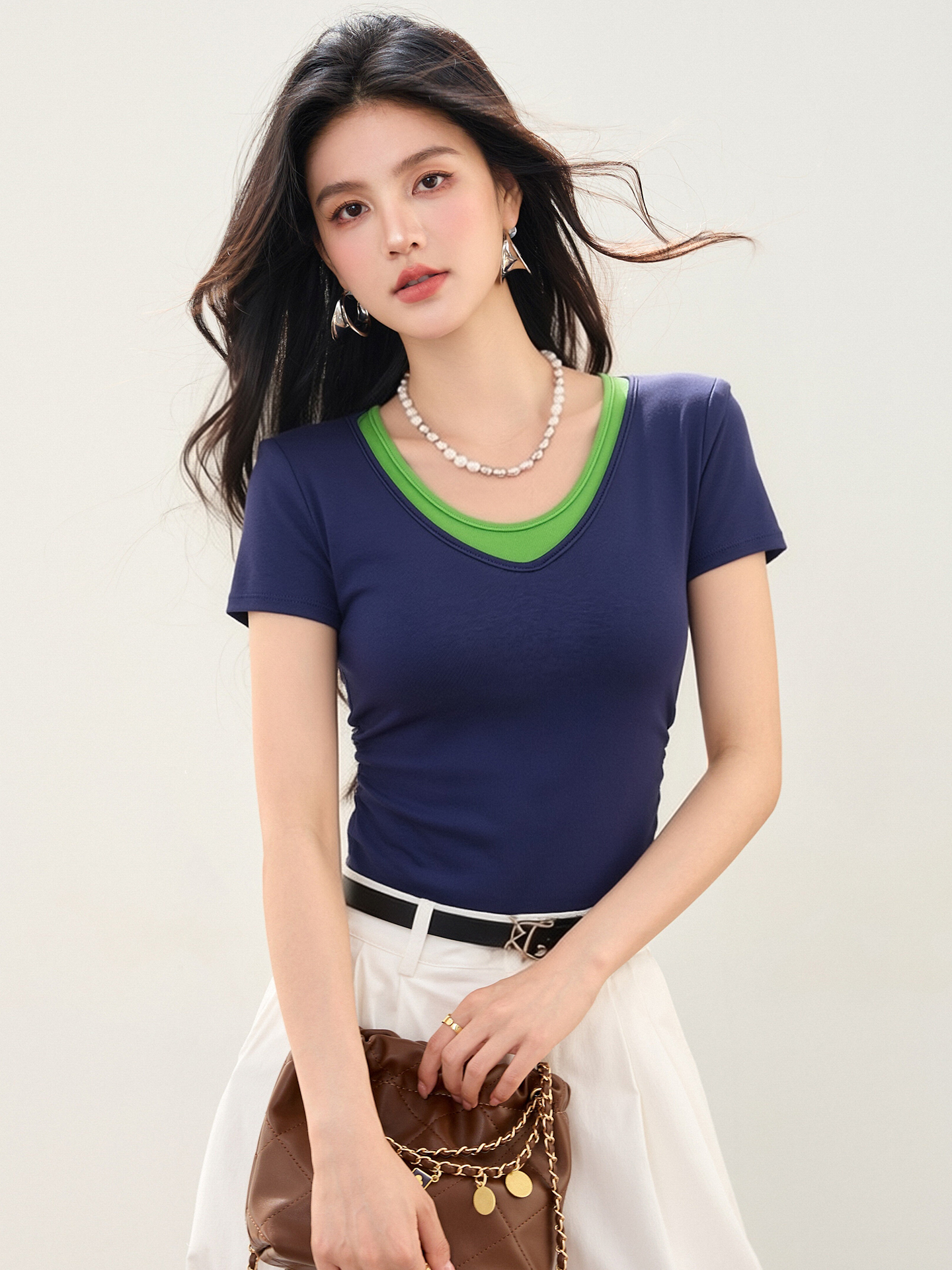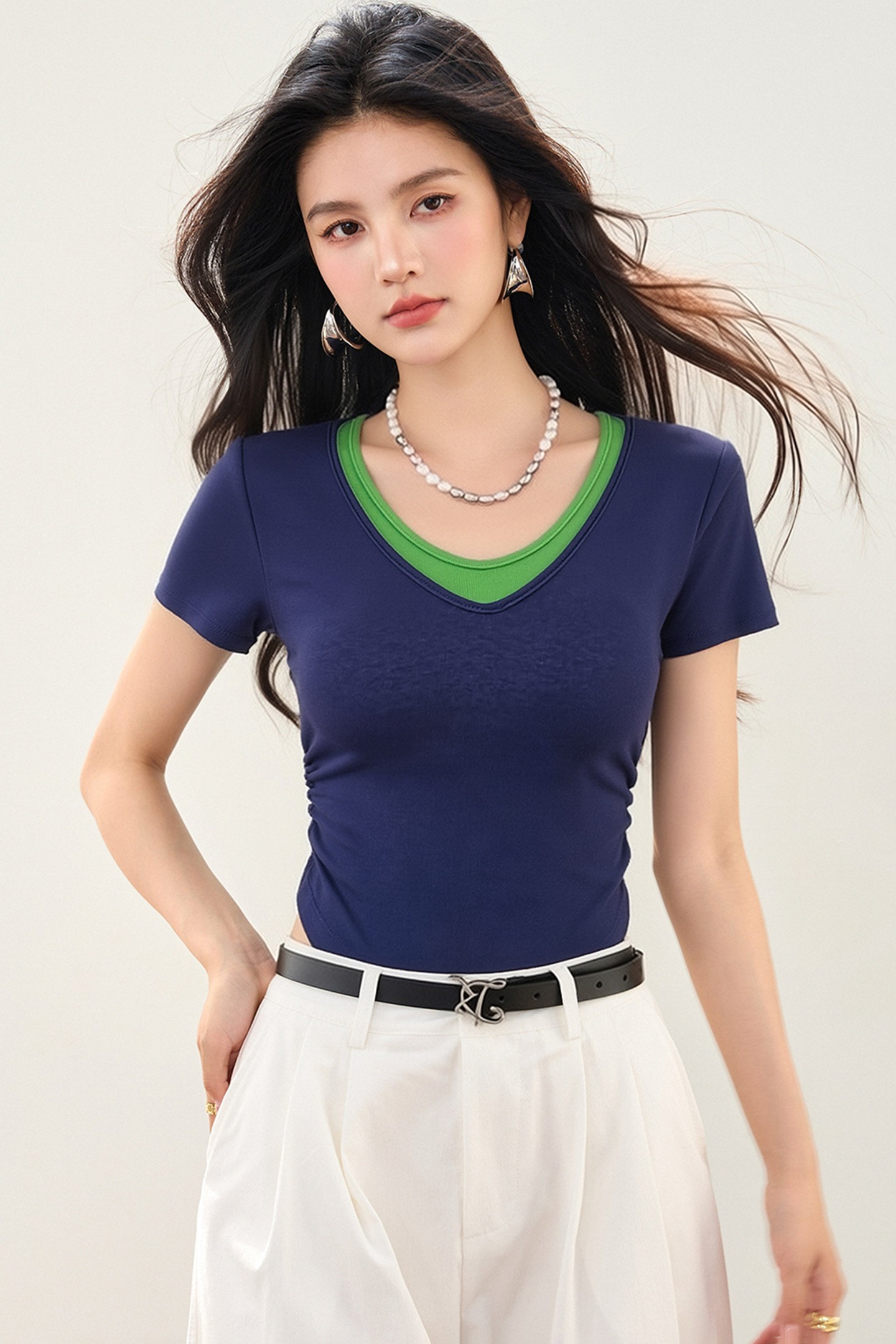BY16955# 复古高街V领撞色假两件修身短袖美式带胸垫褶上衣 服裝批發女裝批發服飾貨源