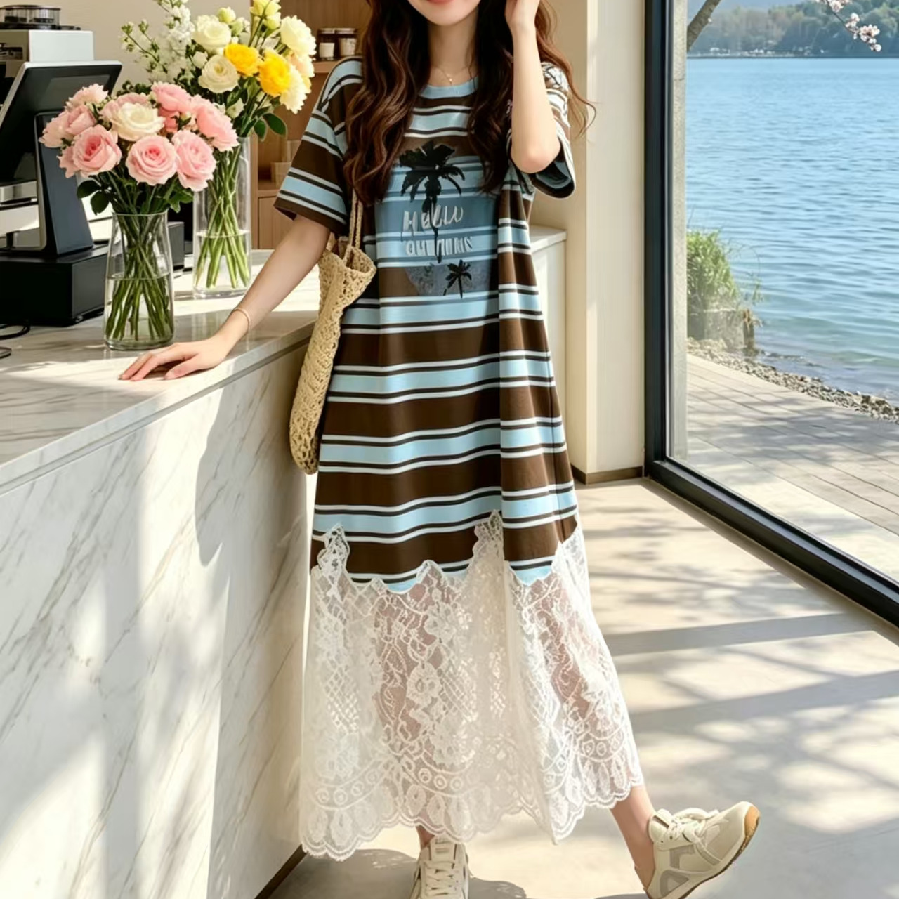 BY17192# 新款蕾丝拼接蓝色条纹连衣裙休闲流行爆款假两件针织连衣裙