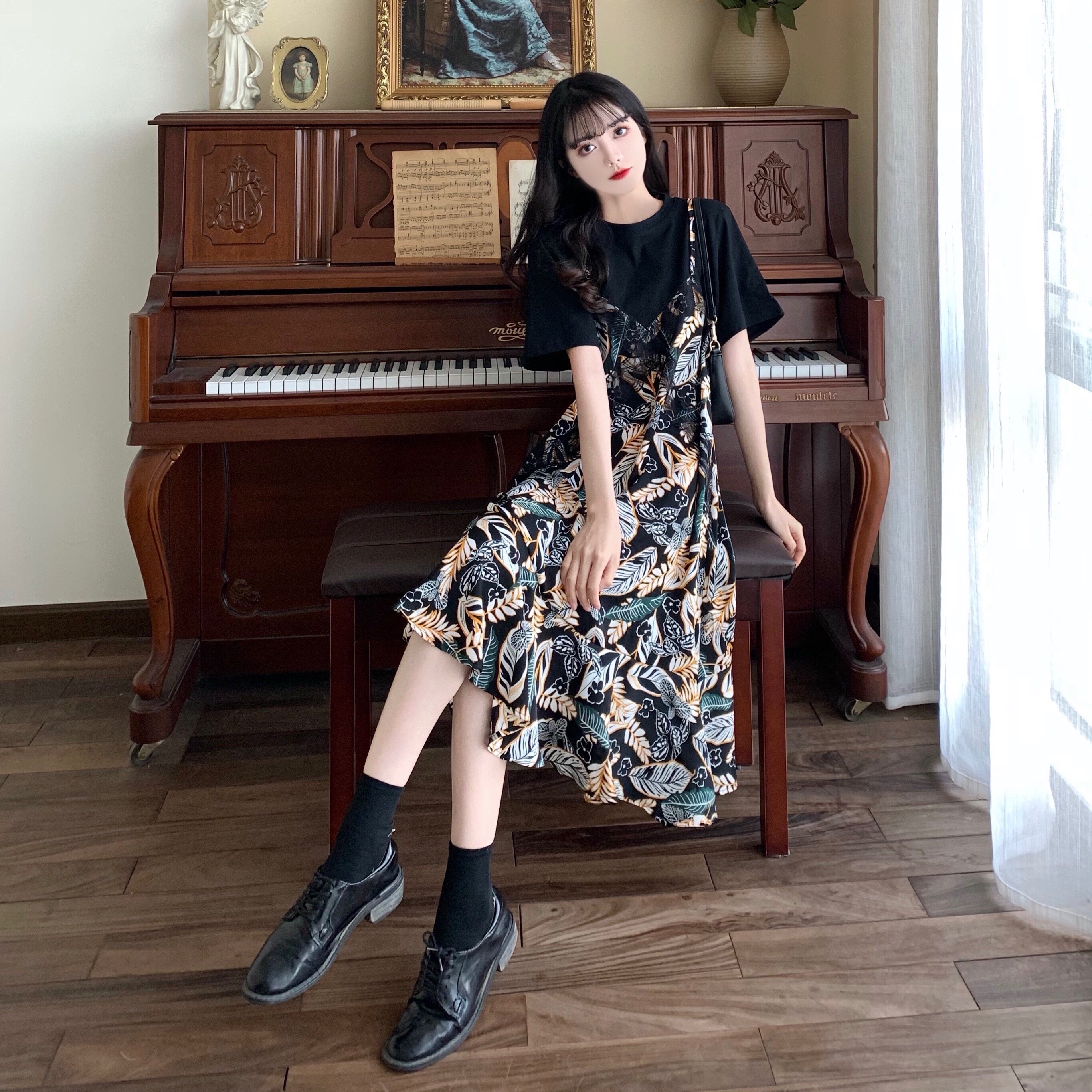 BY17193# 胖mm假两件连衣裙大码女装夏季新款韩版宽松显瘦遮肚子雪纺裙