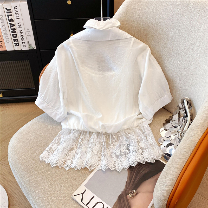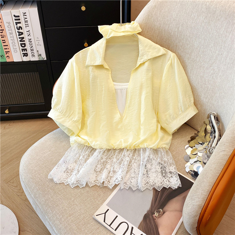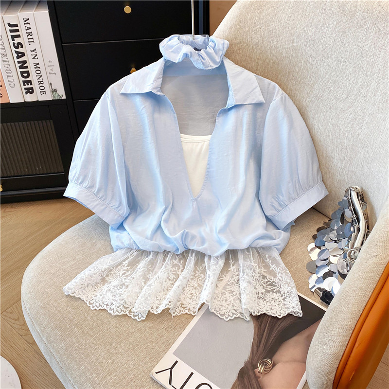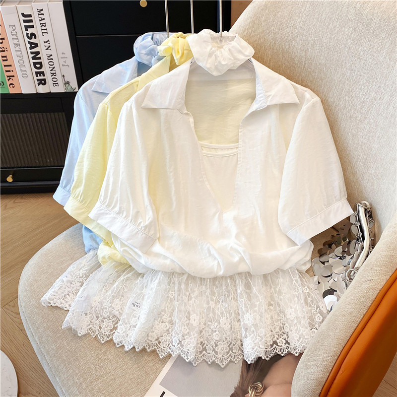 Home > 短袖雪纺衫、衬衫、上衣 > BY17210# 夏季韩版时尚气质宽松型设计感假两件套蕾丝拼接下摆带头花