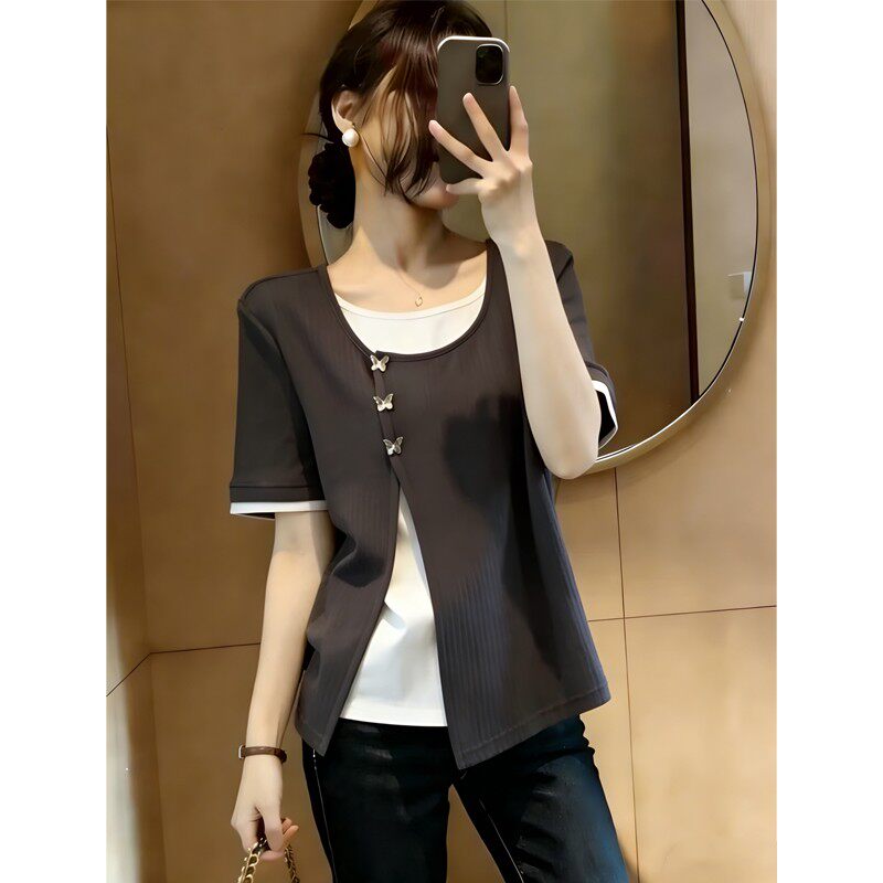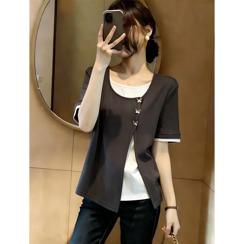 BY17254# 复古撞色蝴蝶拼接假两件短袖T恤女夏大码胖mm设计感休闲显瘦上衣