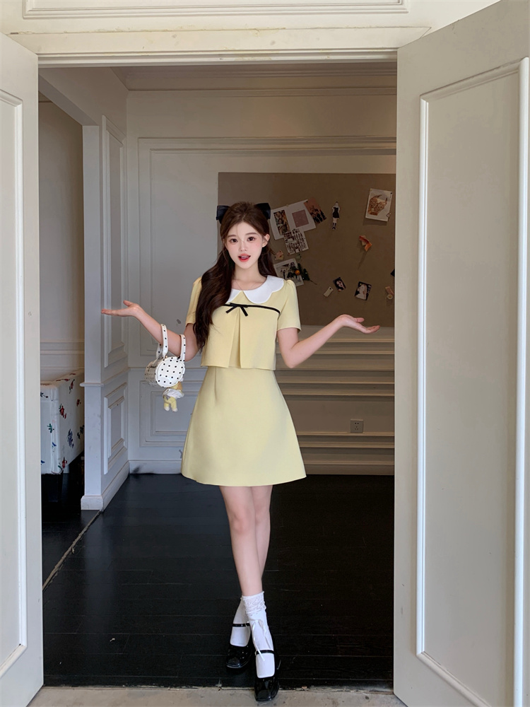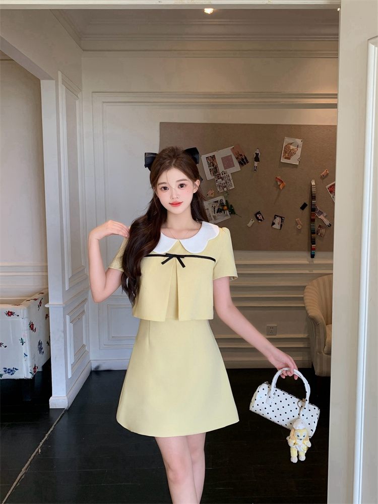 BY17341# 黄色小香风甜美圆领短袖连衣裙女夏季新款名媛气质假两件a字短裙