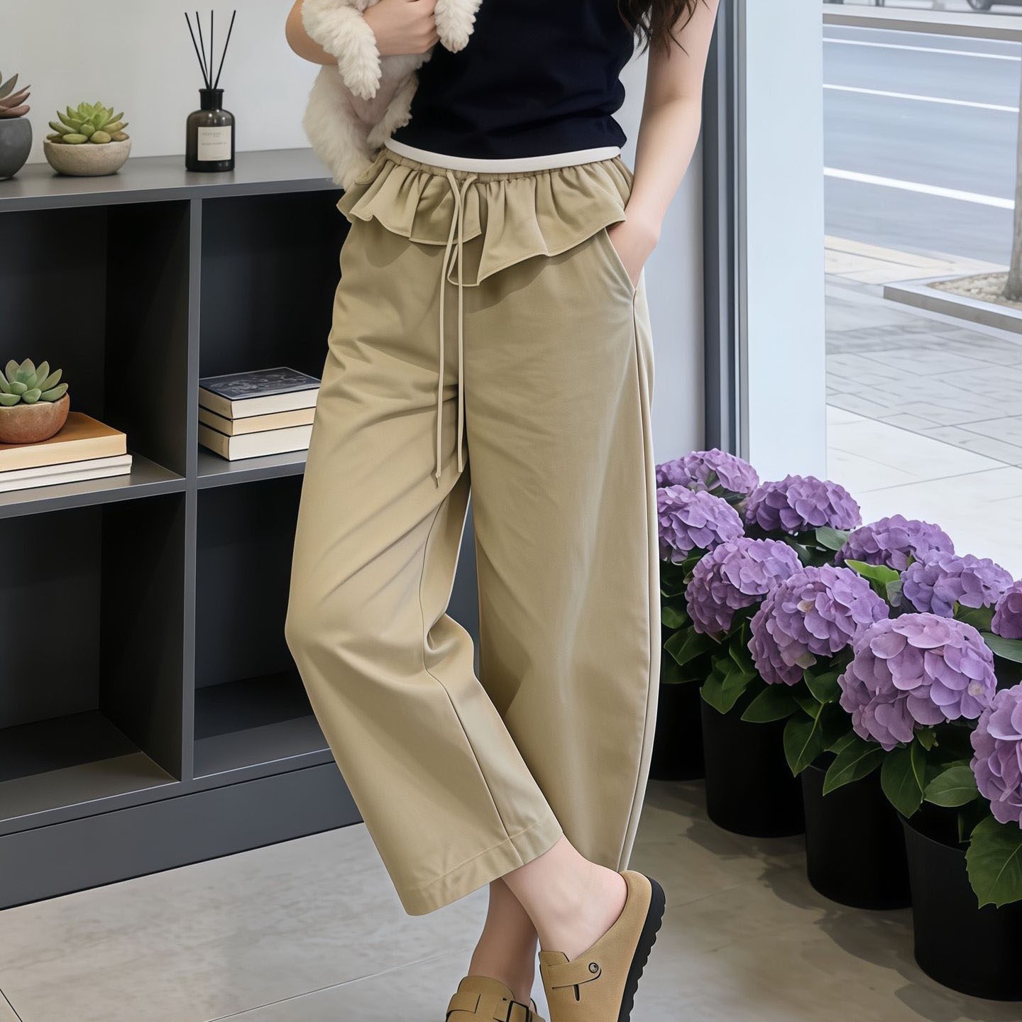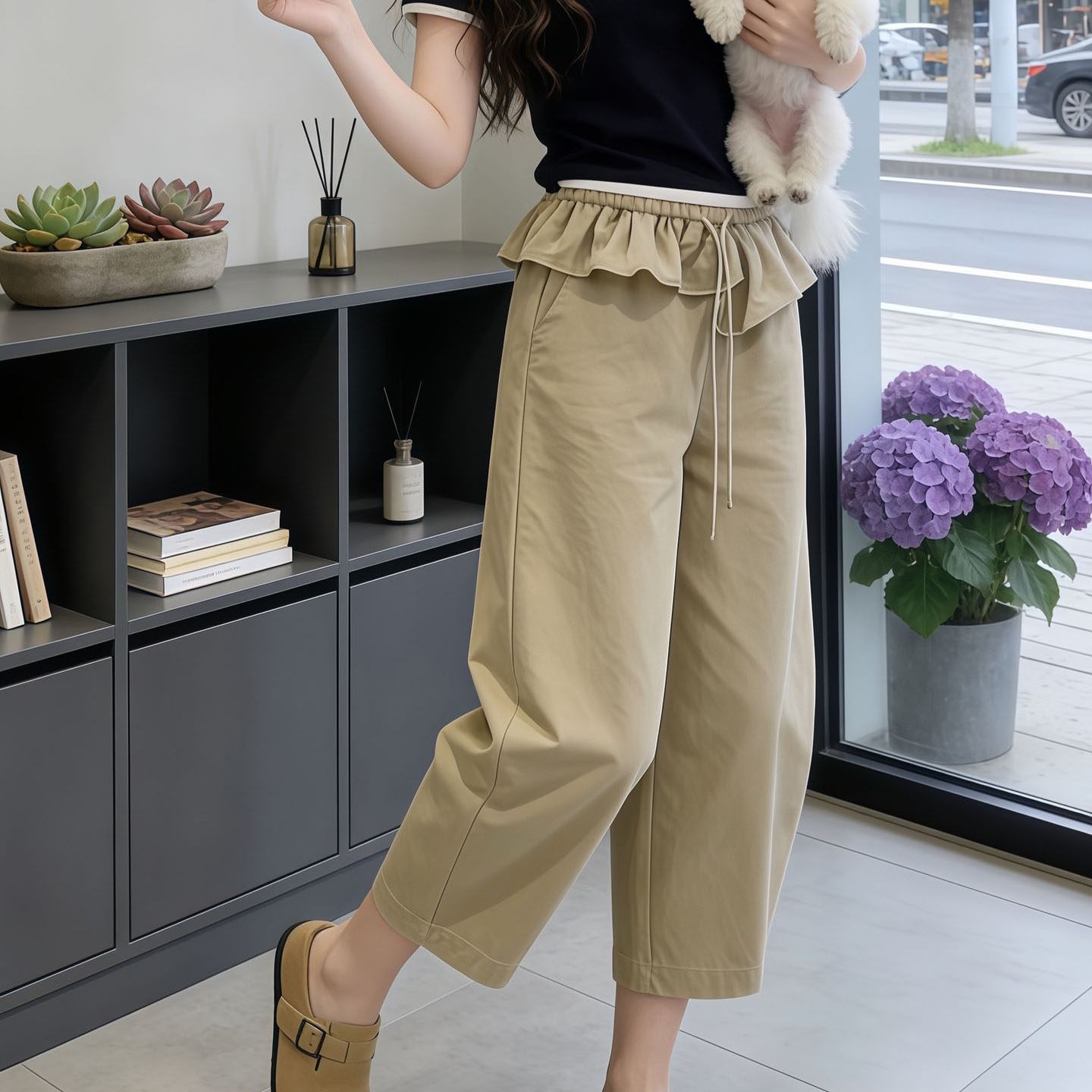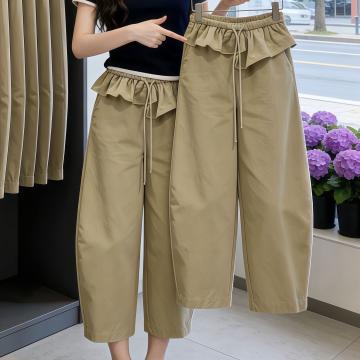 BY17767# 卡其色荷叶腰头八分弯刀阔腿裤女春夏流行新款高腰显瘦休闲裤 服裝批發女裝批發服飾貨源