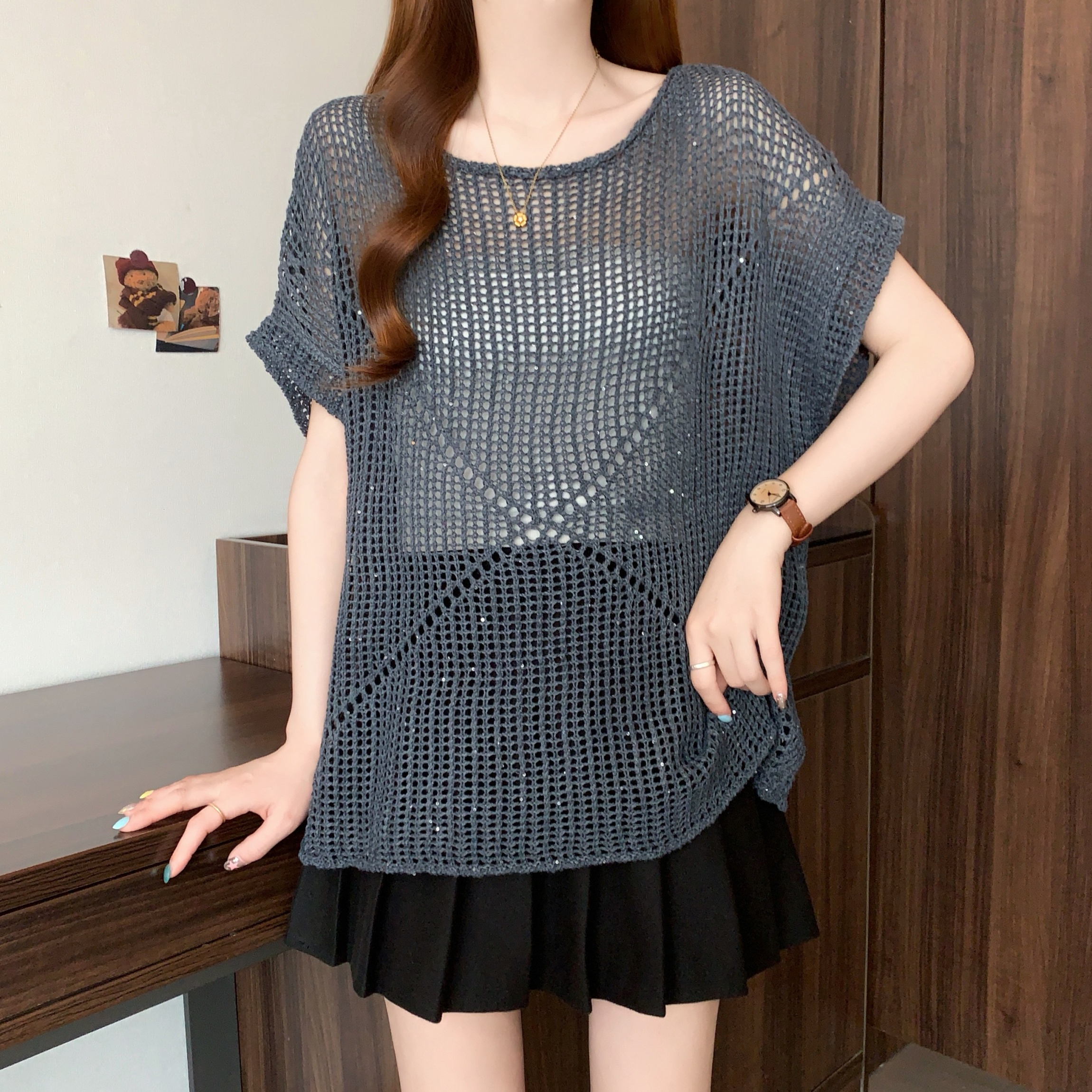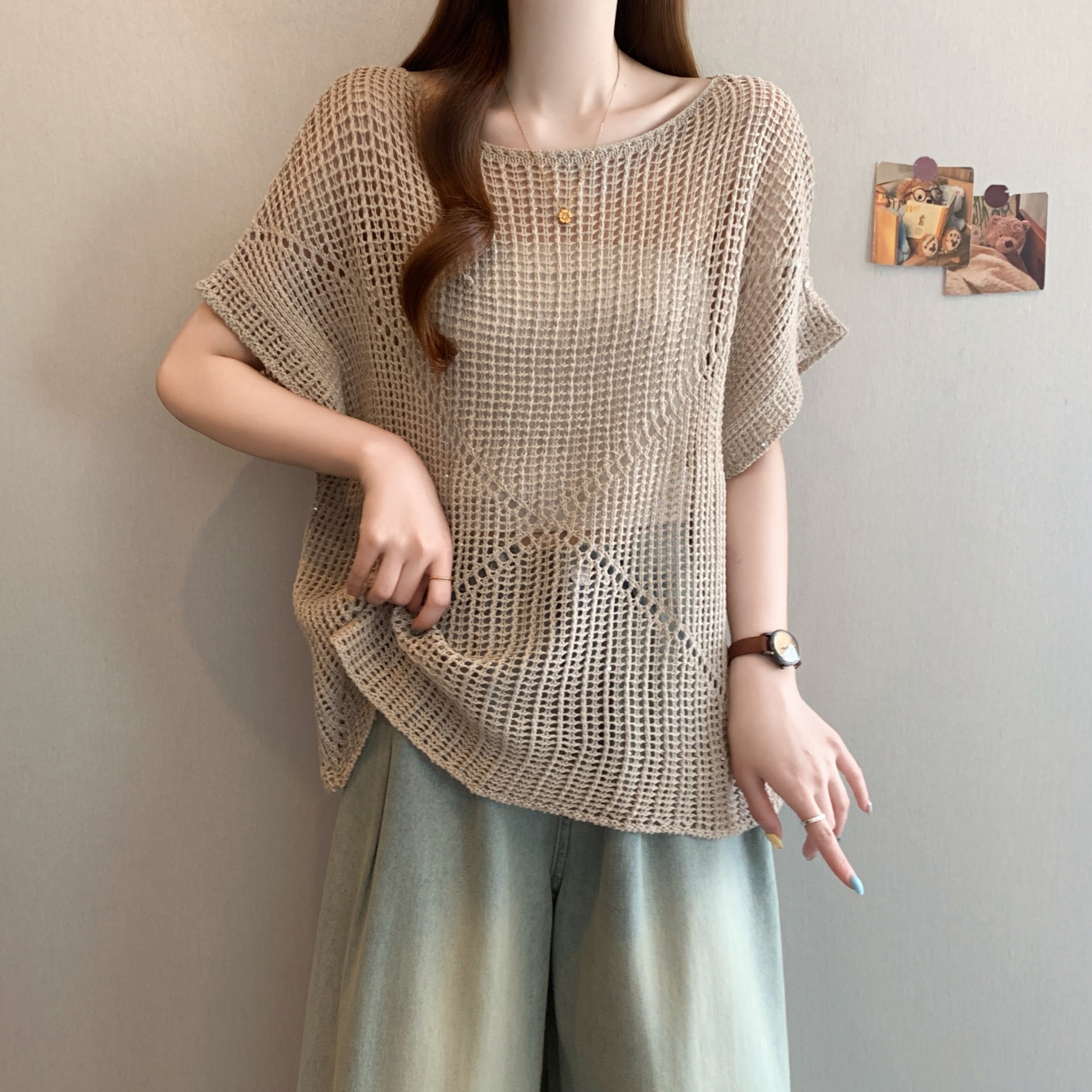 BY18950# 大码慵懒风圆领镂空短袖针织罩衫女夏新款气质宽松显瘦上衣 服裝批發女裝批發服飾貨源