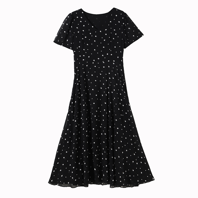 BY19112# 圆点波点雪纺中长款修身显瘦黑色气质大码女装胖mm短袖连衣裙子夏 服裝批發女裝批發服飾貨源