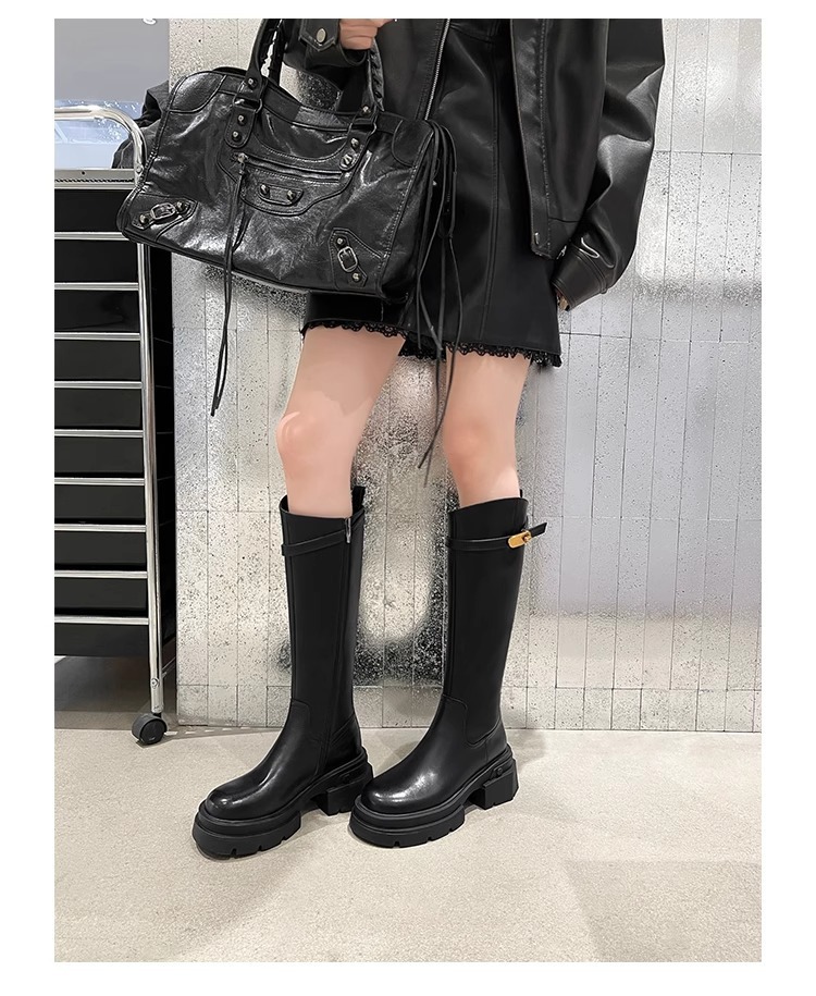 X-32028# 圆头厚底高筒靴女秋冬新款侧拉链松糕骑士靴小个子增高不过膝长靴 鞋子批發女鞋批發鞋子靴子貨源