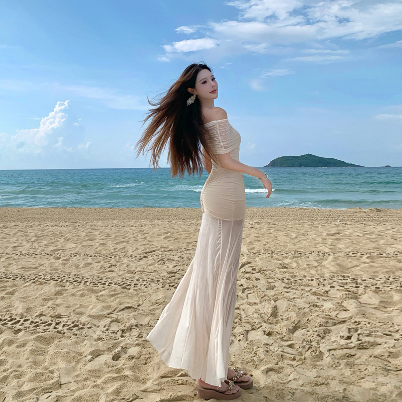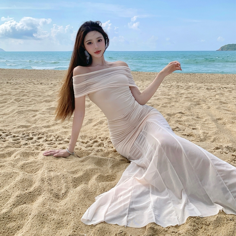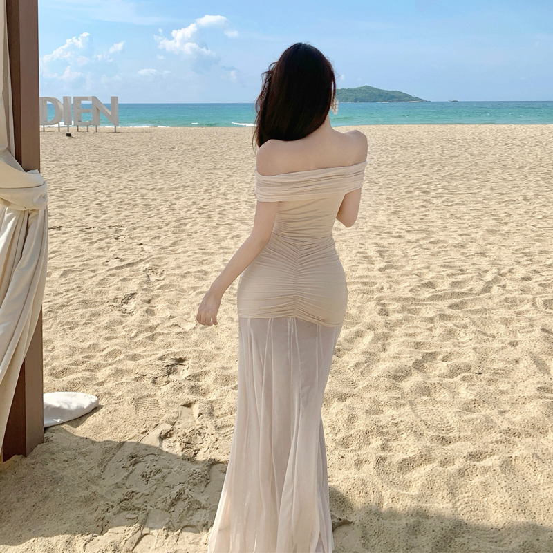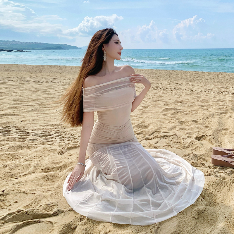 FA35037# 气质网纱一字领露肩包臀长裙修身性感时尚连衣裙 服裝批發女裝批發服飾貨源