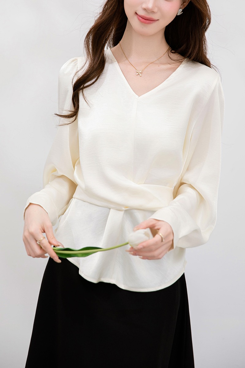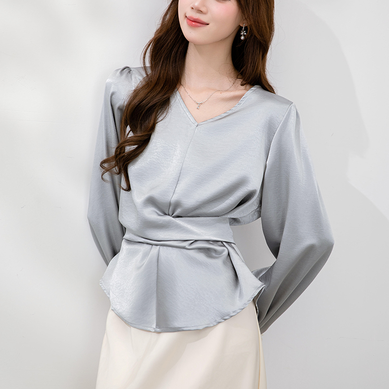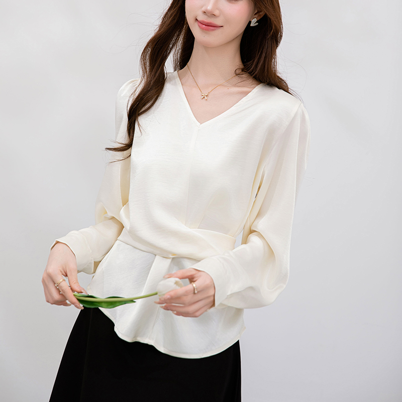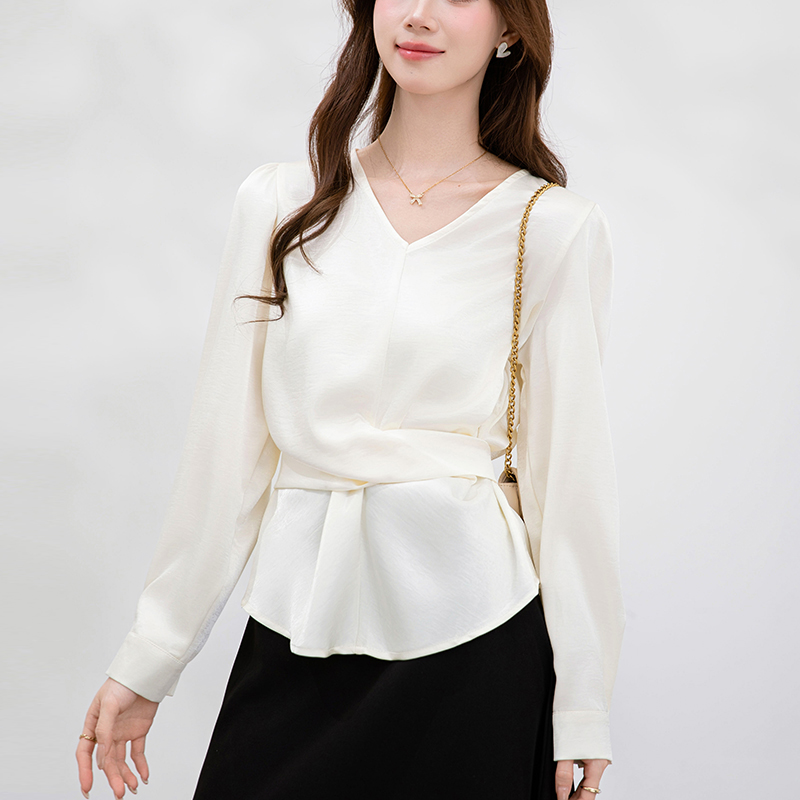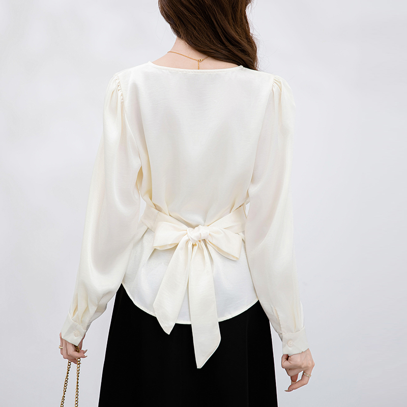 FA36129# 秋季新款韩版百搭后系带长袖缎面衬衫女上衣秋 服裝批發女裝批發服飾貨源