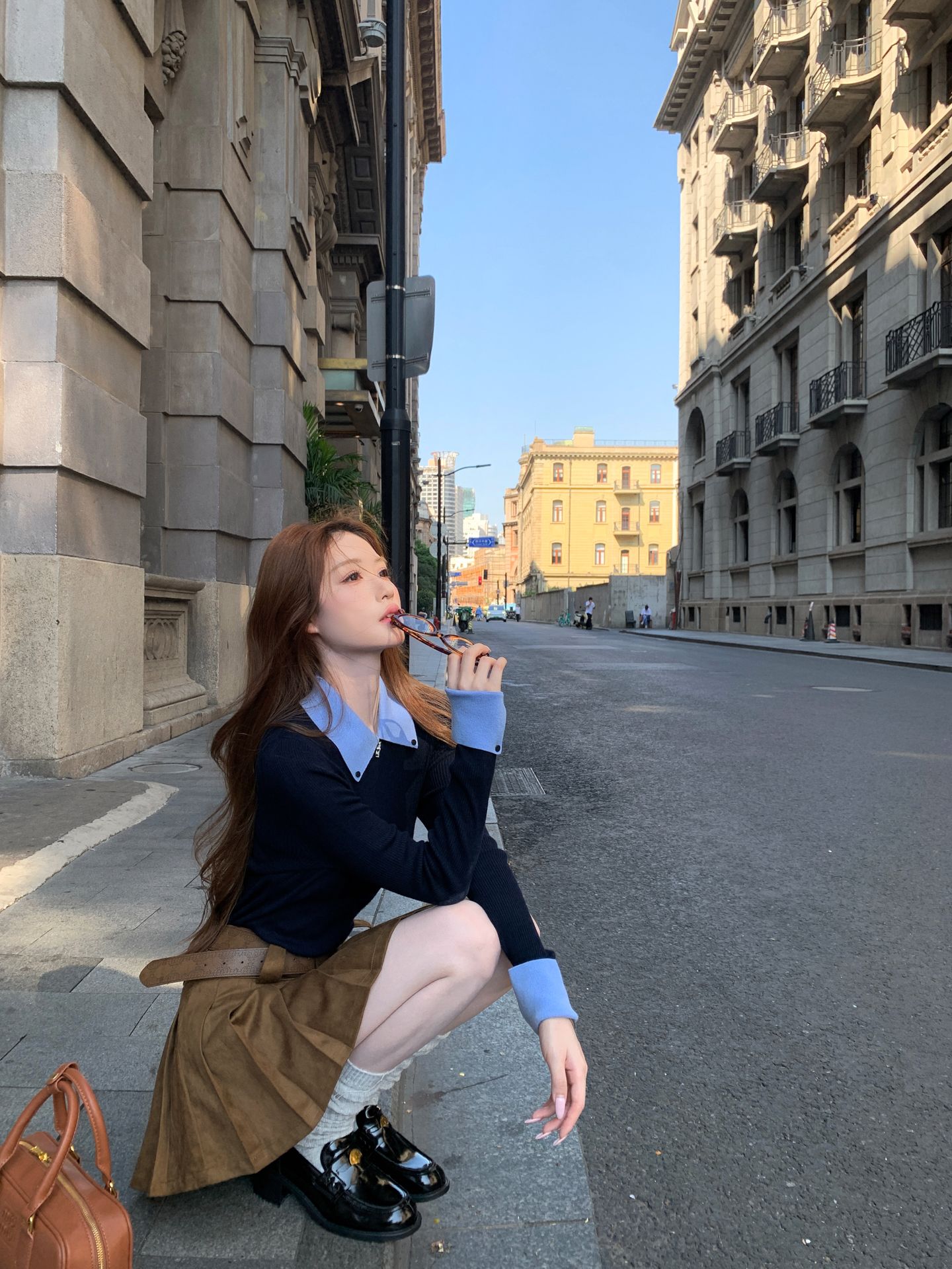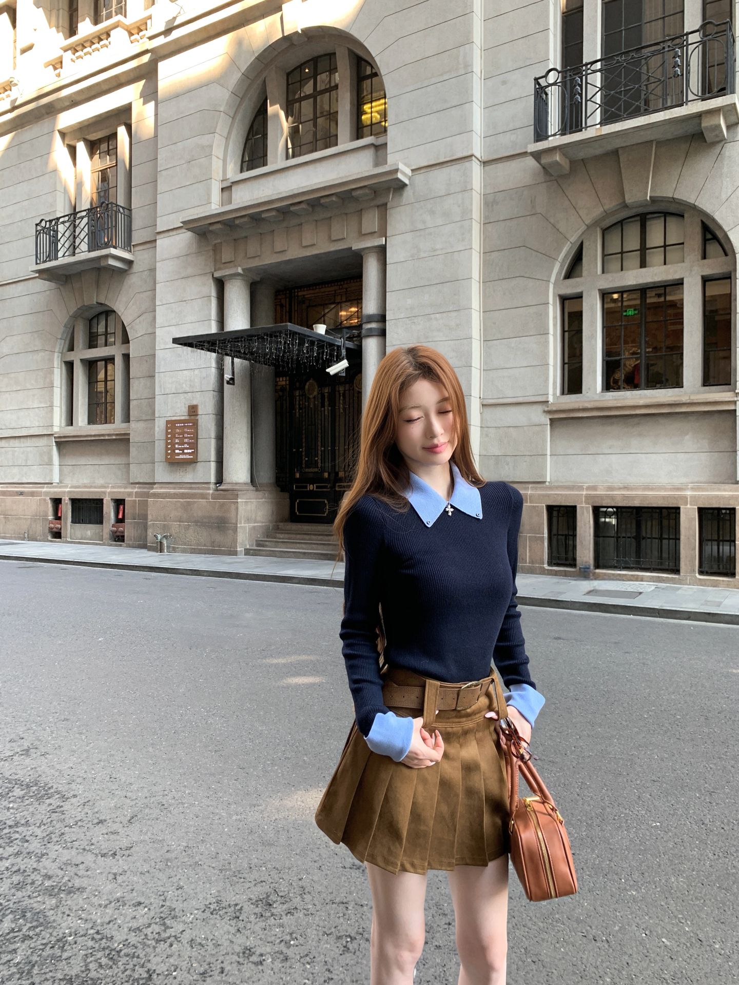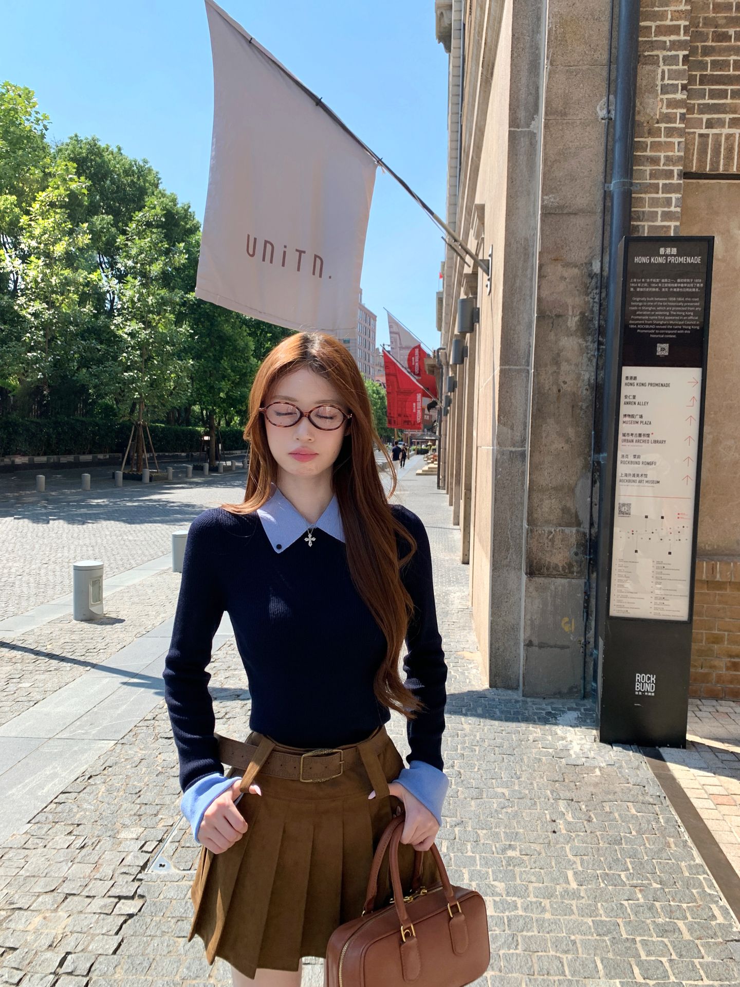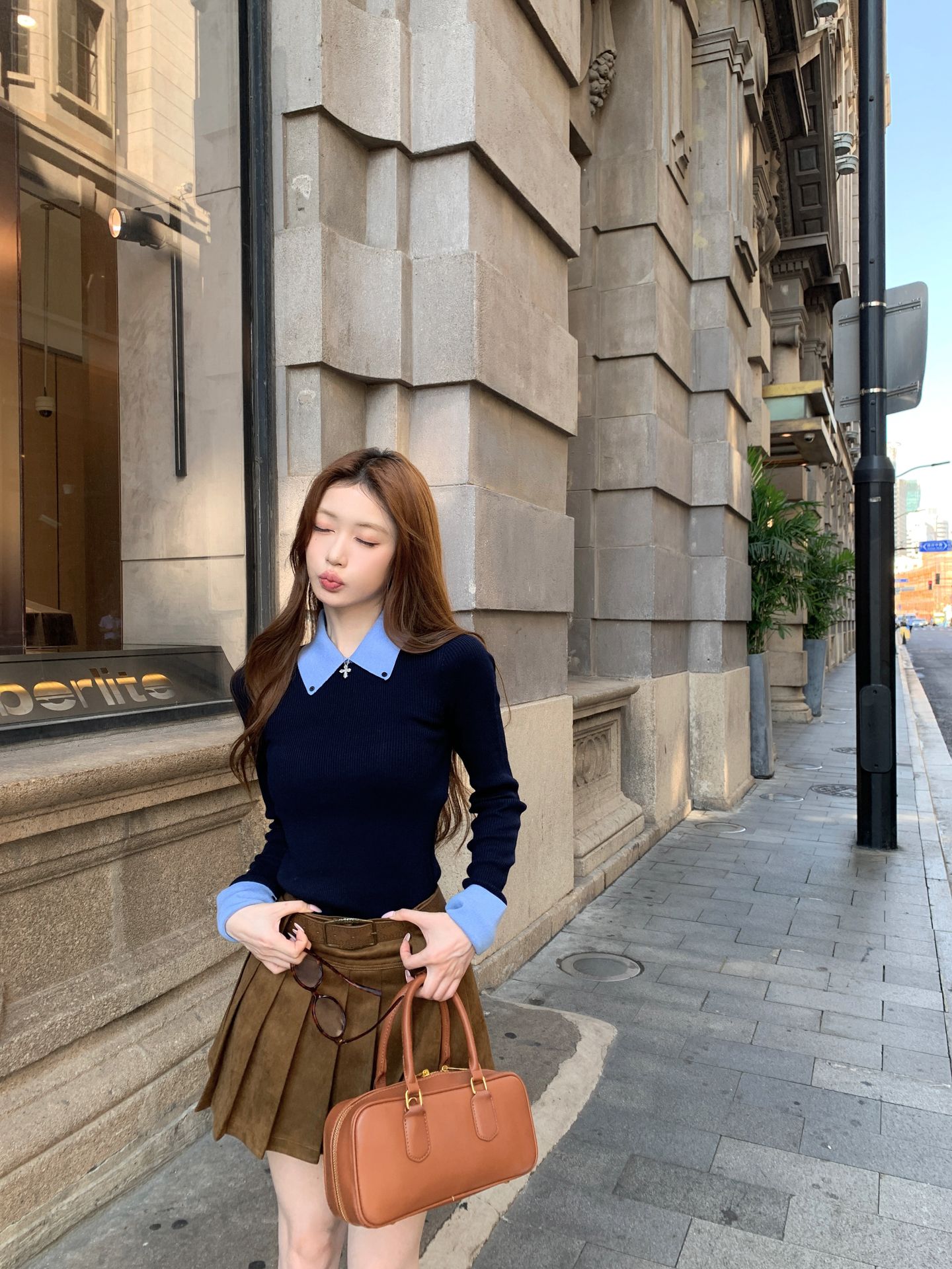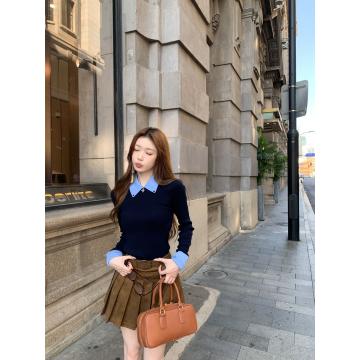 FA49248# 假两件翻领长袖针织衫女新款今年流行爆款秋冬穿搭打底衫上衣 服裝批發女裝批發服飾貨源
