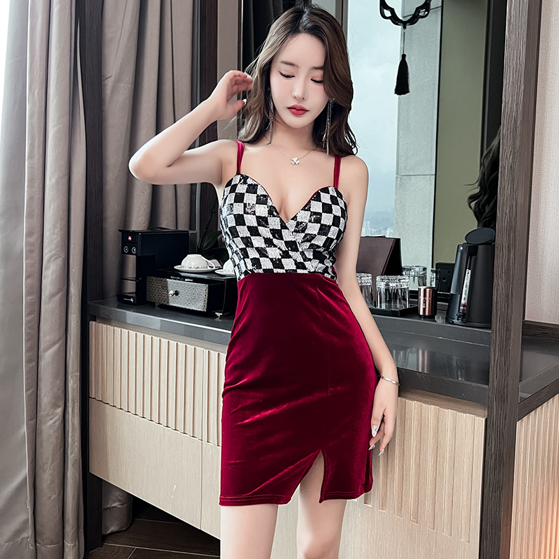 FA49304# 款性感低胸格子吊带金丝绒包臀吊带连衣裙