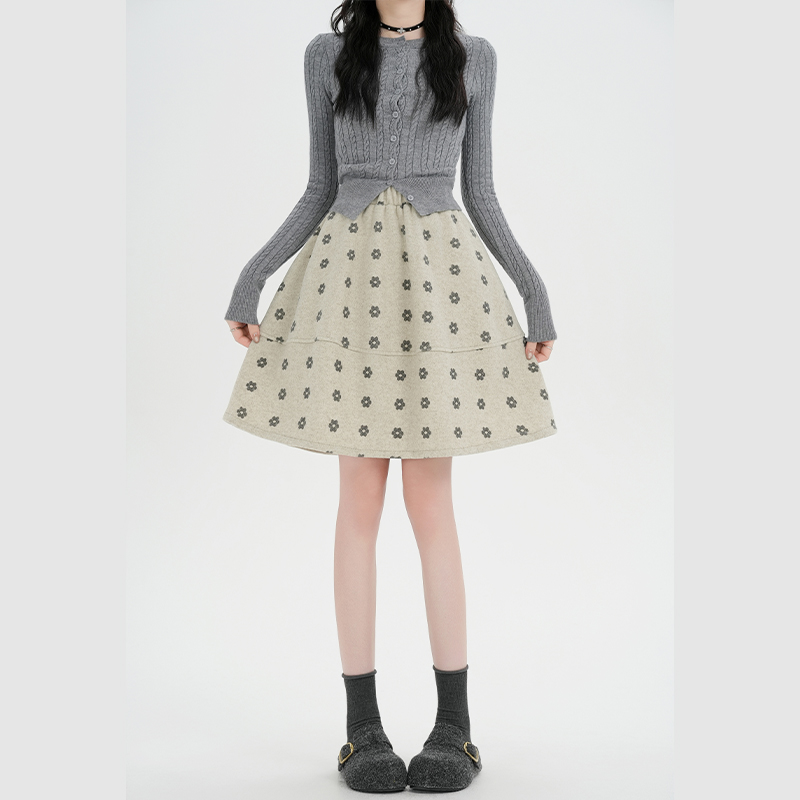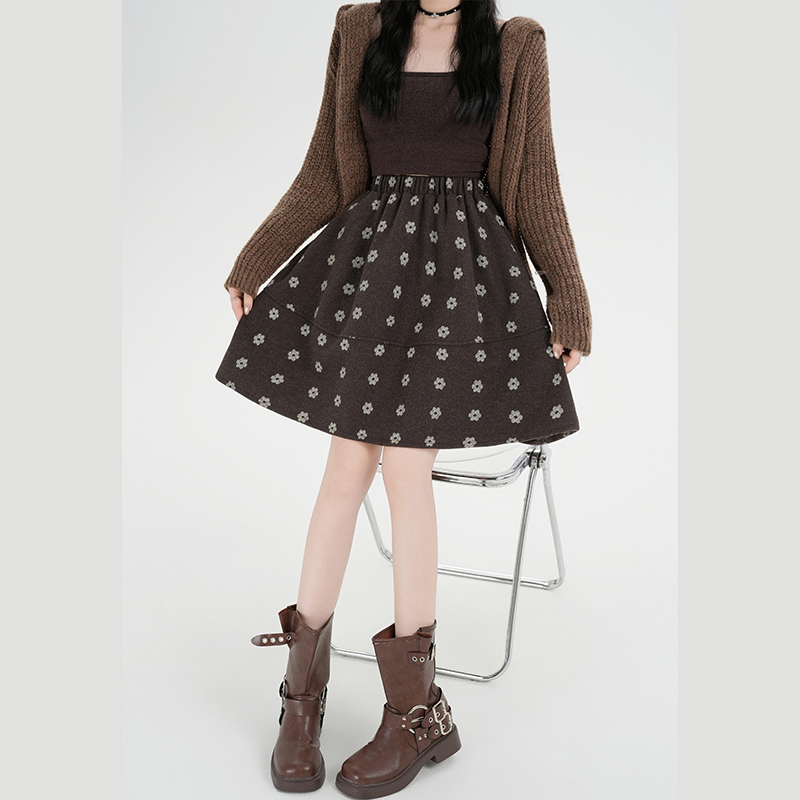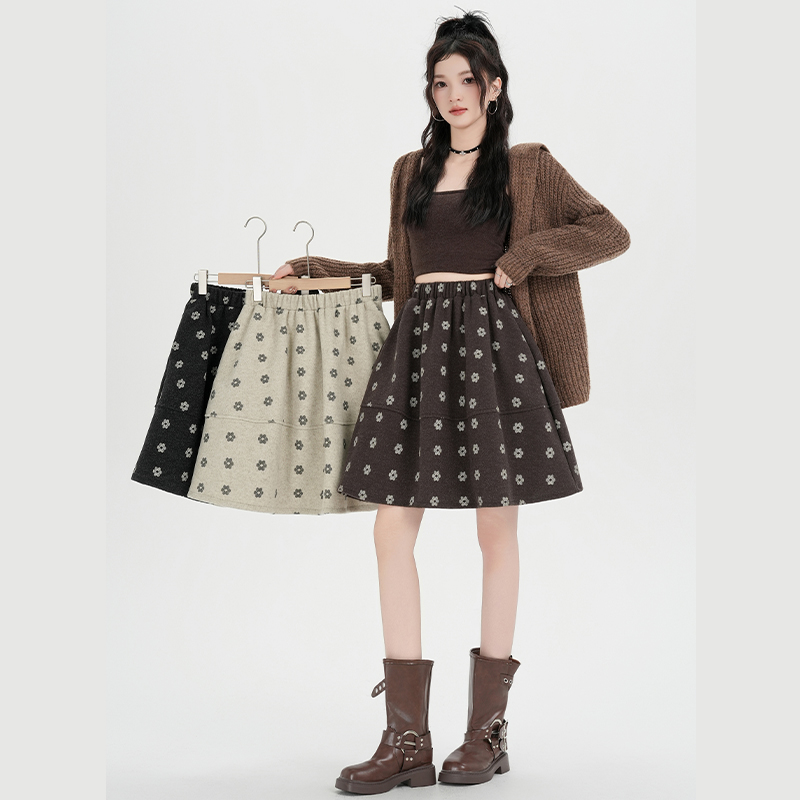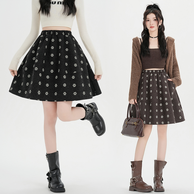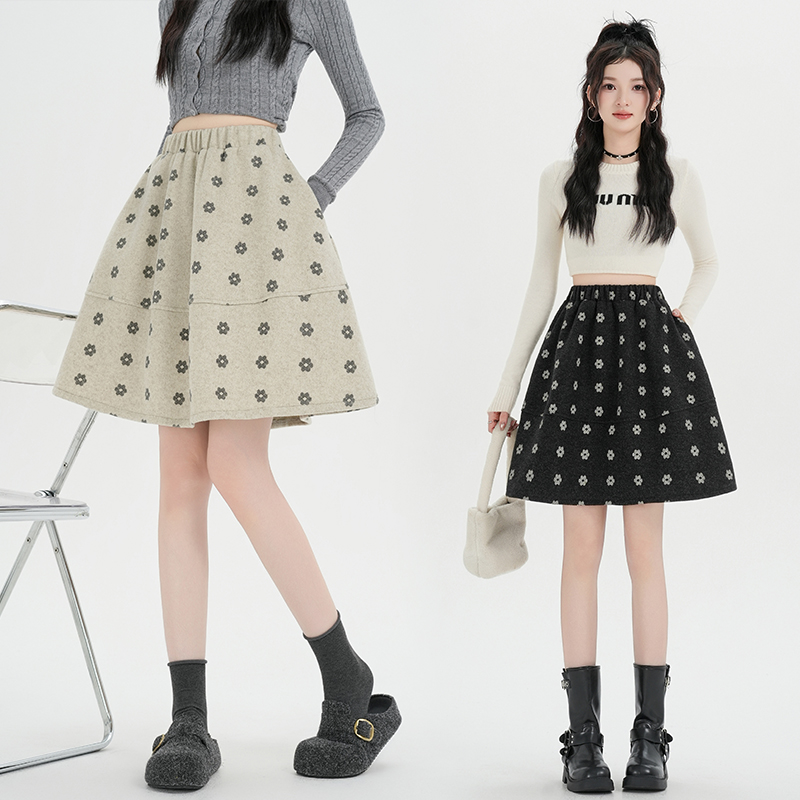 FA50194# 韩系松紧腰花朵毛呢印花半身裙女秋冬新款百搭A字中裙 服裝批發女裝批發服飾貨源