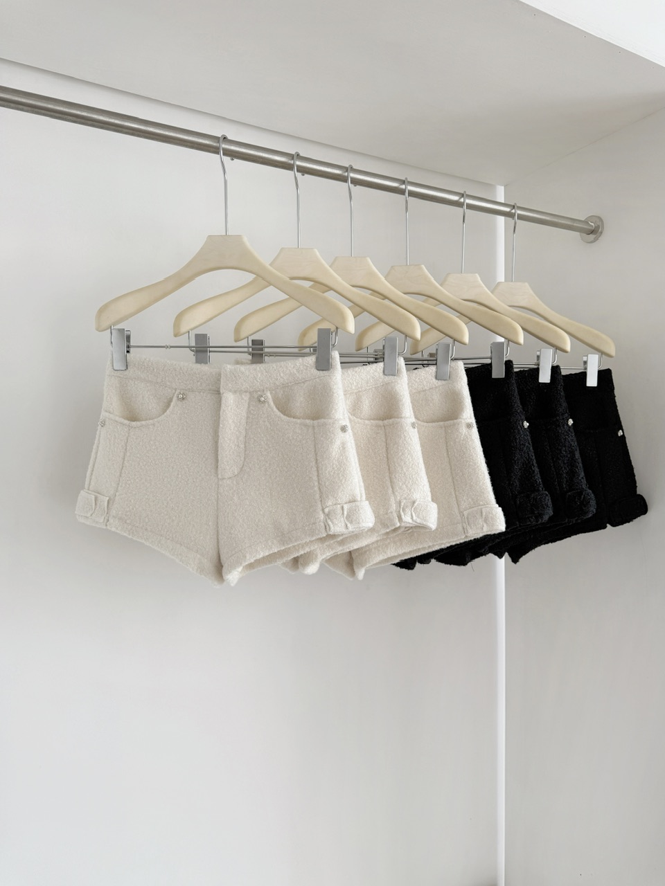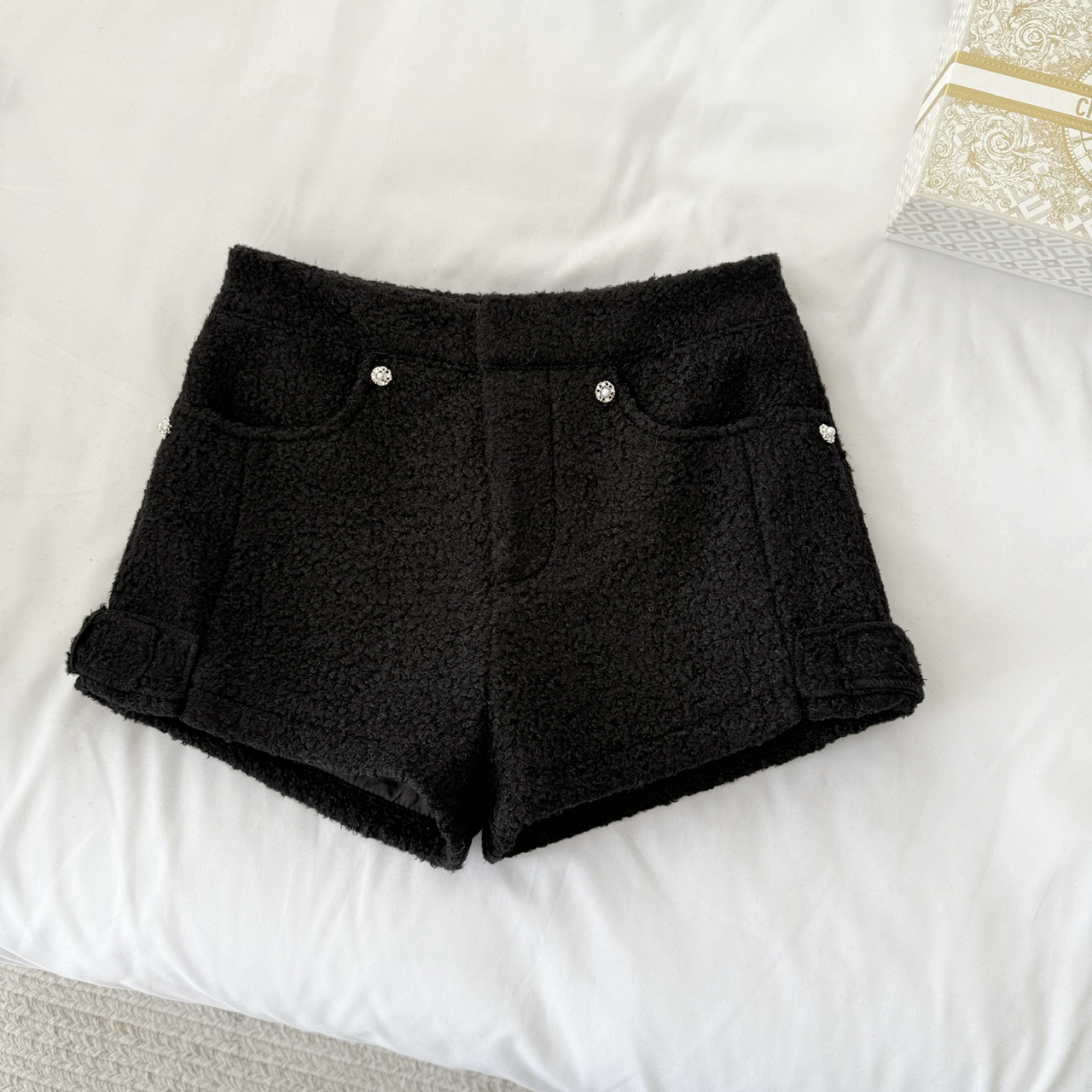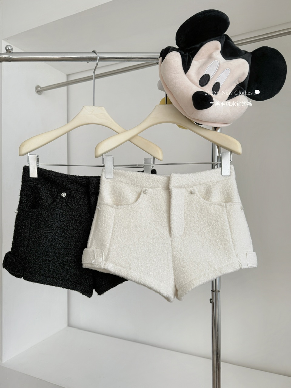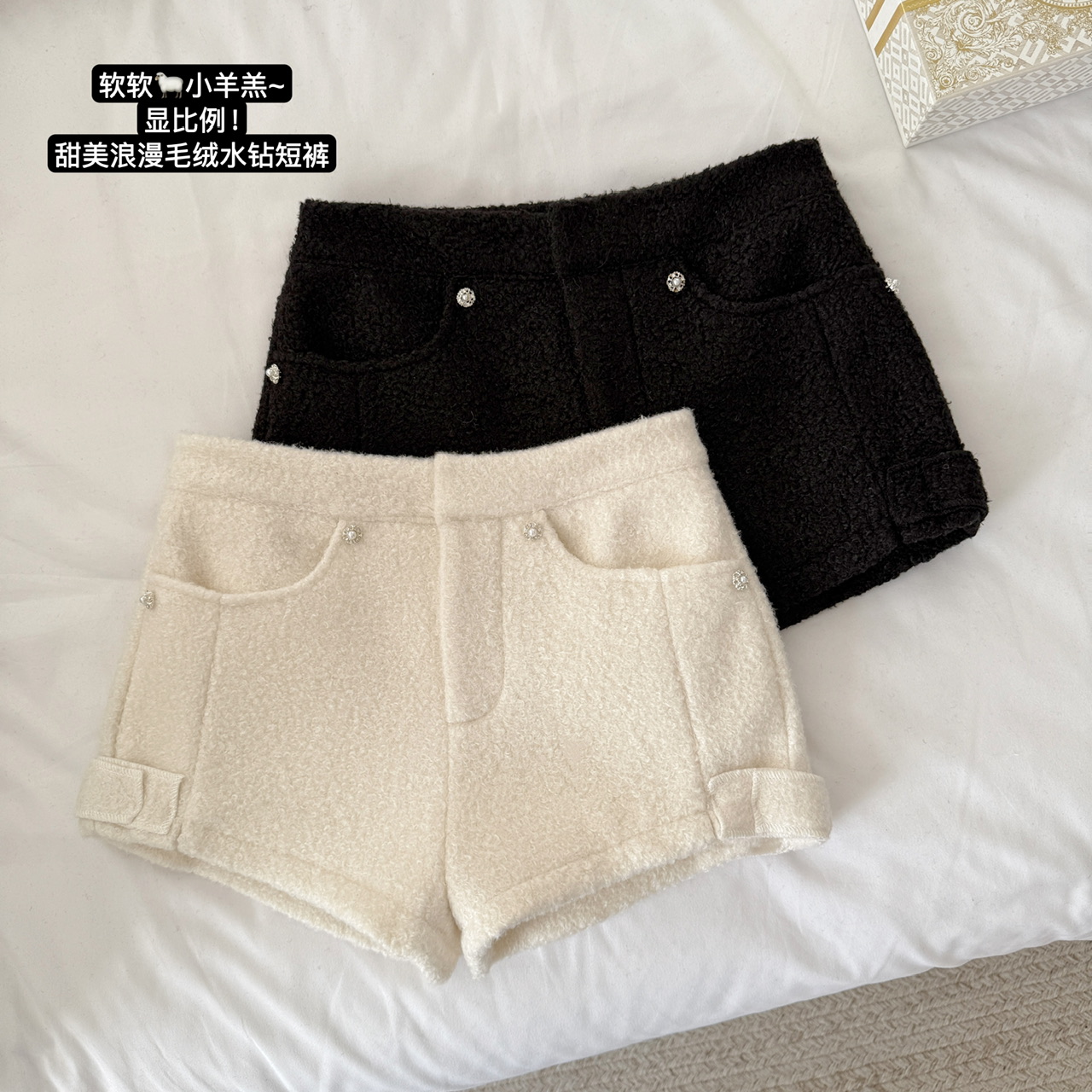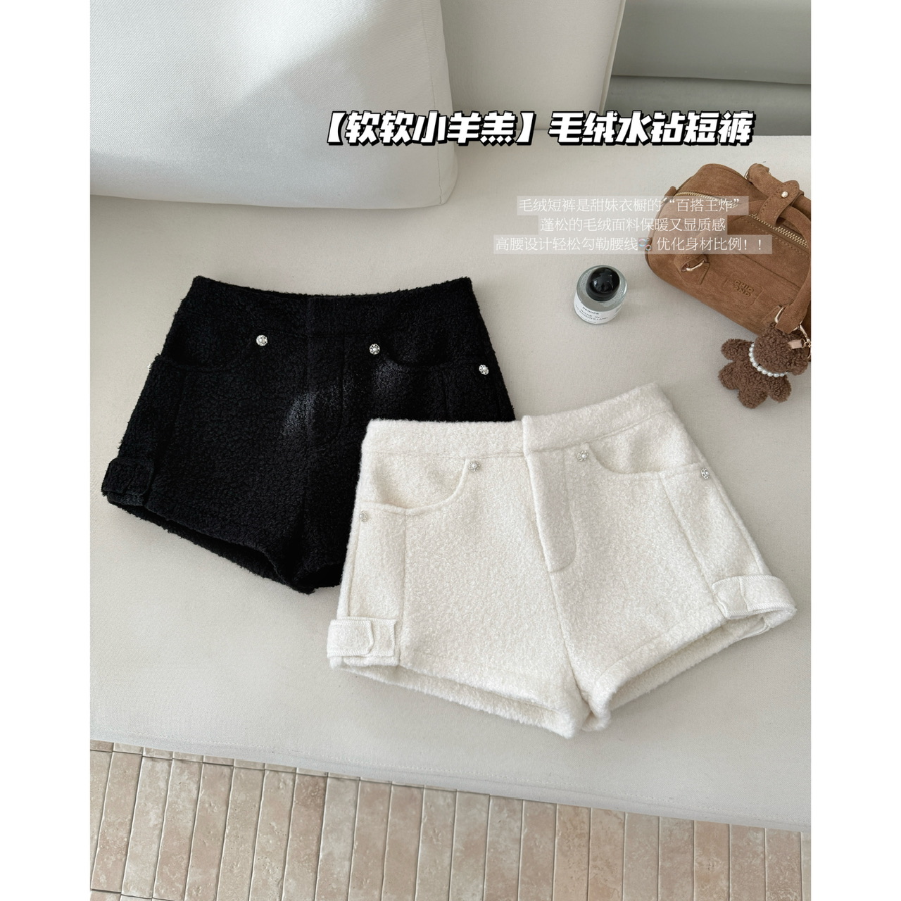 FA50299# 软软小羊羔显比例甜美浪漫白色毛绒高腰水钻短裤女 服裝批發女裝批發服飾貨源