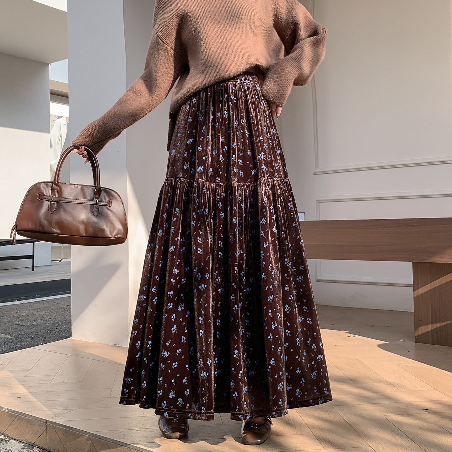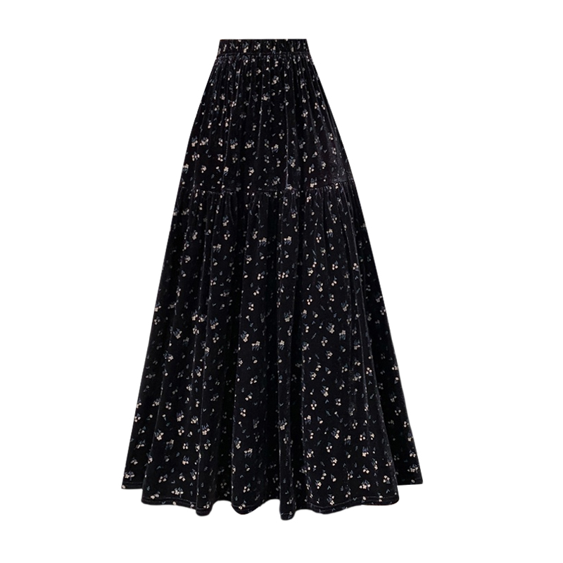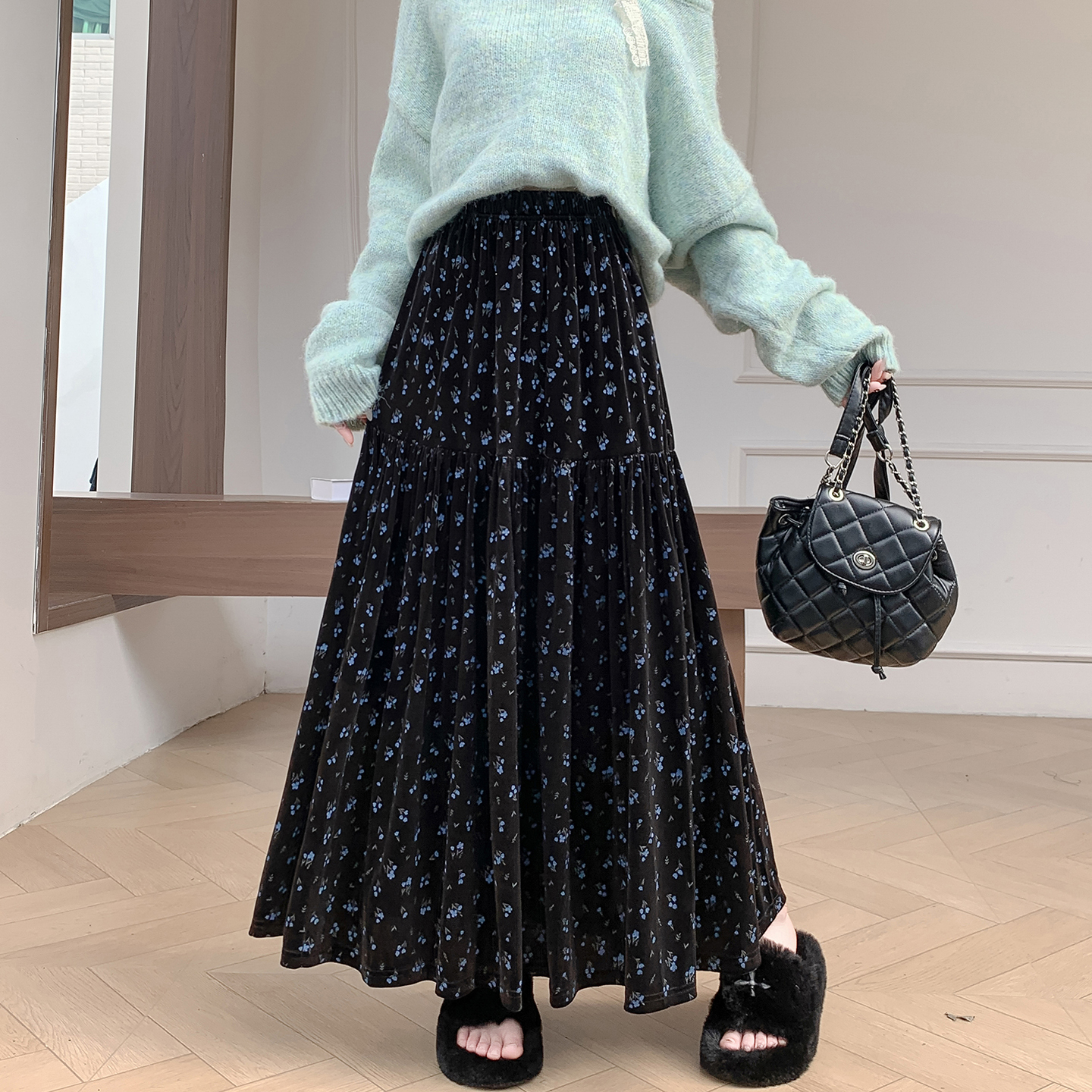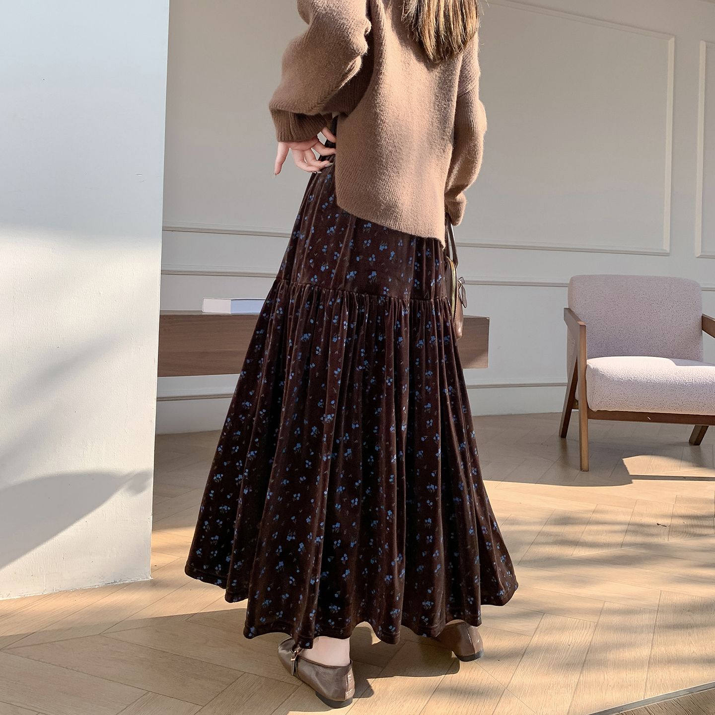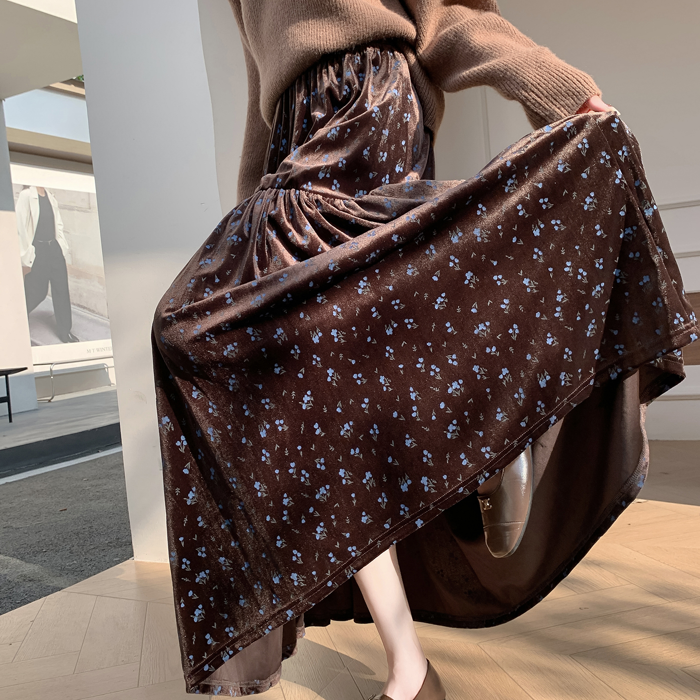 FA50315# 新款复古金丝绒碎花半身裙女秋冬季高腰显瘦a字伞裙休闲长裙 服裝批發女裝批發服飾貨源