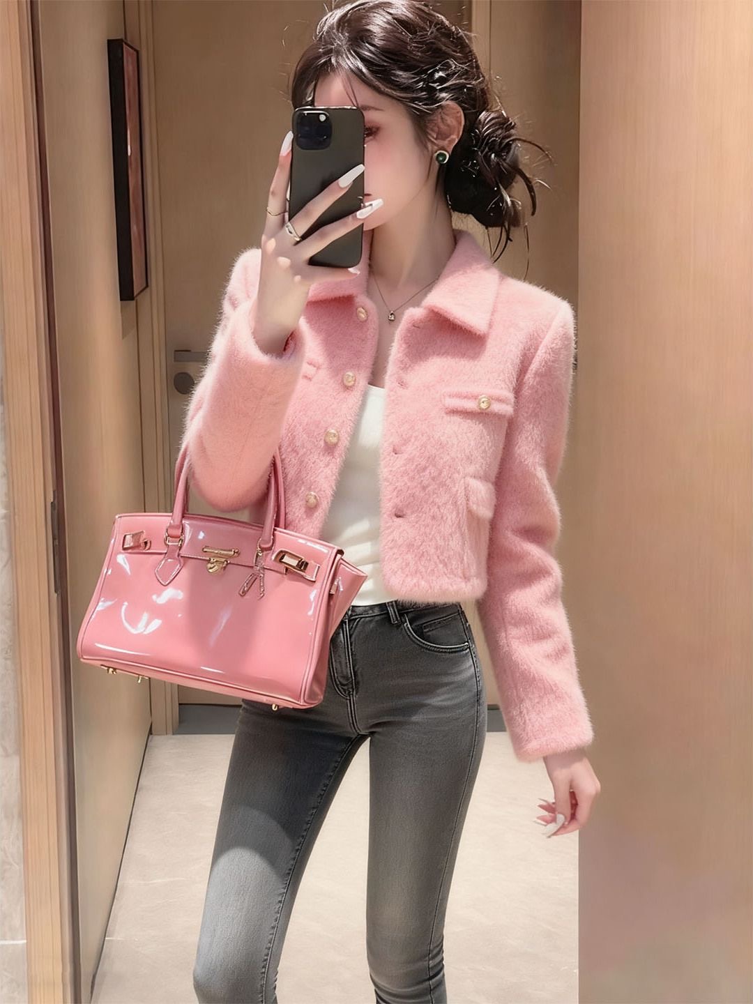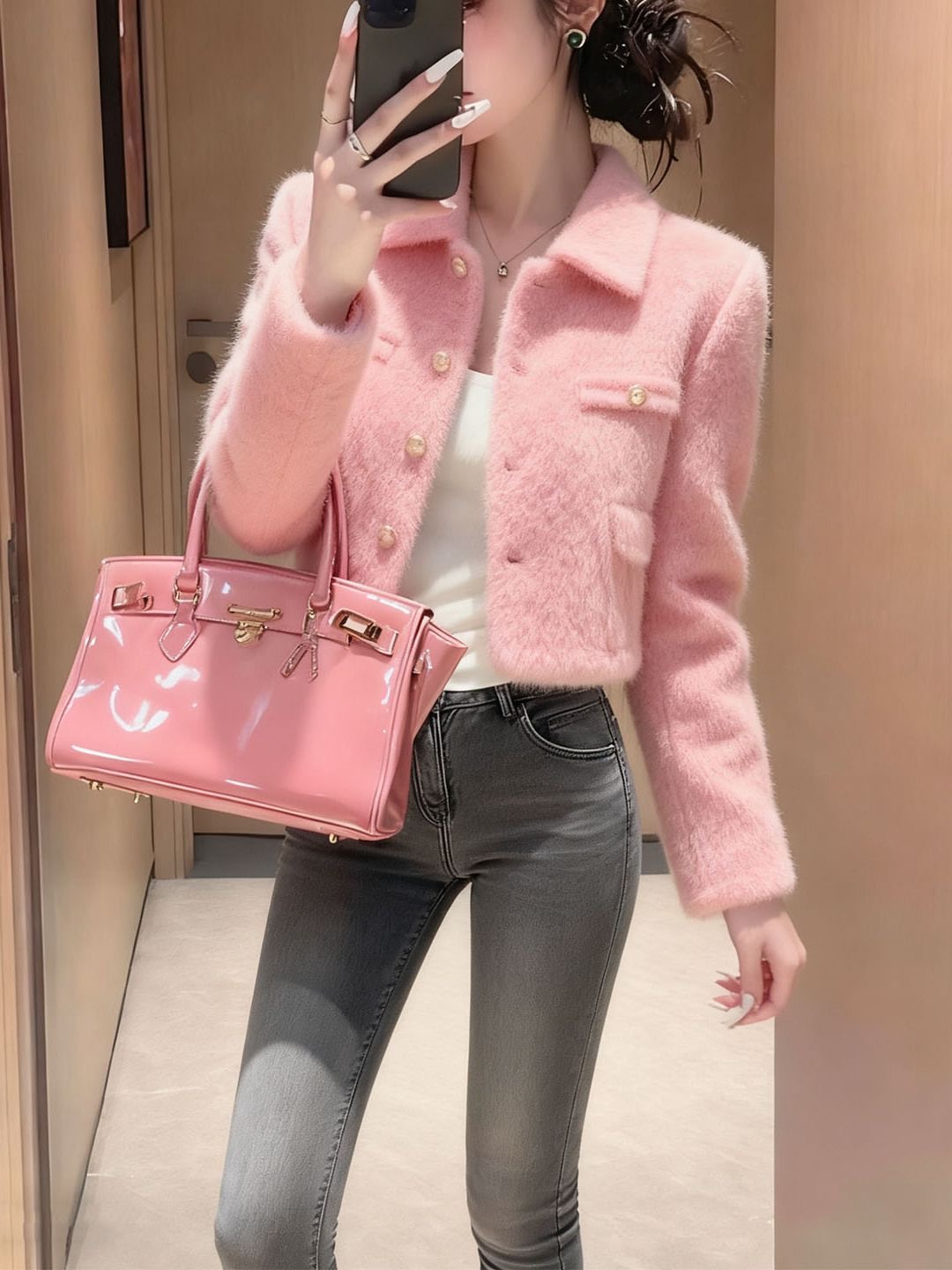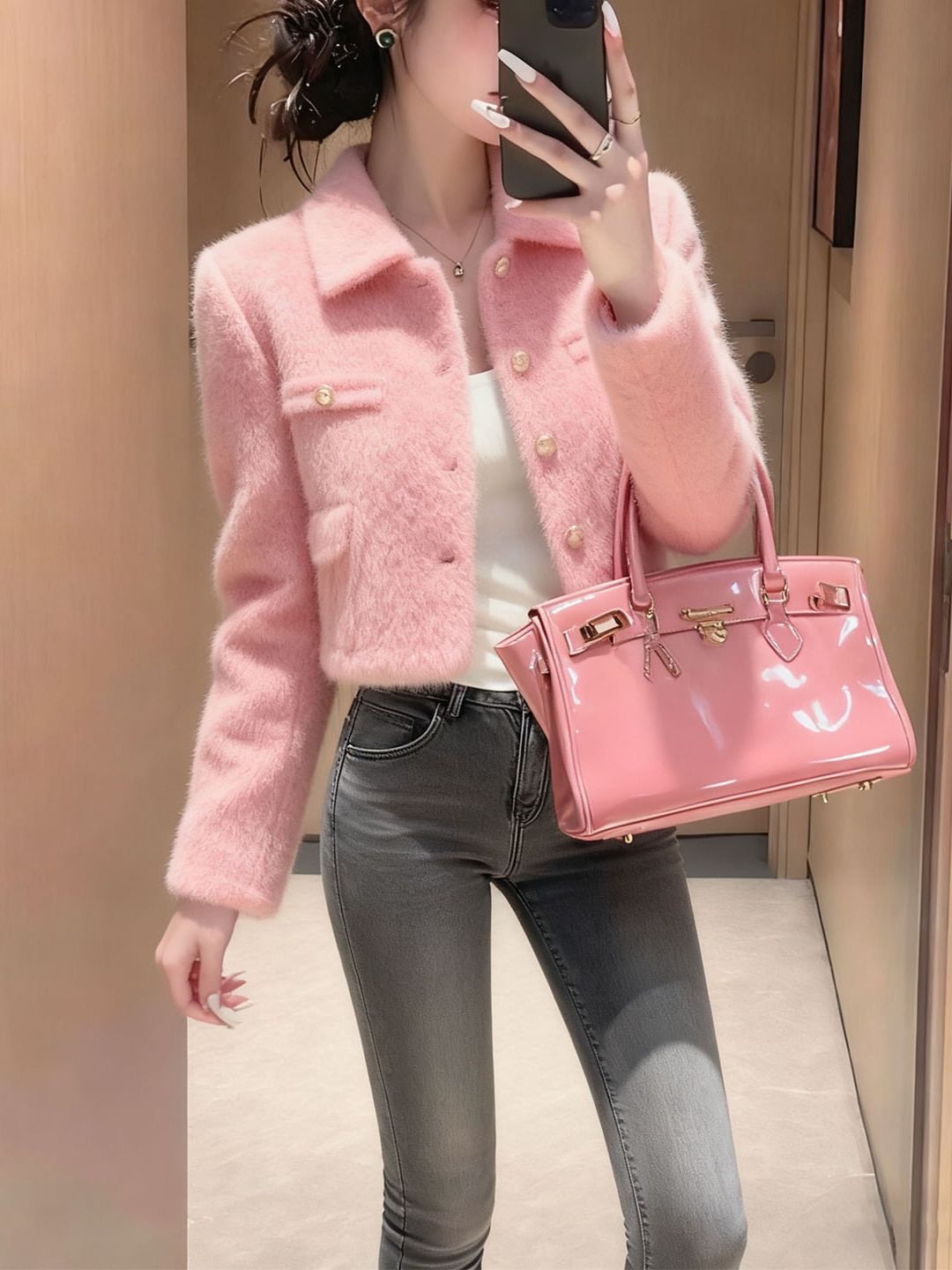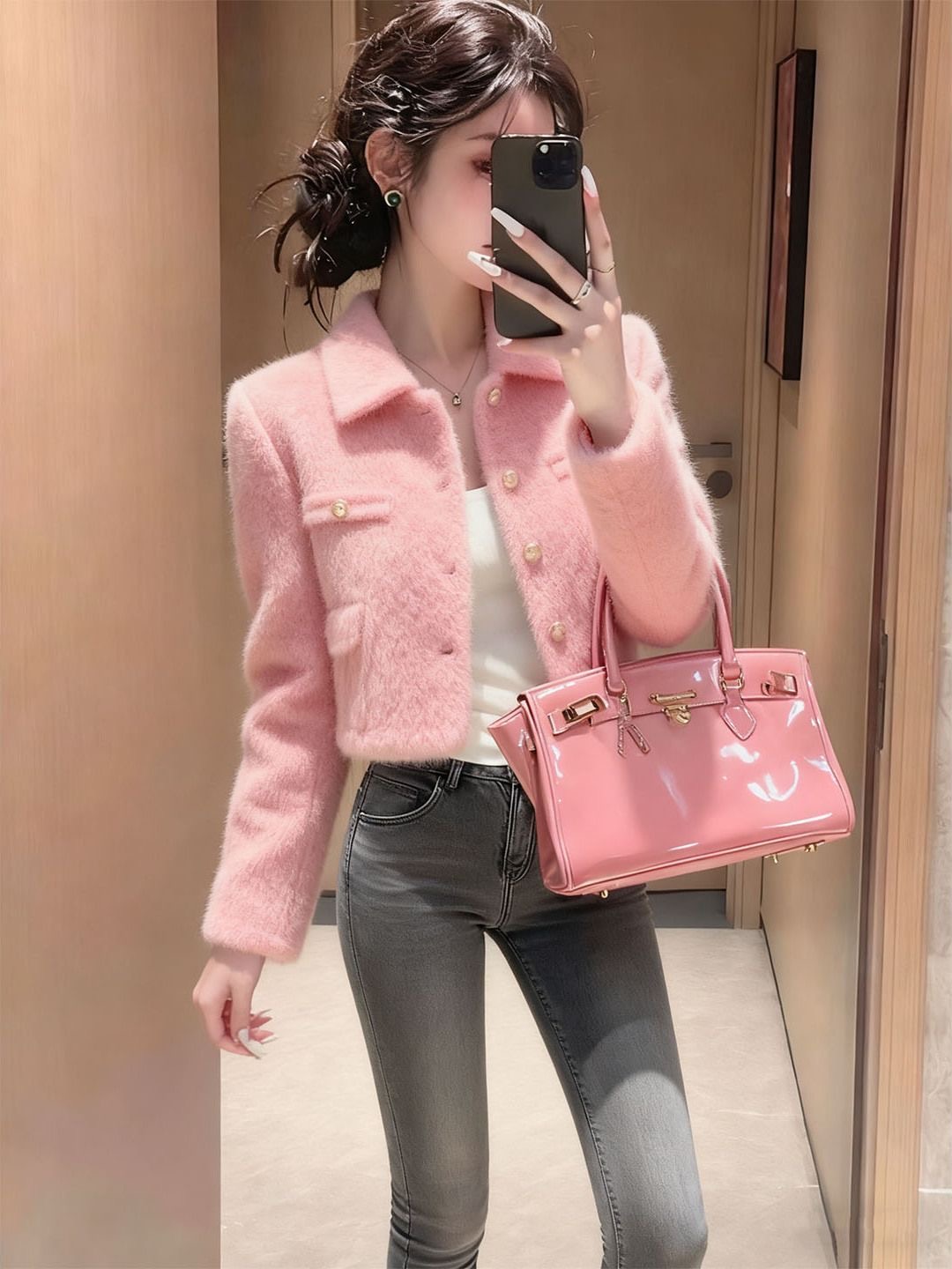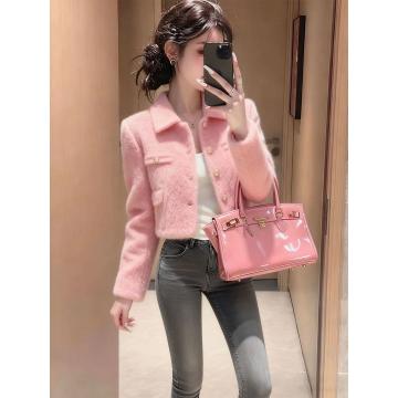 FA53769# 今年流行韩系淑女风粉色翻领短款外套女温柔氛围感小香风上衣秋冬 服裝批發女裝批發服飾貨源