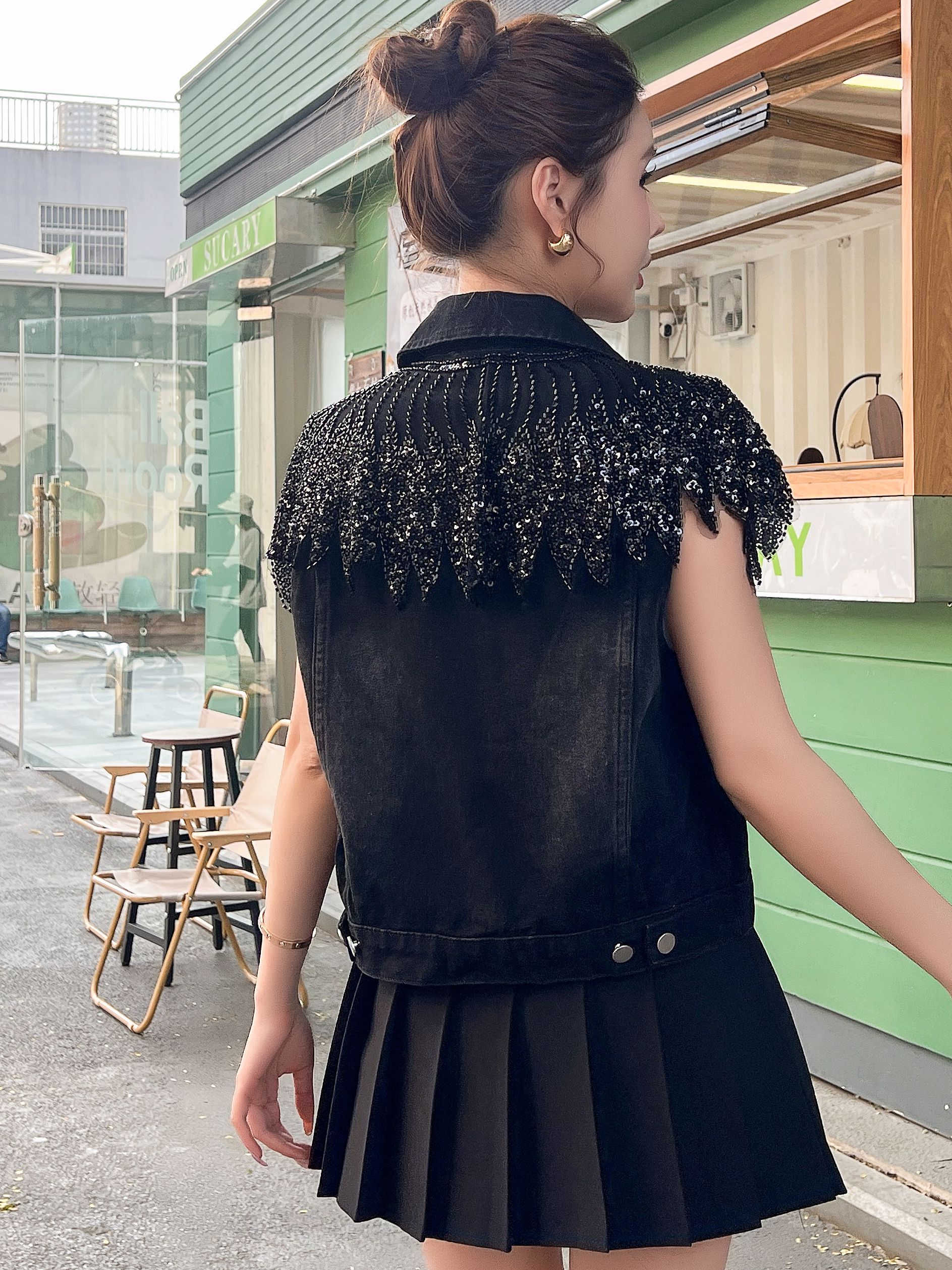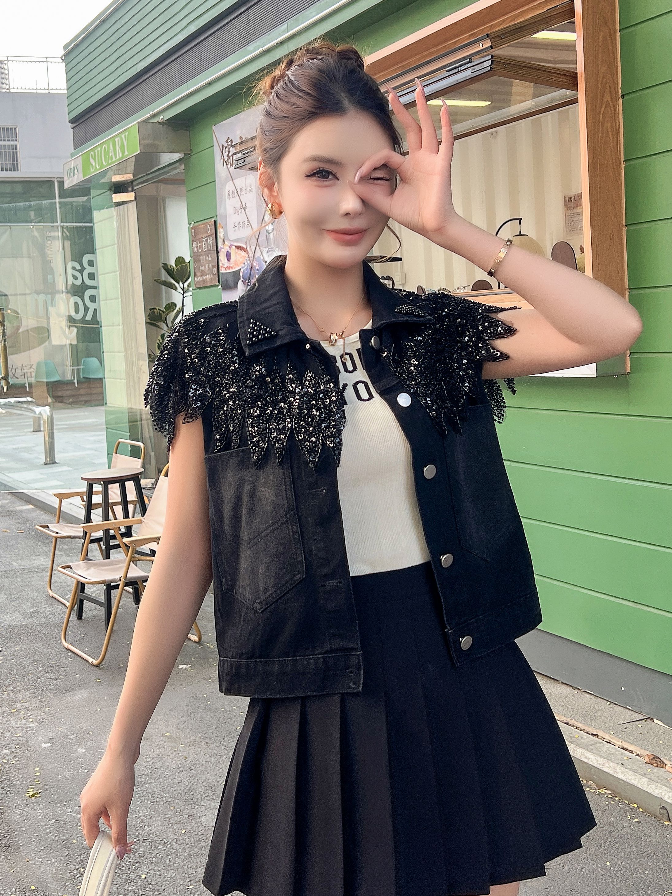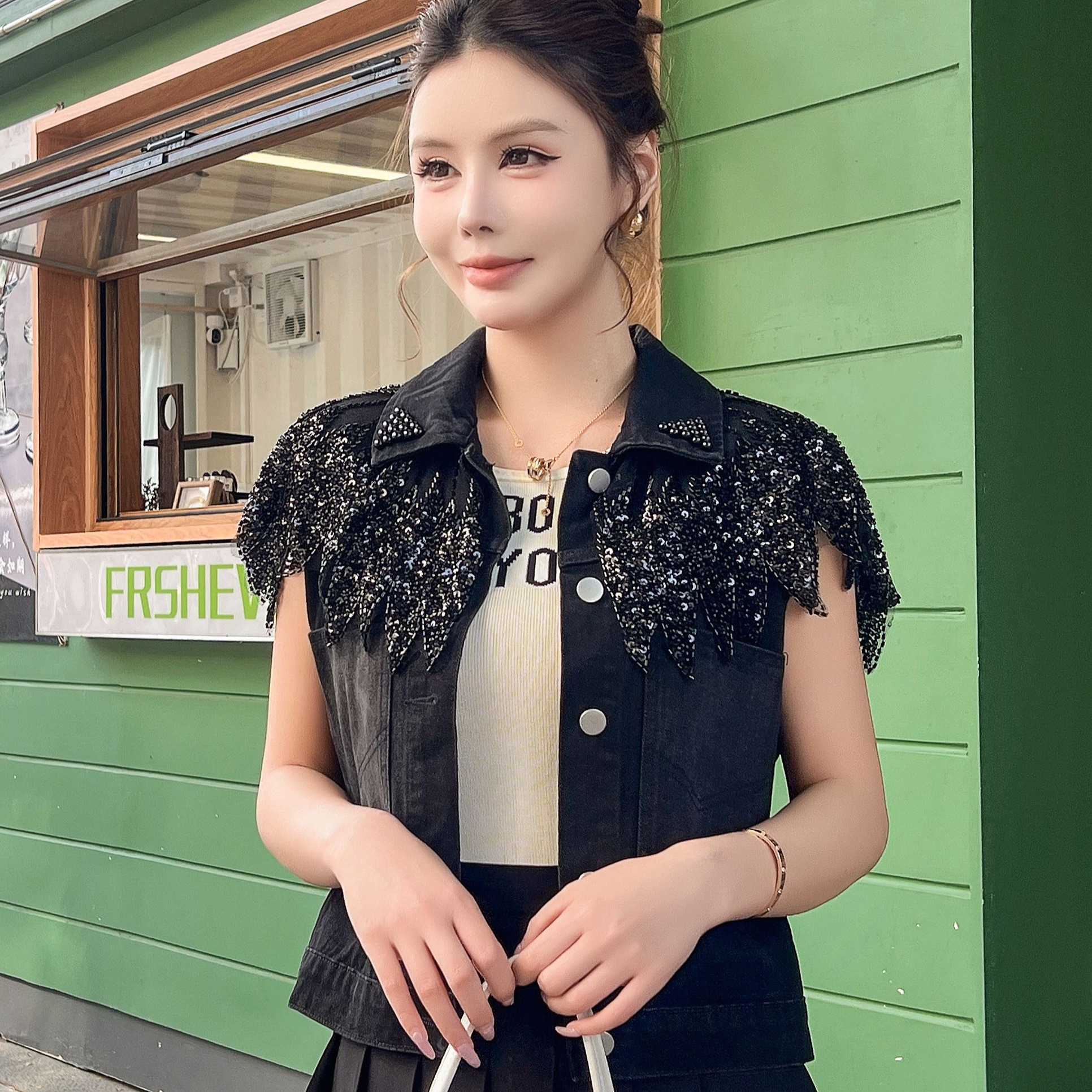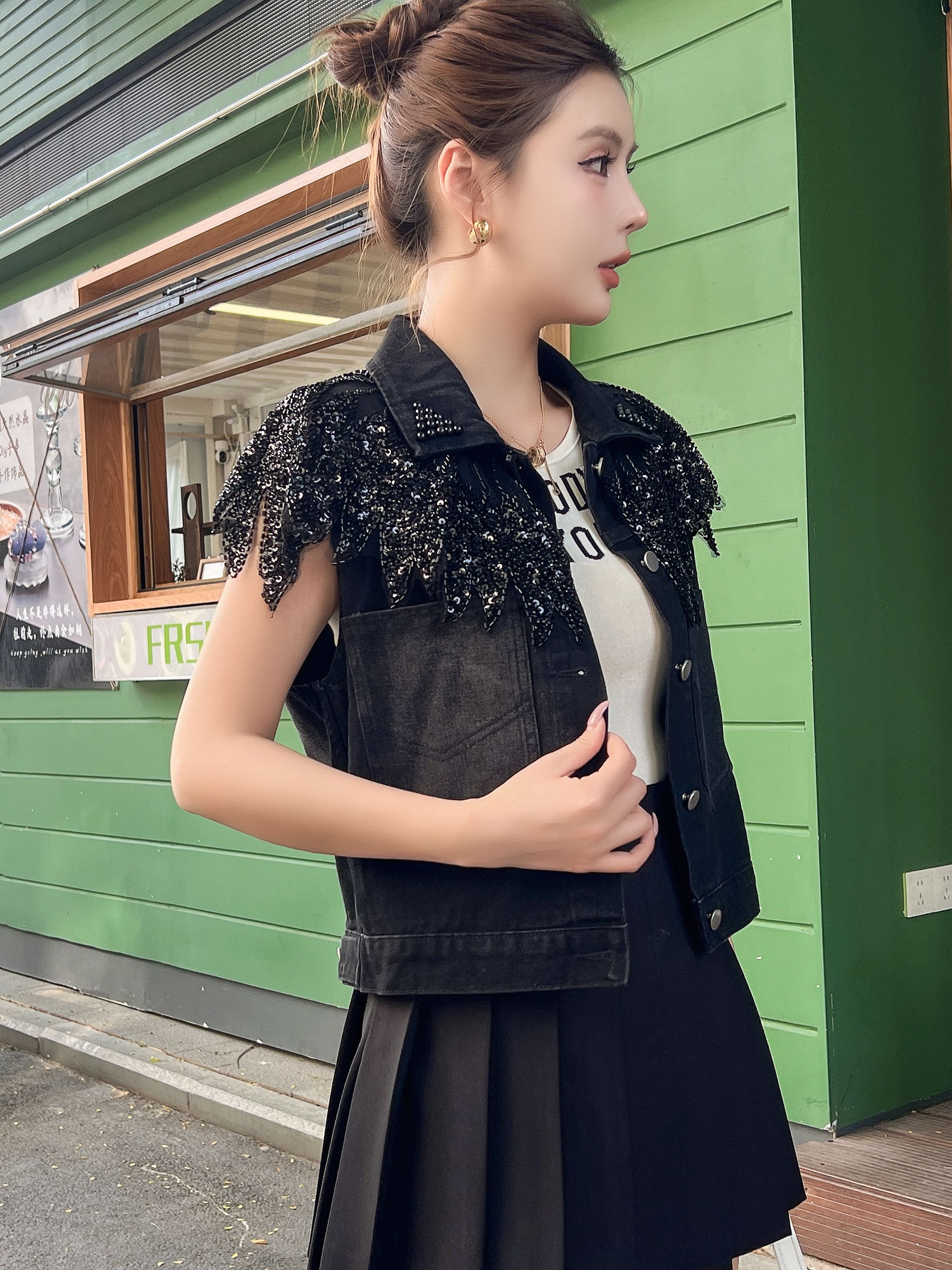 FA53782# 春夏爆款钉珠重工流苏牛仔短外套时尚绣花工艺肩花 服裝批發女裝批發服飾貨源