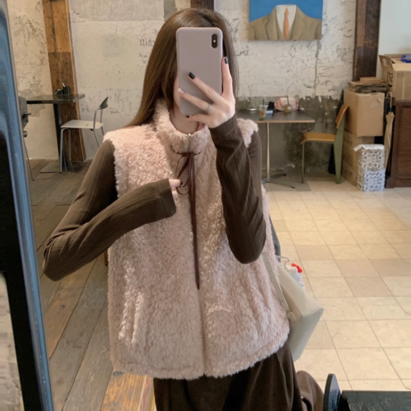 FA53841# 减龄少女粉色立领羊羔毛马甲外套女两面穿灯芯绒波点马夹 服裝批發女裝批發服飾貨源