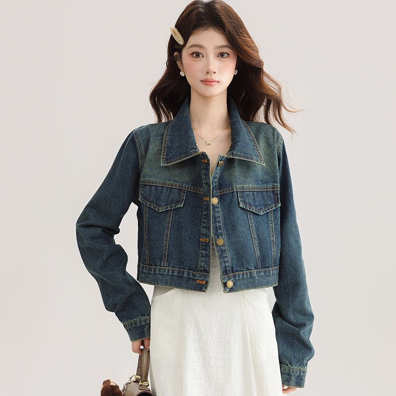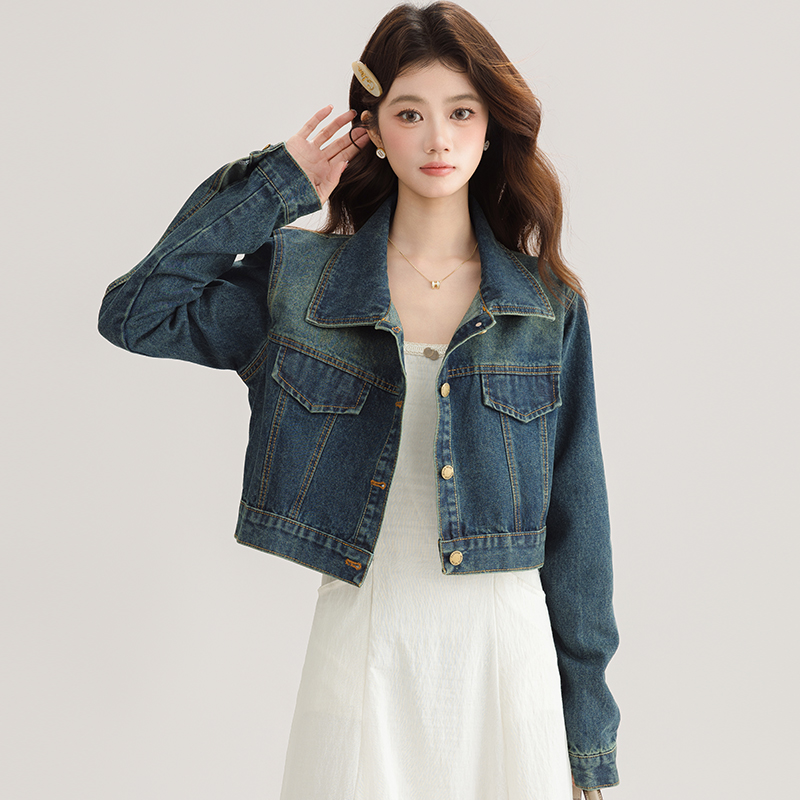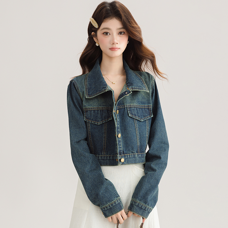 FA53999# 小个子短款牛仔外套女春秋季新款高级感复古翻领休闲上衣 服裝批發女裝批發服飾貨源