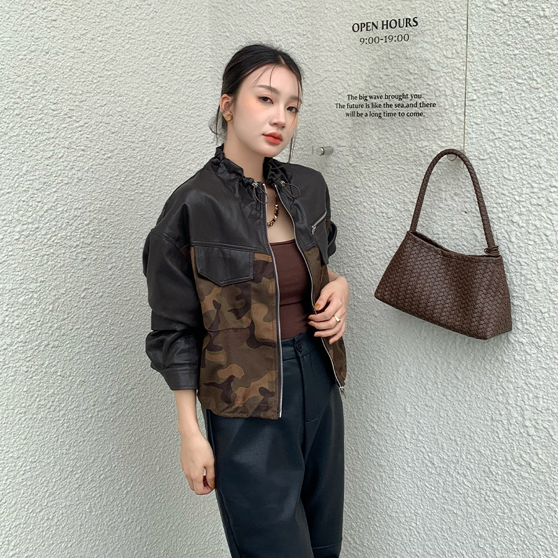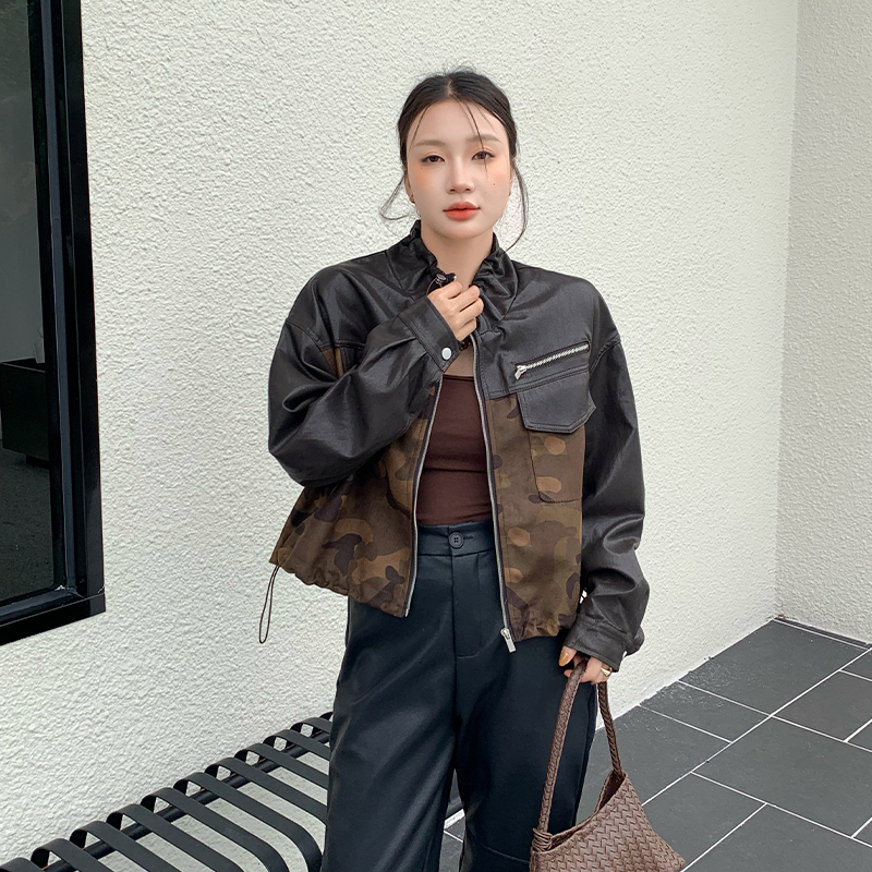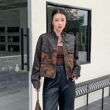 FA54182# 欧洲站设计感立领撞色拼皮迷彩鹿皮绒外套女秋季夹克上衣 服裝批發女裝批發服飾貨源