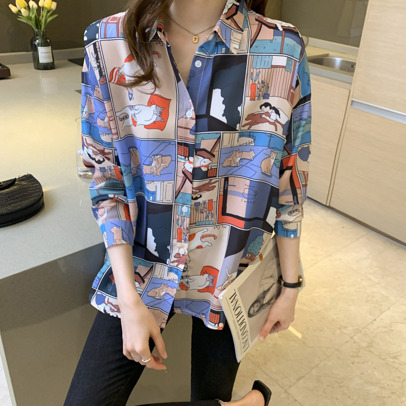 FA54290# 洋气休闲春季新款女装翻领卡通雪纺衫上衣开衫衬衫打底衫衬衣 服裝批發女裝批發服飾貨源